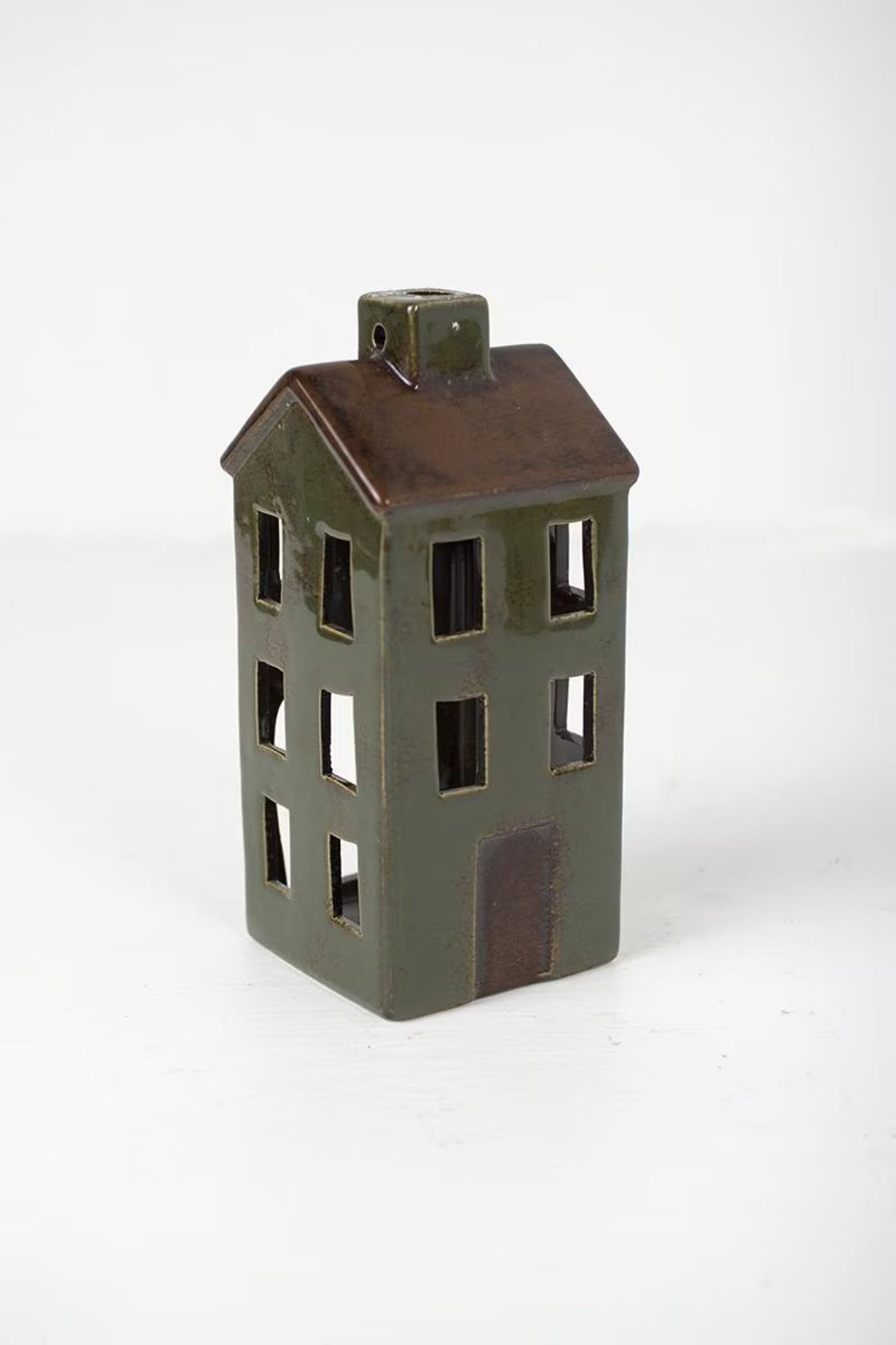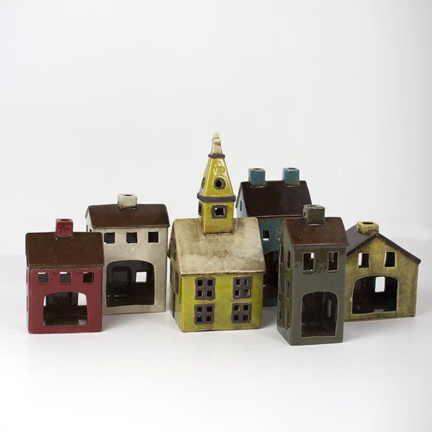 Create a cozy, storybook scene with this charming set of ceramic village luminaries. Featuring an assortment of colorful houses and a quaint chapel, each piece is designed with cut-out windows that softly glow when illuminated, bringing warmth and life to your space.With their hand-crafted look and rustic, slightly weathered finish, these mini homes add character and nostalgic charm to mantels, tabletops, or holiday displays. Arrange them together for a festive village feel or style individually throughout your home for a whimsical touch.