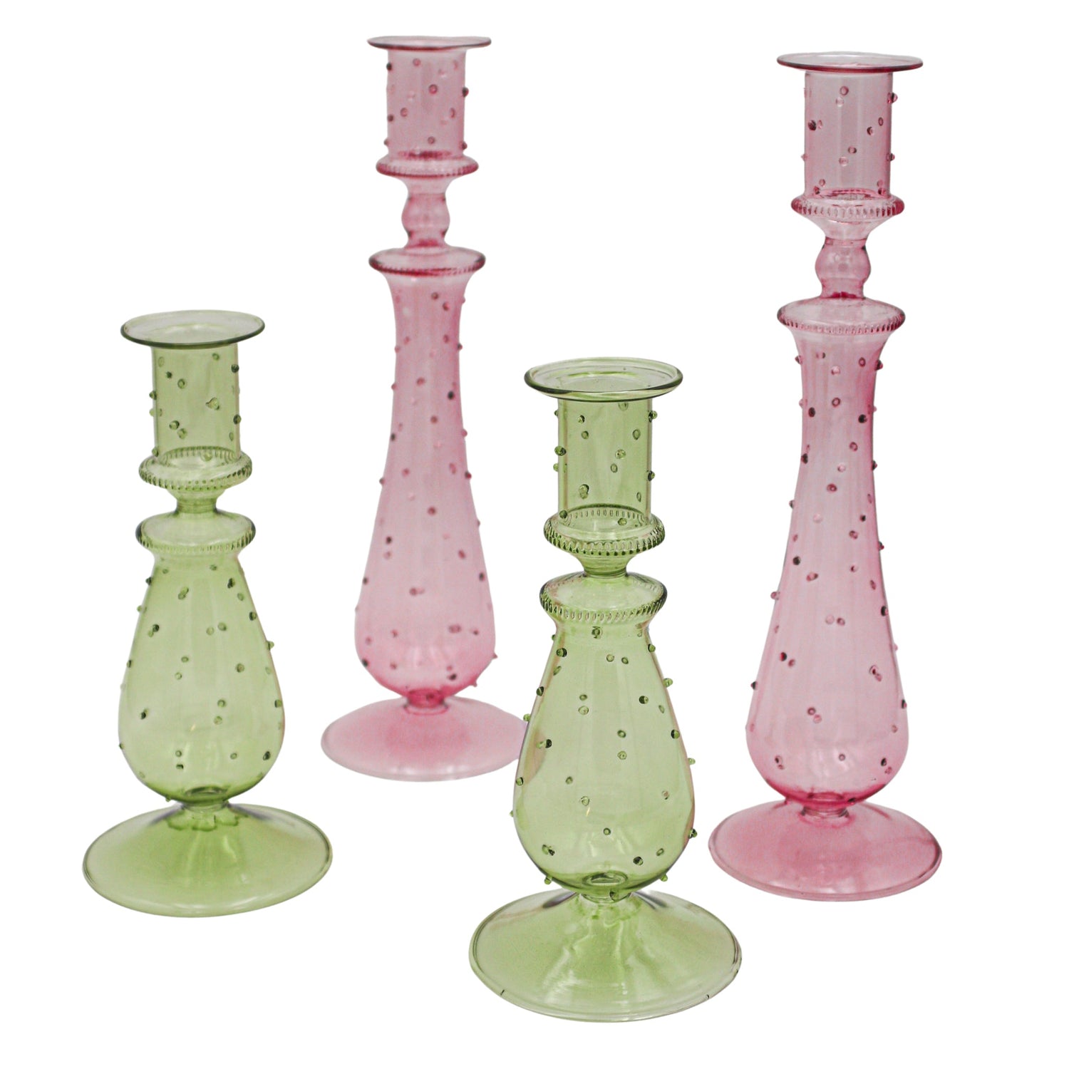A duo of olive hand-blown fluted candle holders with spotted details.
