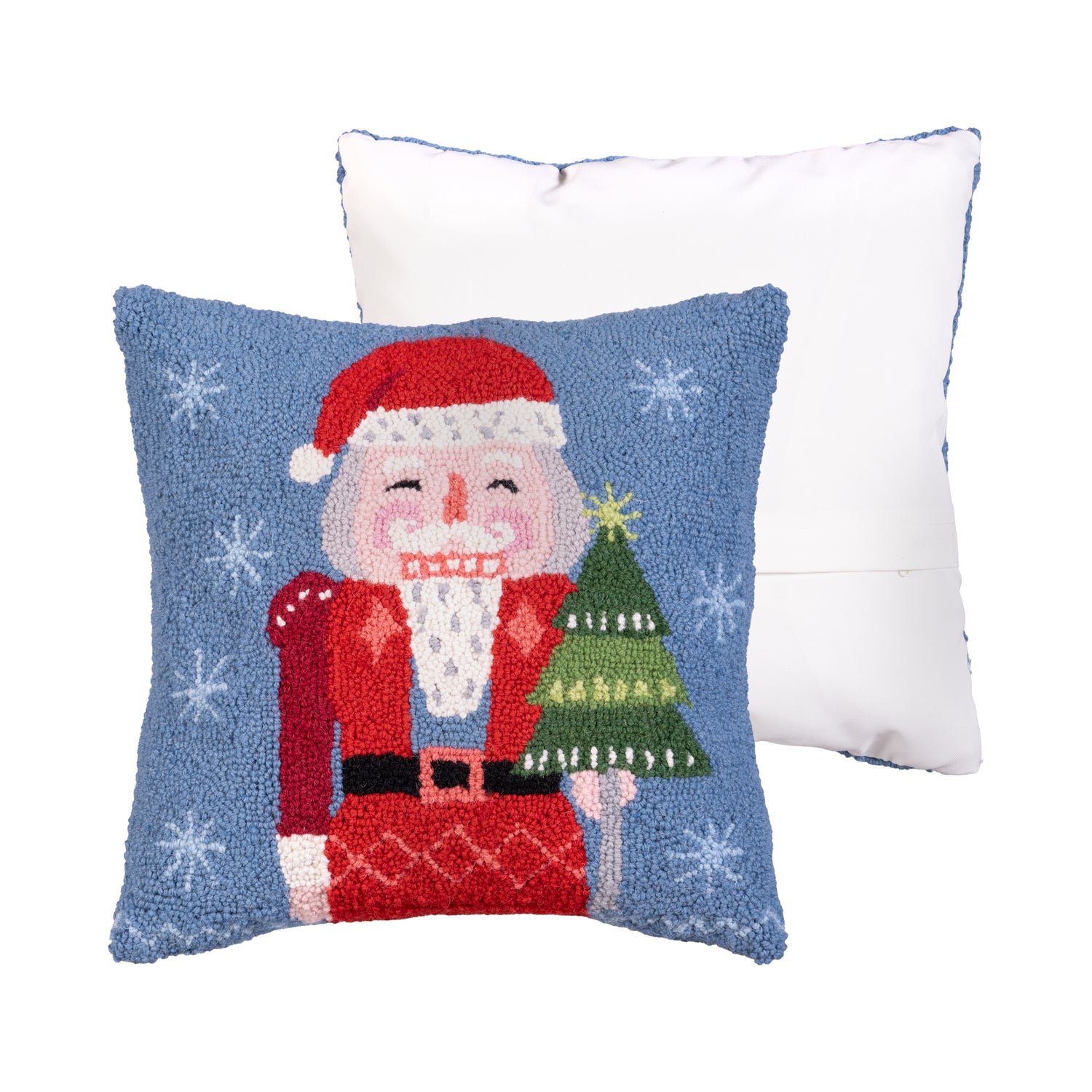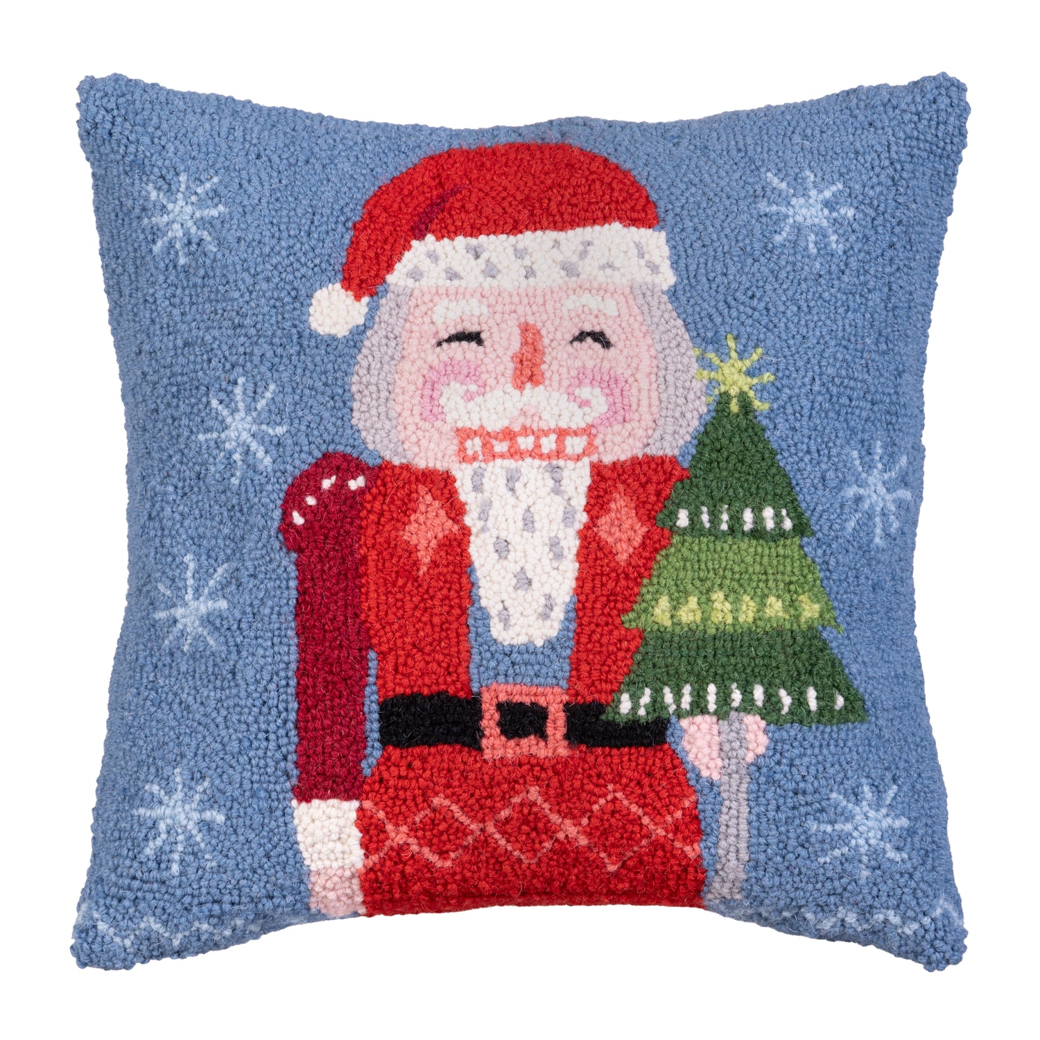 This charming holiday accent features a delightfully whimsical nutcracker dressed in classic red with a green Christmas tree in hand, all set against a snowy blue backdrop. Made with traditional hand-hooked craftsmanship, the textured poly-blend front offers cozy charm and heirloom quality that celebrates the magic of the season.