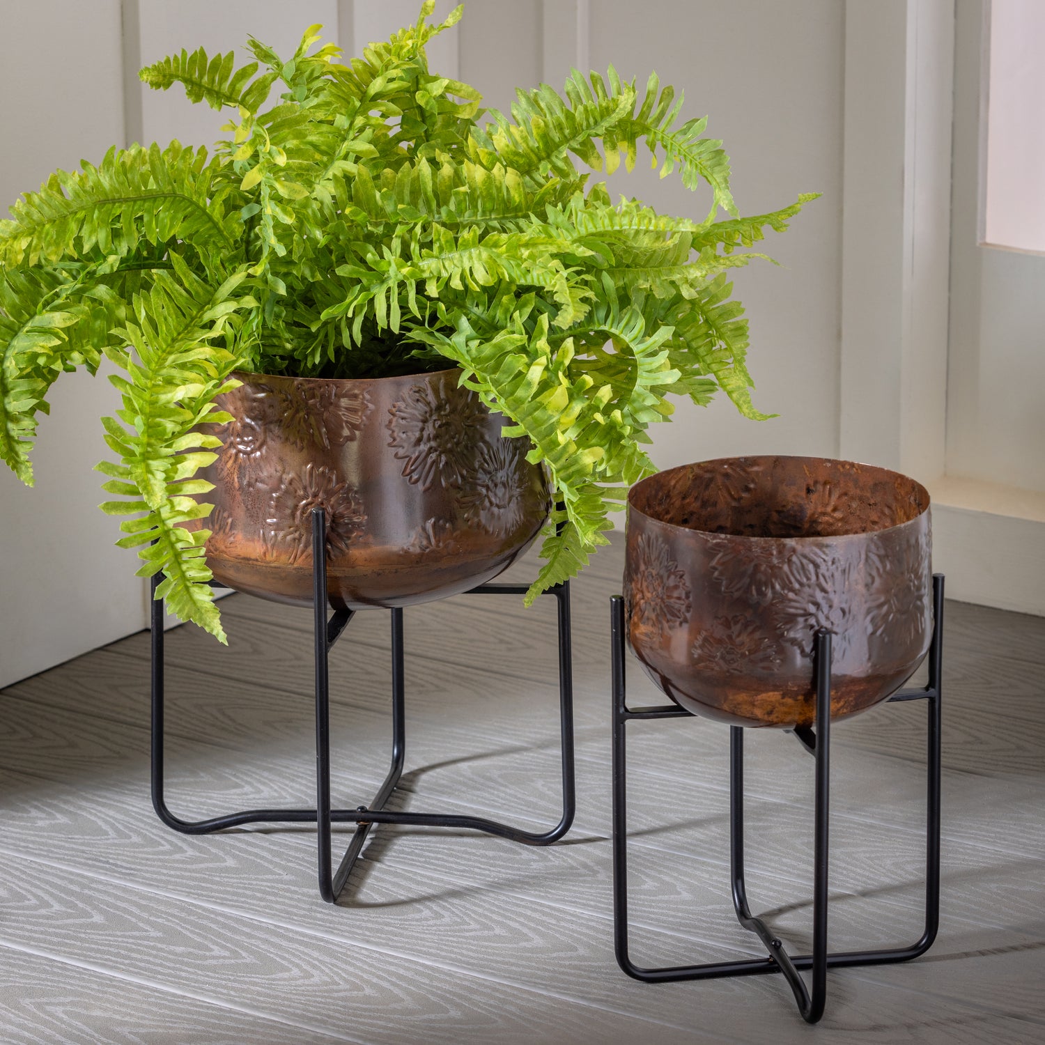 Petal & Plow Planter, Embossed Metal Sunflower with Stand, Set of 2