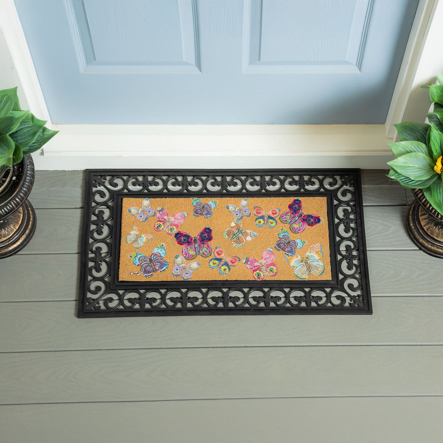 This Flocked Coir Sassafras Switch Mat adds coastal character to entryways with a graceful butterflies motif. At 22 x 10 inches, the insert nests neatly into switch doormat bases and standard boot trays, serving as a compact welcome mat that captures dirt before it enters the home. The flocked coir surface delivers a durable scraping texture suited to sandy or everyday thresholds, bringing function and nature-inspired style to doorway décor. Built for routine foot traffic and easy care, this doormat insert helps keep busy thresholds tidy while reinforcing a cohesive coastal look.