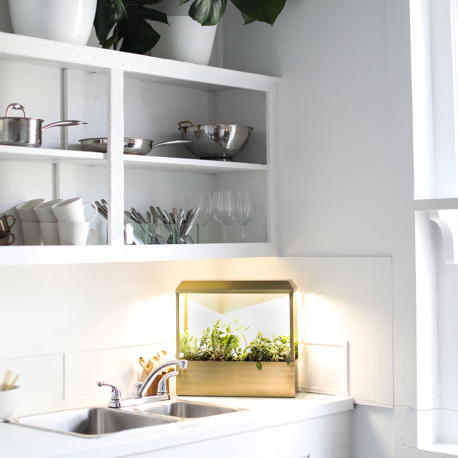 Grow fresh herbs and plants anywhere in your home, no natural light required. Made of high quality metal with a watertight planter, Growhouse features full-spectrum LED grow light that emits a warm light that doesn't feel harsh in your living space. Smart App allows for custom scheduling and brightness. Choose from Antiqued Brass or Matte Black finish. Plants will thrive and make a statement.