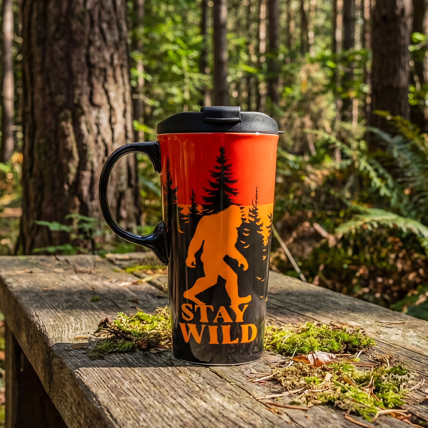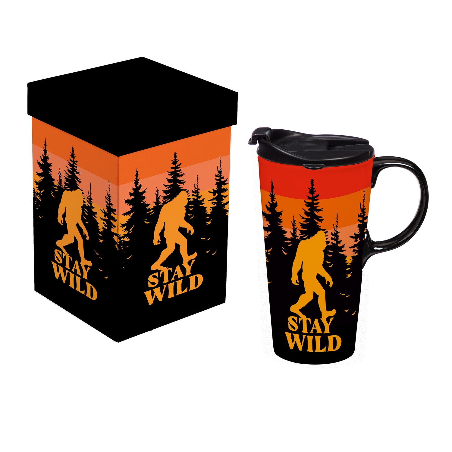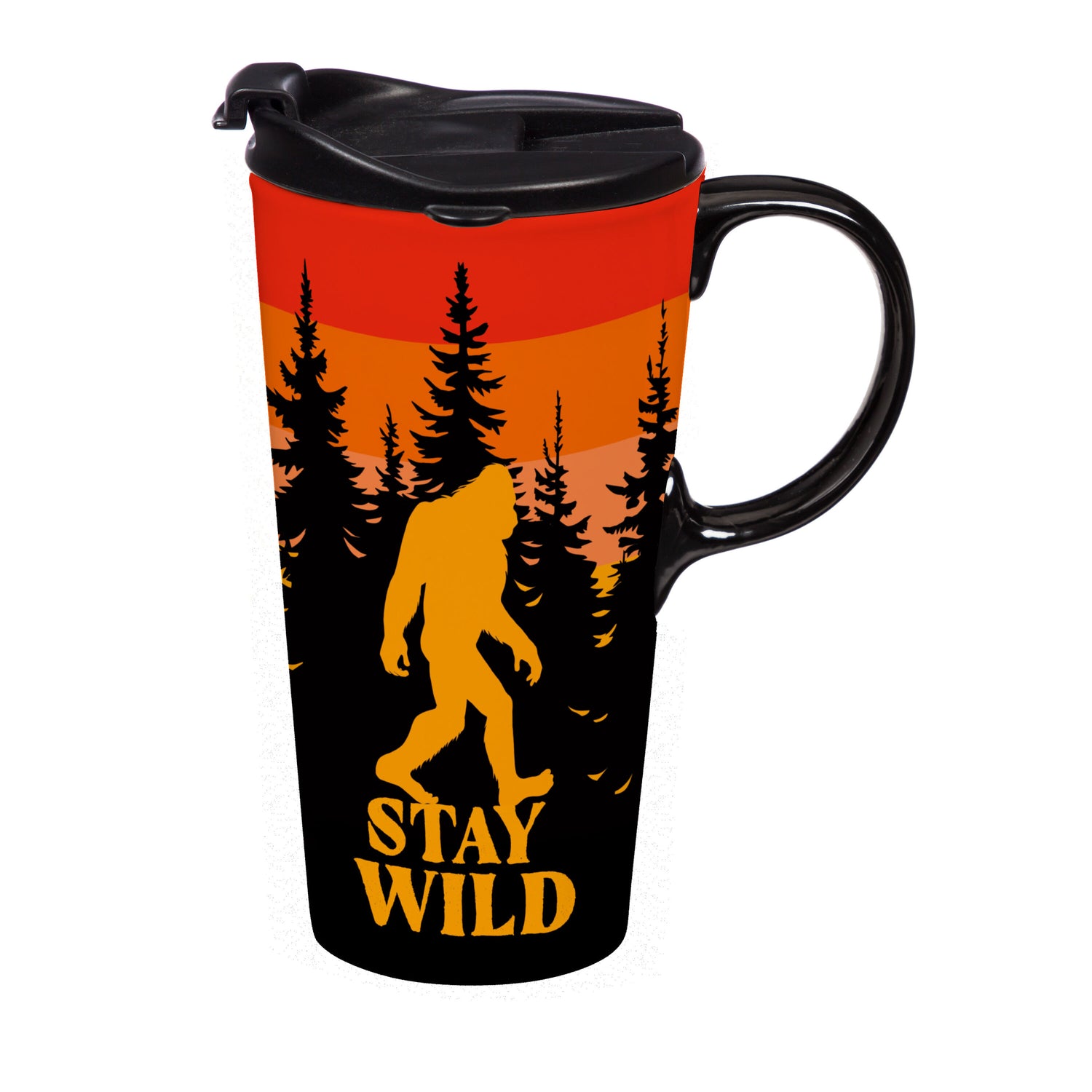 Bring a touch of the outdoors to the daily coffee routine with this Perfect Cup ceramic travel mug, featuring a striking Bigfoot at Sunset design in black, orange, and yellow hues. The 17-ounce capacity offers generous room for hot beverages, while the sturdy ceramic build delivers a comfortable, home-mug feel on the go. A three-ring silicone lid locks neatly into the cup’s molded grooves to help prevent spills in transit, and the mug is both microwave safe for quick reheats and top-rack dishwasher safe for easy cleanup. Complete with a coordinating gift box, this travel-friendly piece offers instant shelf appeal and ready-to-gift convenience for nature lovers and Bigfoot fans alike.