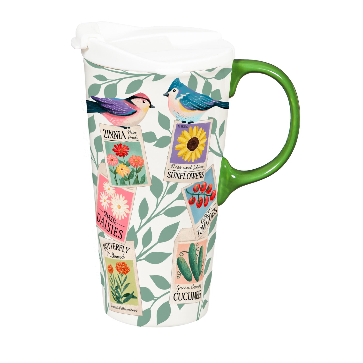 Bring cottage-garden charm to everyday routines with this Cottage Garden Perfect Cup, a 17oz ceramic mug designed for on-the-go comfort and display-worthy style. Wrapped in colorful birds and floral artwork with a fresh green handle, this travel mug pairs a white sip-through lid with a three-ring silicone seal that locks into molded grooves for added security during commutes or errands. Top-rack dishwasher safe and microwave safe for quick cleanups and warm-ups, it balances practicality with a nature-inspired aesthetic. Arriving in a coordinating gift box, this coffee tumbler is an easy, ready-to-merchandise option with strong gift appeal for spring, garden, and birding collections.