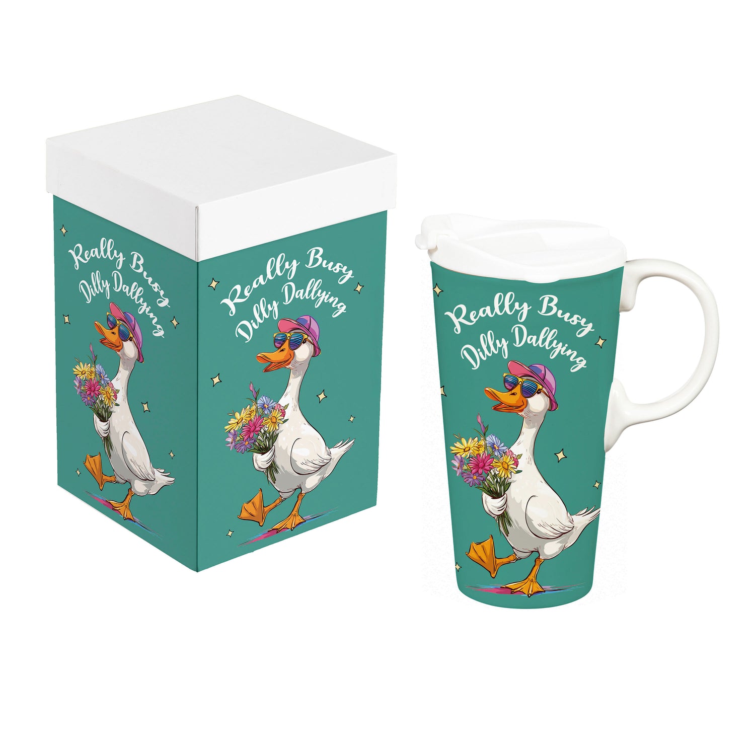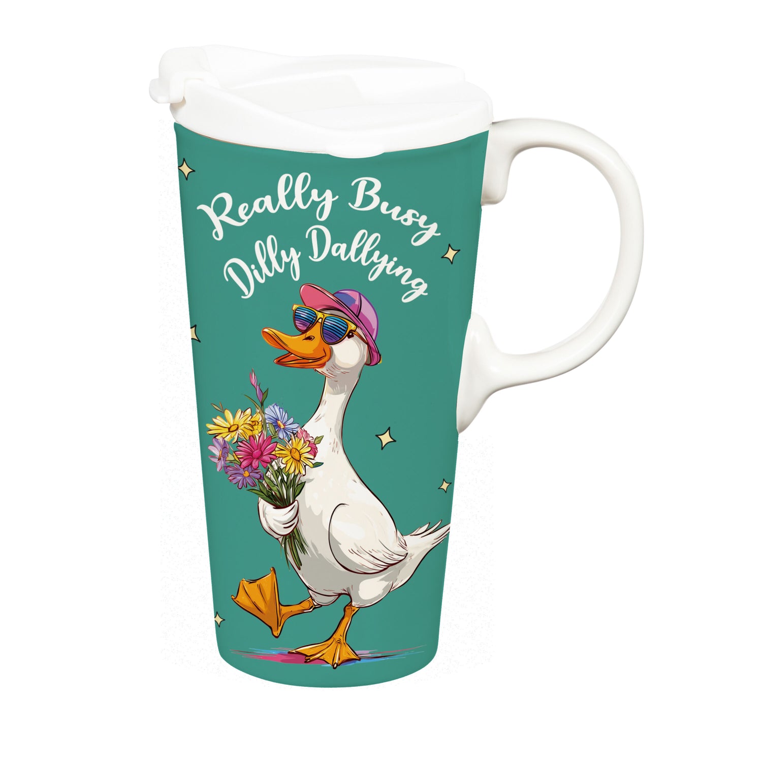 - 17 oz ceramic travel cup with goose artwork and “Really Busy Dilly Dallying” text