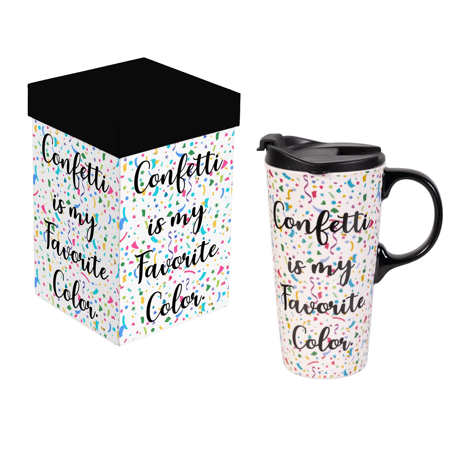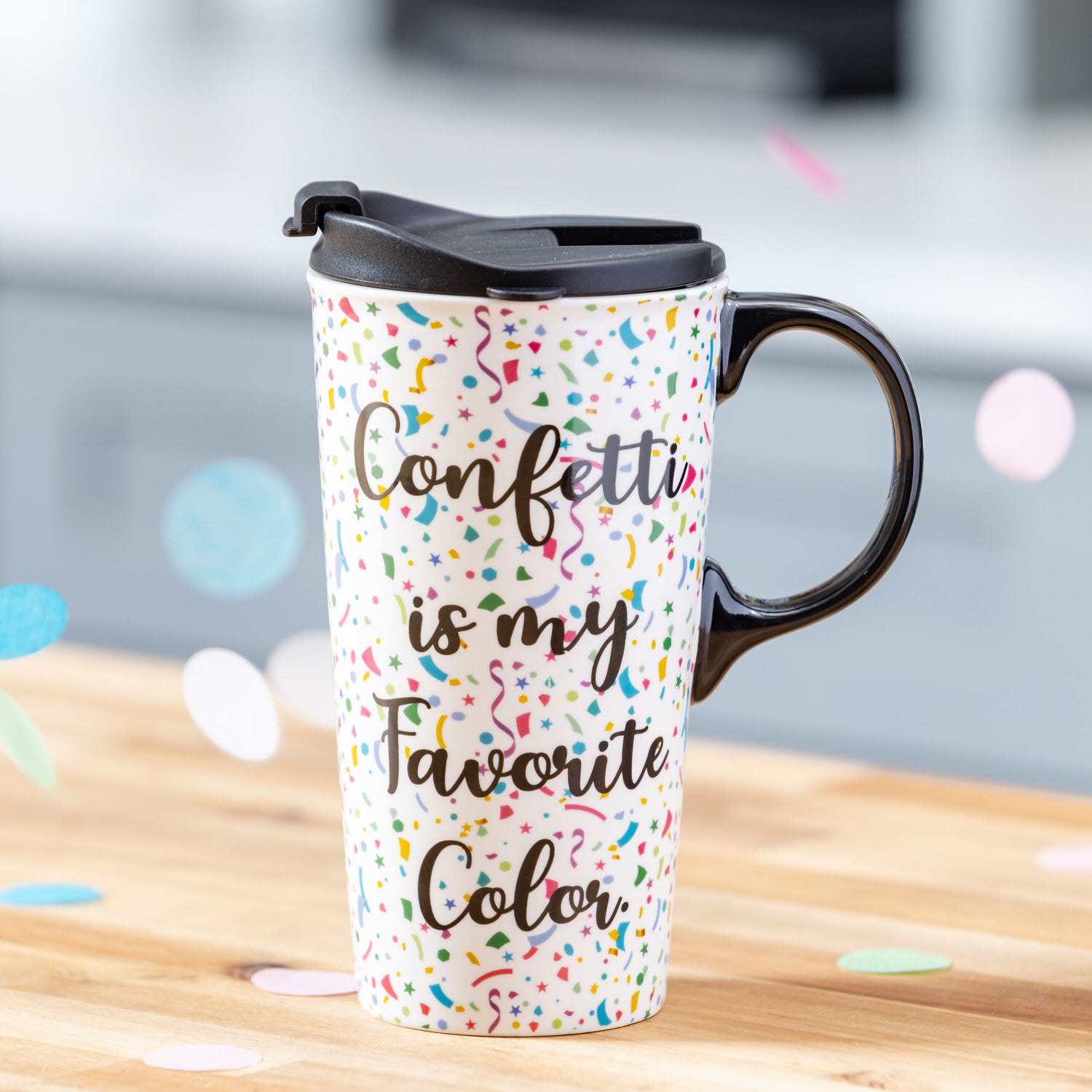- Celebrate everyday wins and milestone moments with this Perfect Cup This Calls For Cake Travel Cup, a 17 oz ceramic travel mug that pairs cheerful confetti artwork and the sentiment “Confetti is my Favorite Color” with practical, commuter-ready function. Crafted from sturdy stoneware with a flip-top plastic lid, its three-ring silicone seal locks into the cup’s molded grooves for added security on the move, while the slim profile fits most vehicle cup holders to simplify trips from car to desk. The microwave-safe cup and top-rack dishwasher-safe care keep routines easy, and the coordinating gift box supports effortless gifting for birthdays, congratulations, or everyday surprises—ideal for shoppers seeking a colorful travel mug or a stoneware coffee mug that brings joy to every sip.