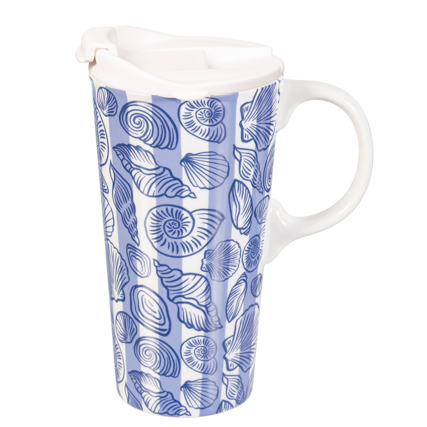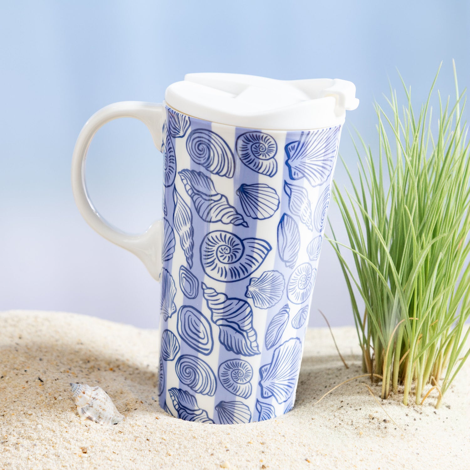 • 17-ounce ceramic travel cup with blue and white shell artwork for coastal-inspired appeal