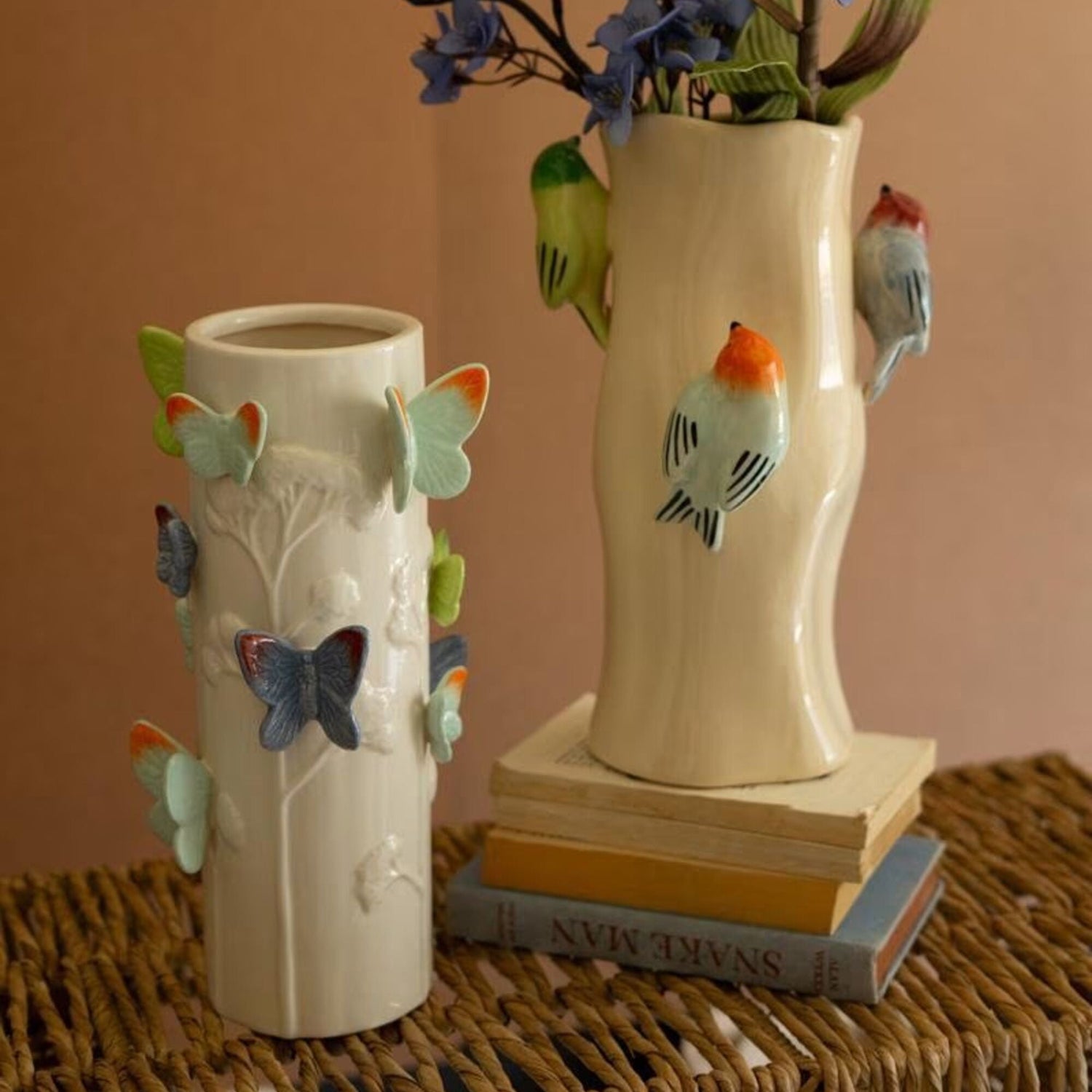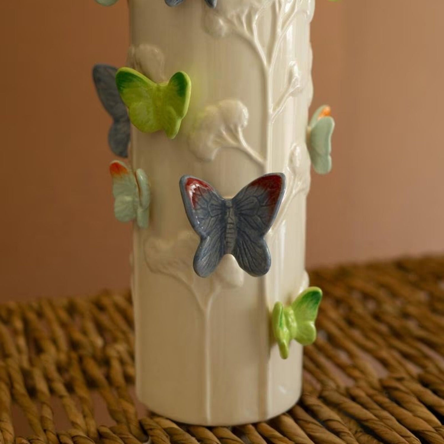 - Tall ceramic vase with dimensional butterfly accents
