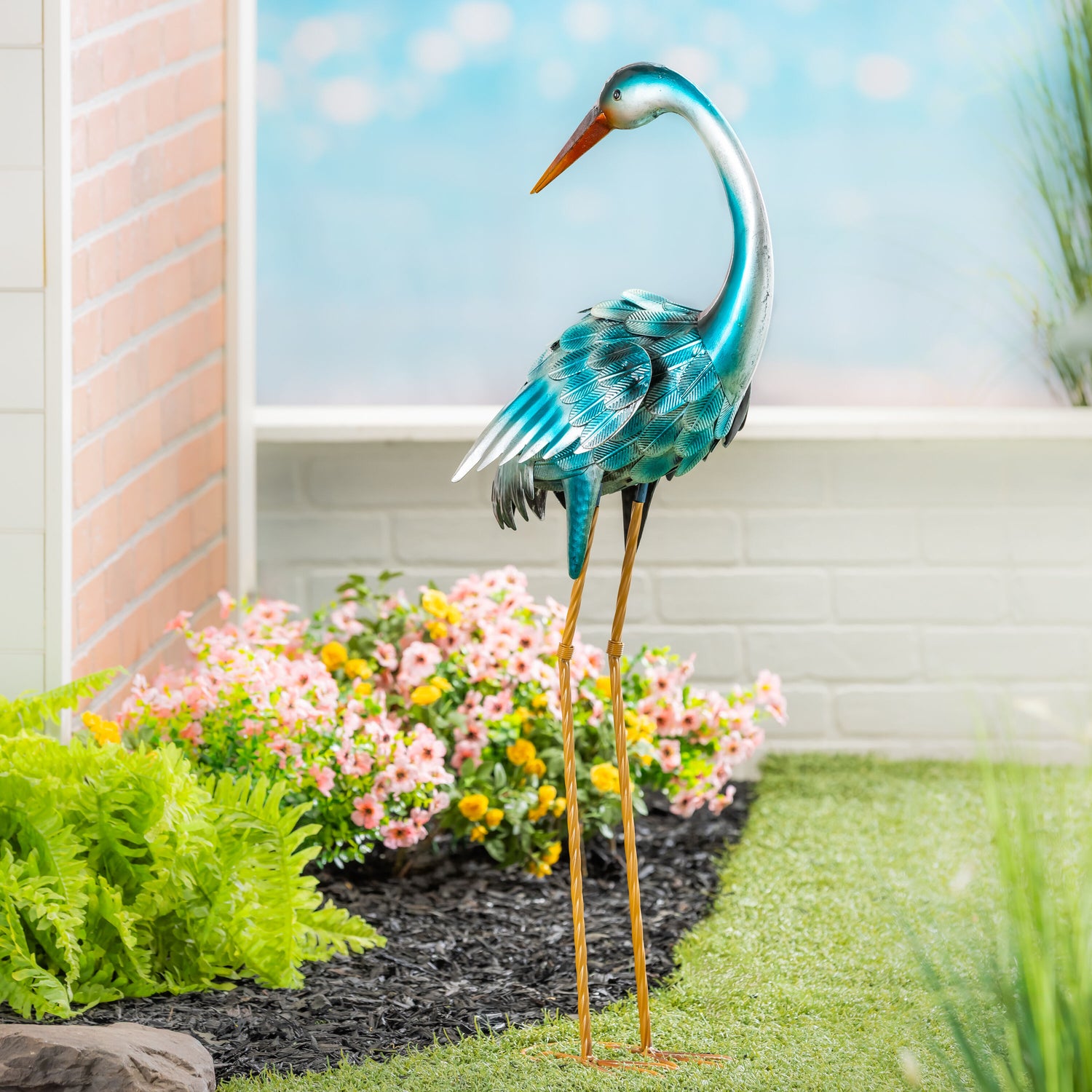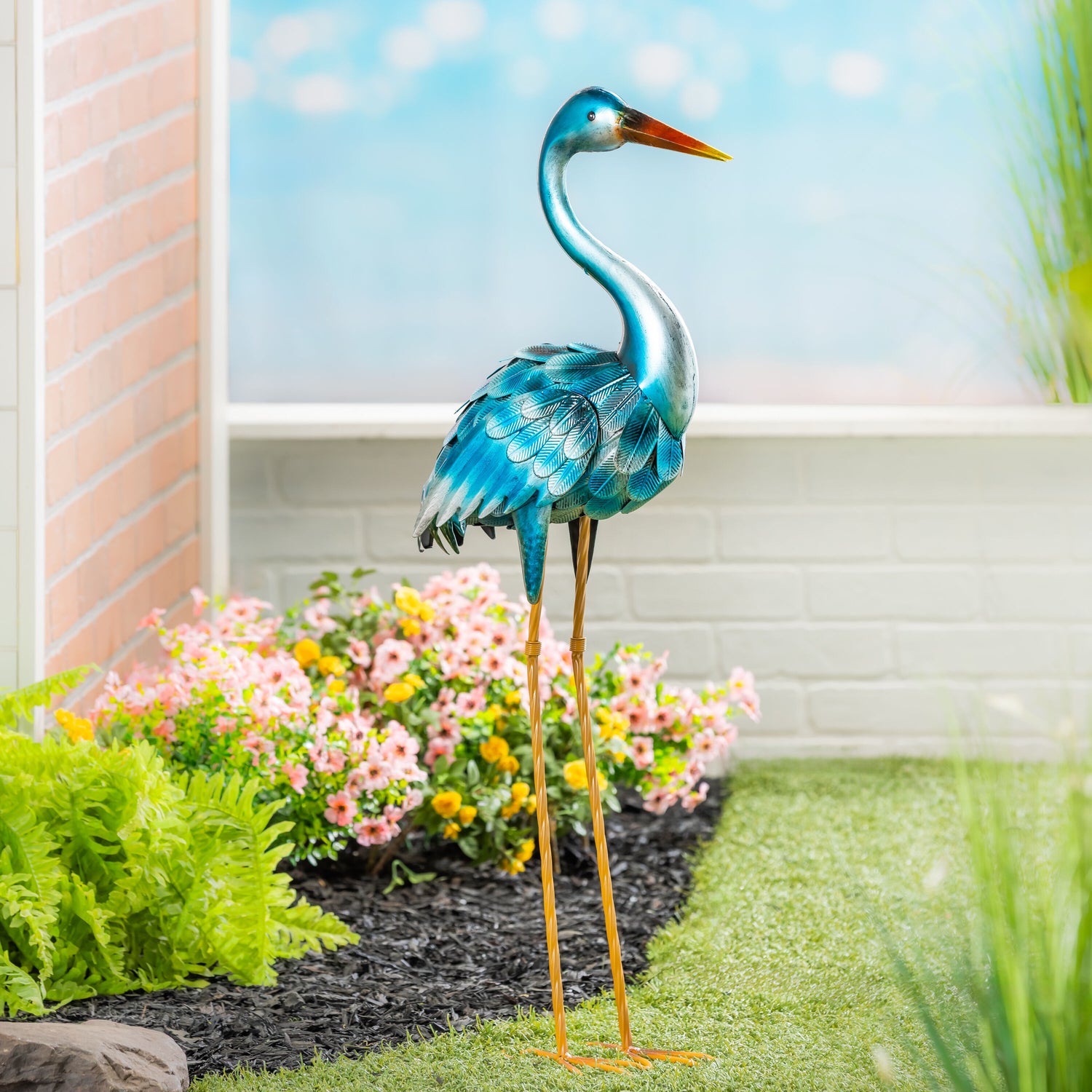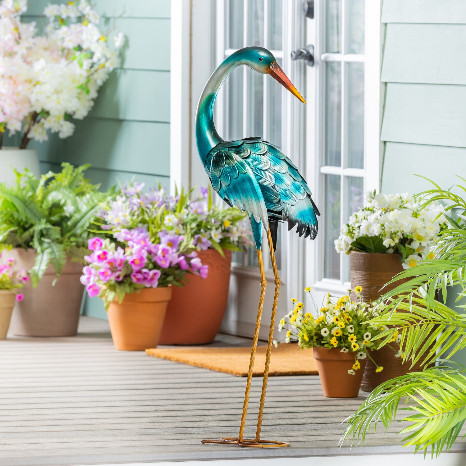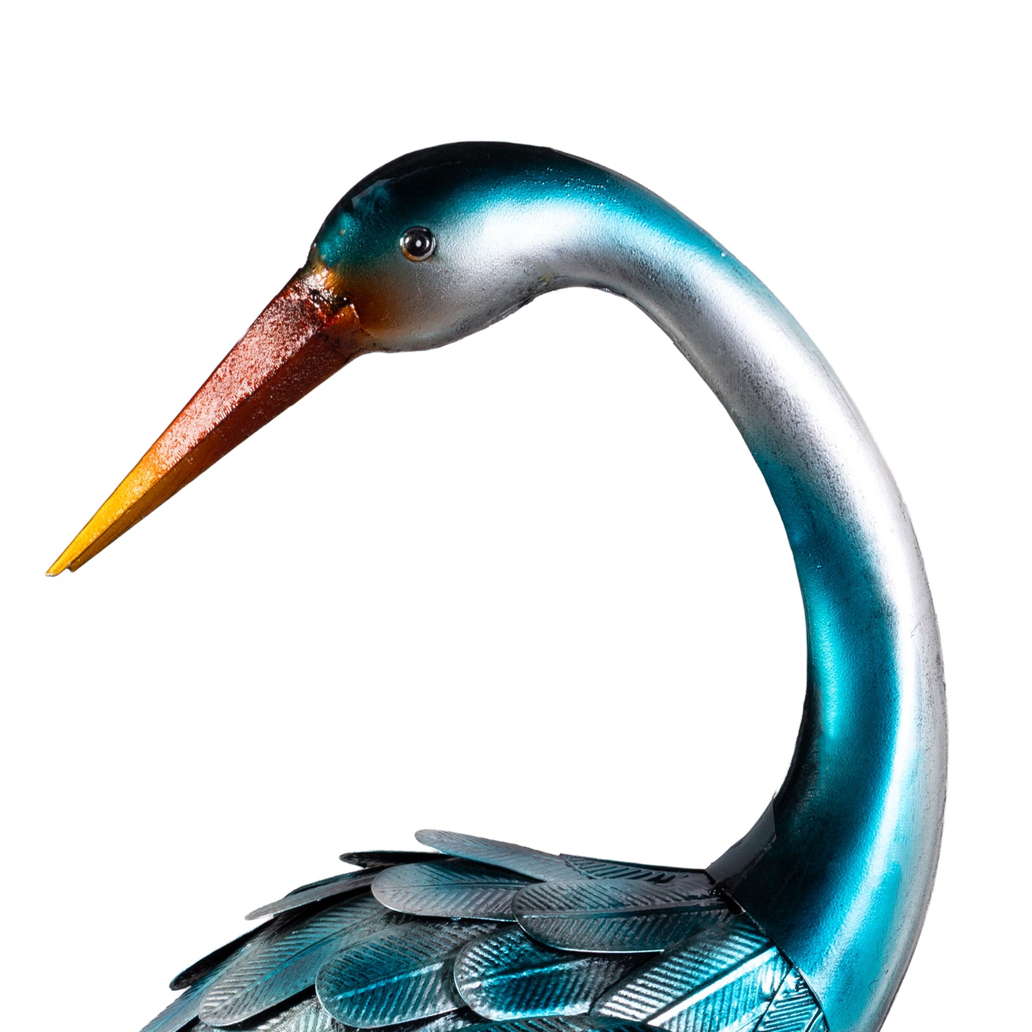 Each heron is hand-painted in shimmering shades of teal, turquoise, and indigo with delicately embossed feather detailing and graceful silhouettes. Whether standing by a pond, nestled in a flower bed, or flanking a walkway, this stunning pair adds serene presence and sculptural charm to your landscape.