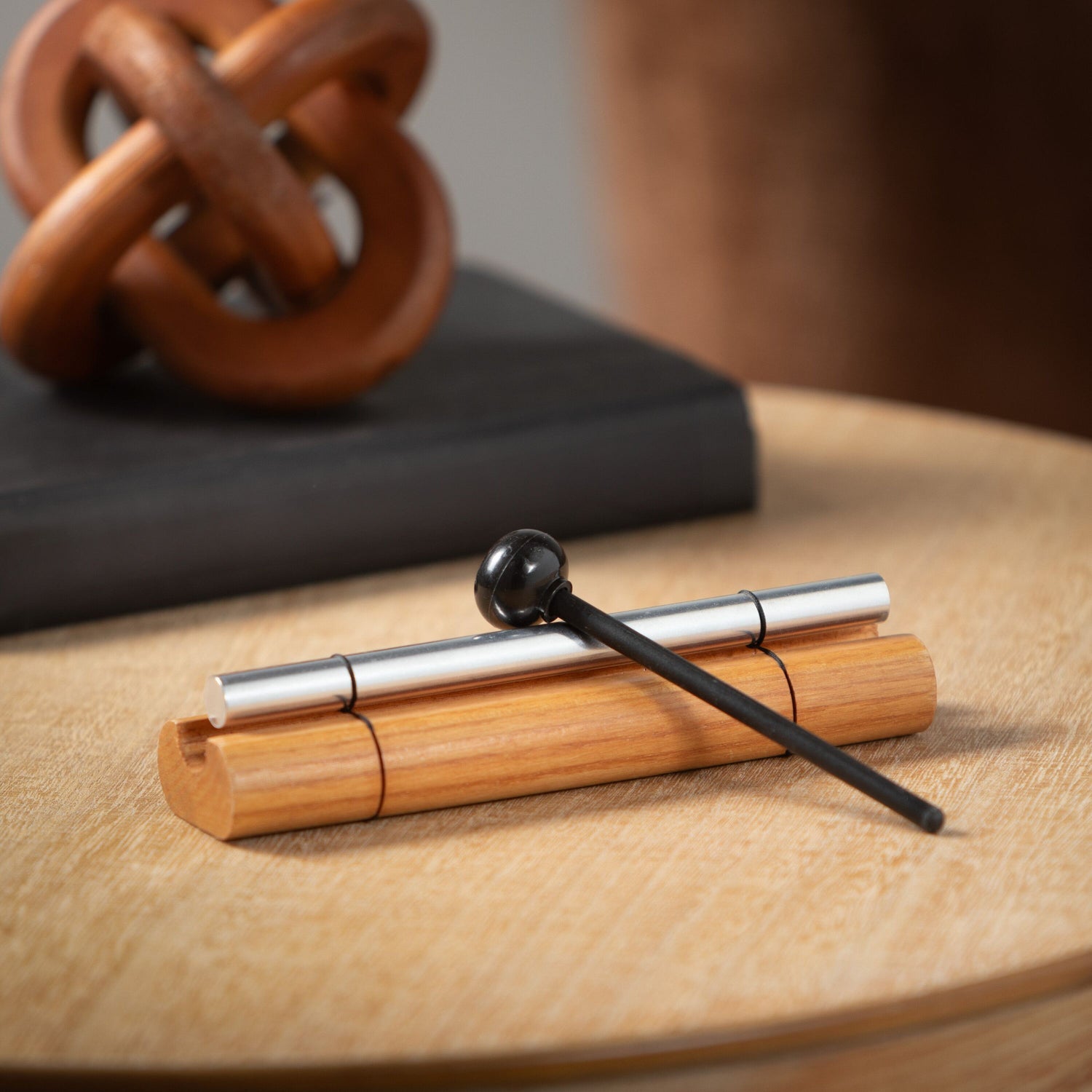 This larger Zenergy Chime produces a deeper, richer, sustaining tone that aids meditation. We live in a vast ocean of sound. But what is the sound made by a single drop of water? Just a gentle tap with the mallet and the Zenergy Chime emits a powerful tone of singular beauty that lasts and lasts. Sounds like this are often used in meditation and healing, because they help us to focus and redirect our attention to the sounds within. The resonating sound not only calms and refocuses the individual, but can also focus a group. As such, it's an effective way to start a class, meeting, yoga practice, or call guests to dinner. For best results, play the Zenergy Chime quietly, being careful not to dampen the sound by letting the mallet rest on the rod after striking it. Then take a deep breath and listen. Relax. Refocus. Reenergize. Comes with a mallet. This Zenergy Chime includes a keyhole slot on the back so it can be installed upright on a door or wall. The mallet handle slips in between the chime and the wood for safekeeping, and voila! your Zenergy Chime is always ready to go, right at your fingertips!