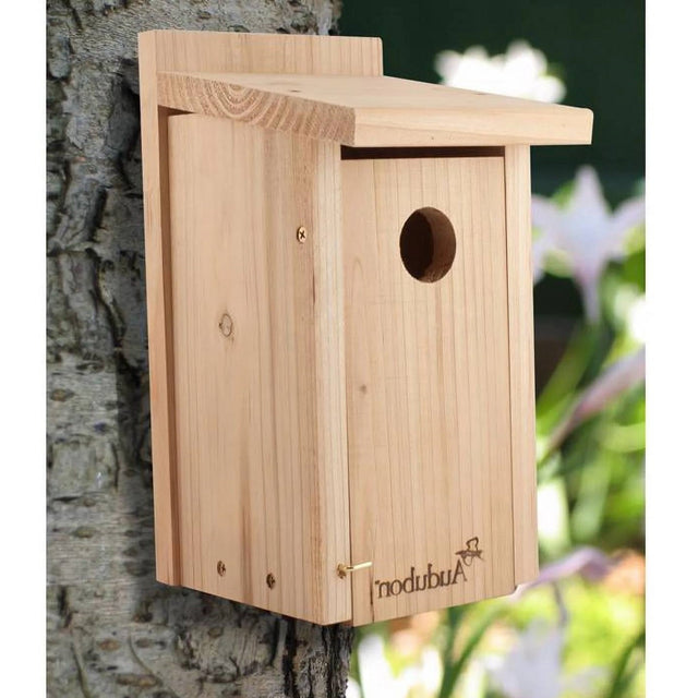 Give bluebirds a handcrafted haven with the Classic Cedar Wood Bluebird Bird House. This natural cedar house has a wealth of features, for the comfort of your bluebirds. This front panel also opens for nest checks and seasonal cleaning and a brass latch at the base keeps it securely closed. The entrance is placed high on the front panel, creating a deep home for your feathered friends and the 0.75 in. thick, cedar body keeps the unit nicely insulated. Keep bluebirds roosting in your backyard with the conventional design of this cedar bluebird house.