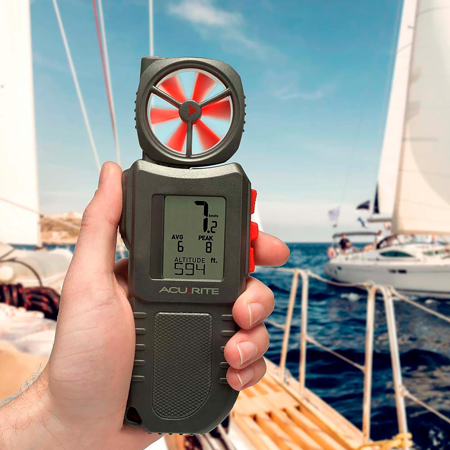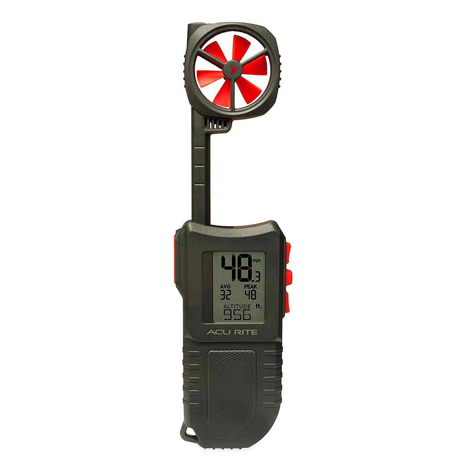 This handheld Portable Multi-Function Anemometer provides vital weather information on-the-go. Highlights of this handheld weather station include a wind meter, plus readings for temperature, humidity, and altitude. It also offers helpful features like high and low records, wind chill and heat index calculation, an LCD backlight for easy viewing, and a handy inspection light. Perfect for hiking, boating, golf, hunting and fishing, outdoor sports, and more. The portable anemometer has an integrated hanger and tripod mount and requires three AA batteries (not included).