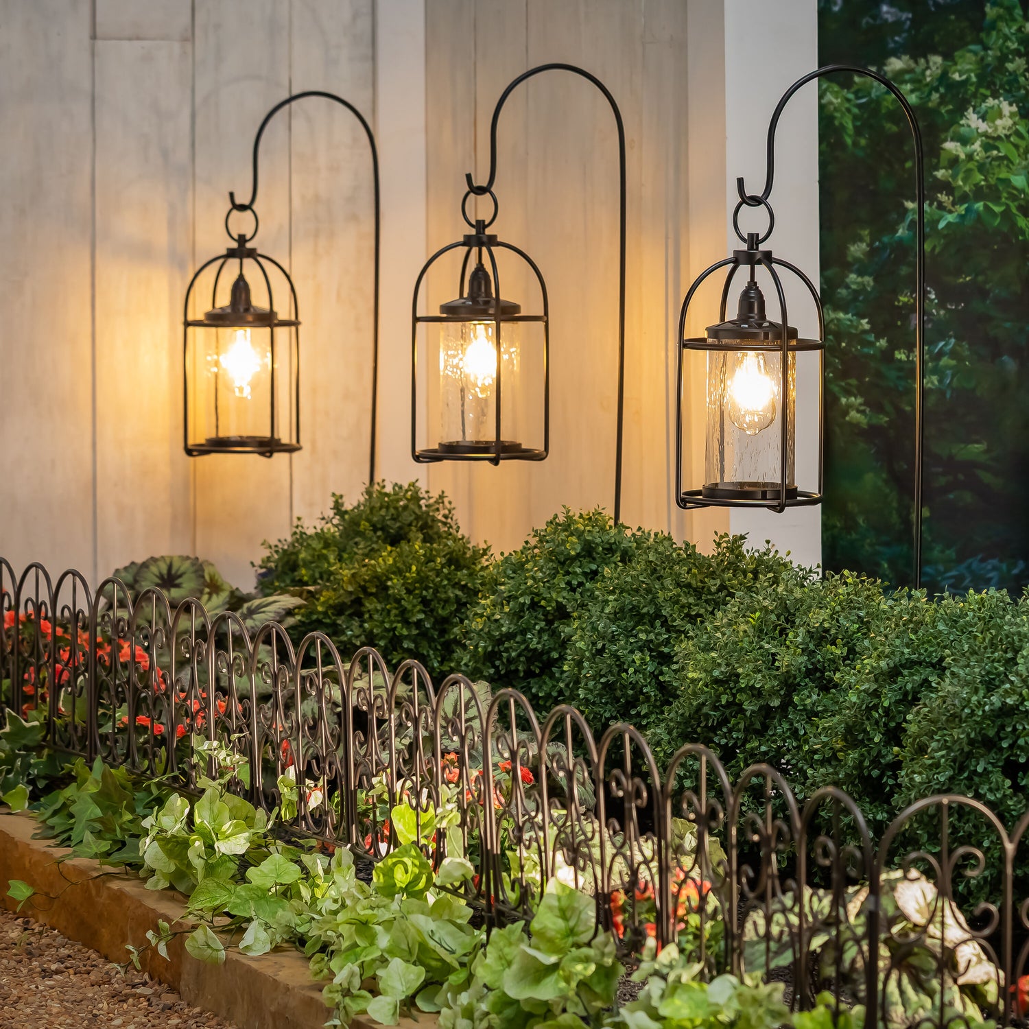 The integrated solar panel is at the top and powers the Edison-style light bulb inside, creating a charming effect while providing light and evening ambiance. Sturdy, black powder-coated metal and glass housing adds quality and durability.