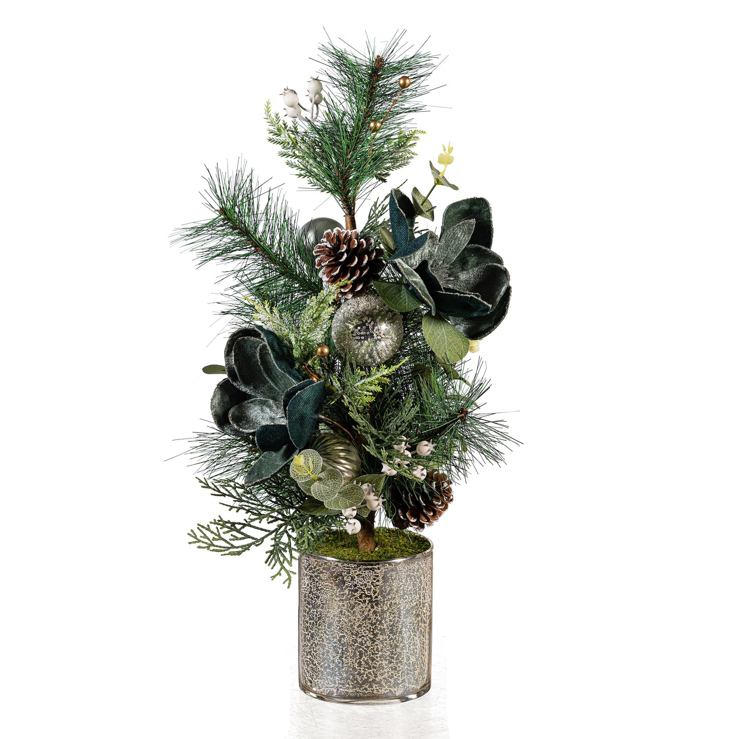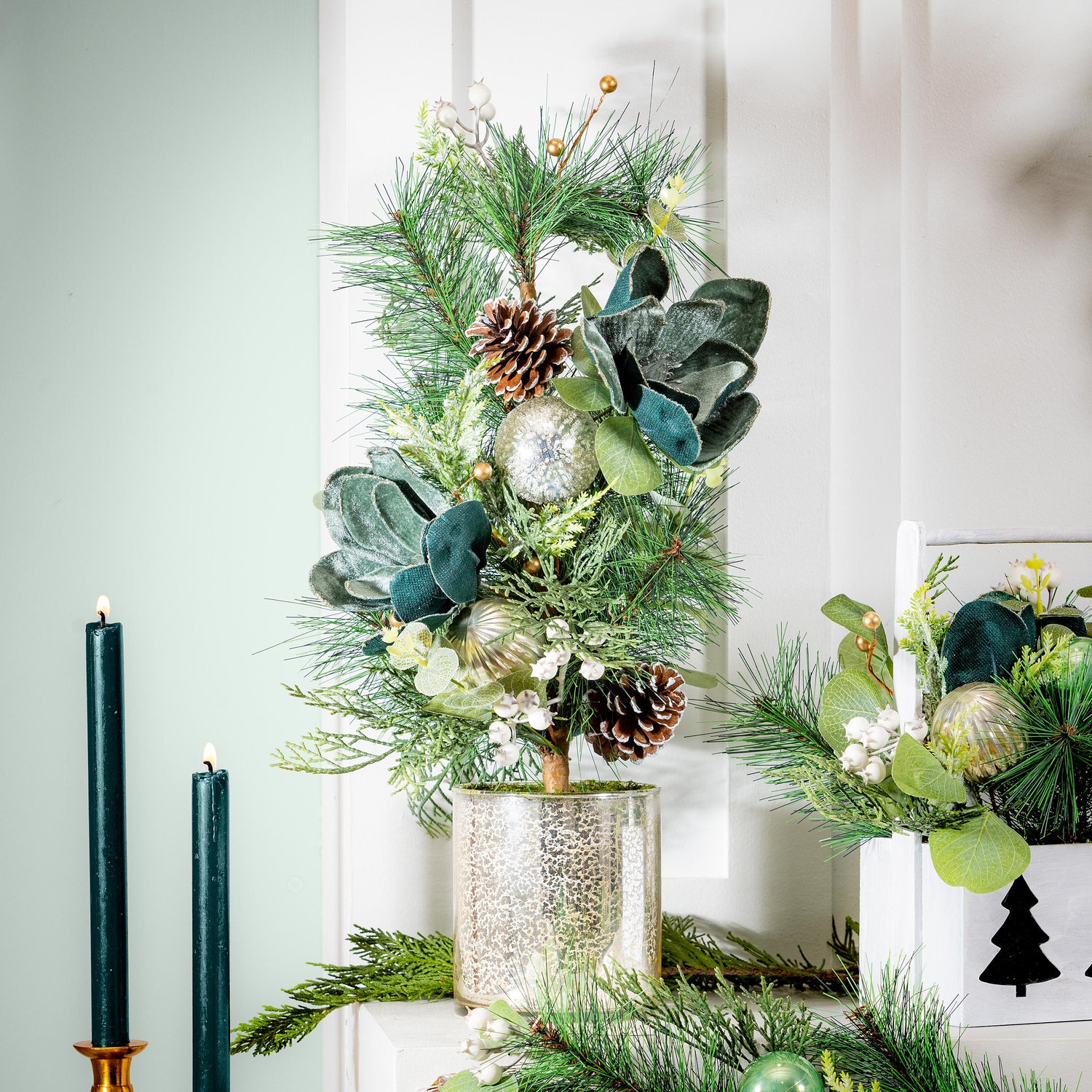 Bring natural beauty and festive charm to the home with the Shades of Green Faux Floral Tree Table Decor. This artificial tree sits in a decorative pot and is accented with delicate ornaments, blending seasonal sparkle with a touch of greenery. Compact and easy to style, it’s perfect for brightening tabletops, shelves, mantels, or desks. The lifelike foliage provides year-round appeal, while the ornaments add a cheerful holiday twist, making it a versatile accent that complements a variety of seasonal displays.