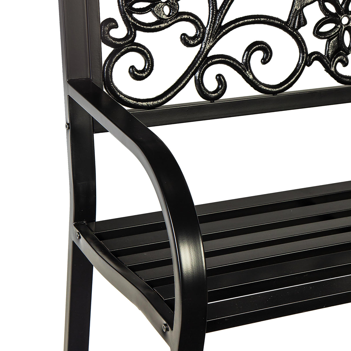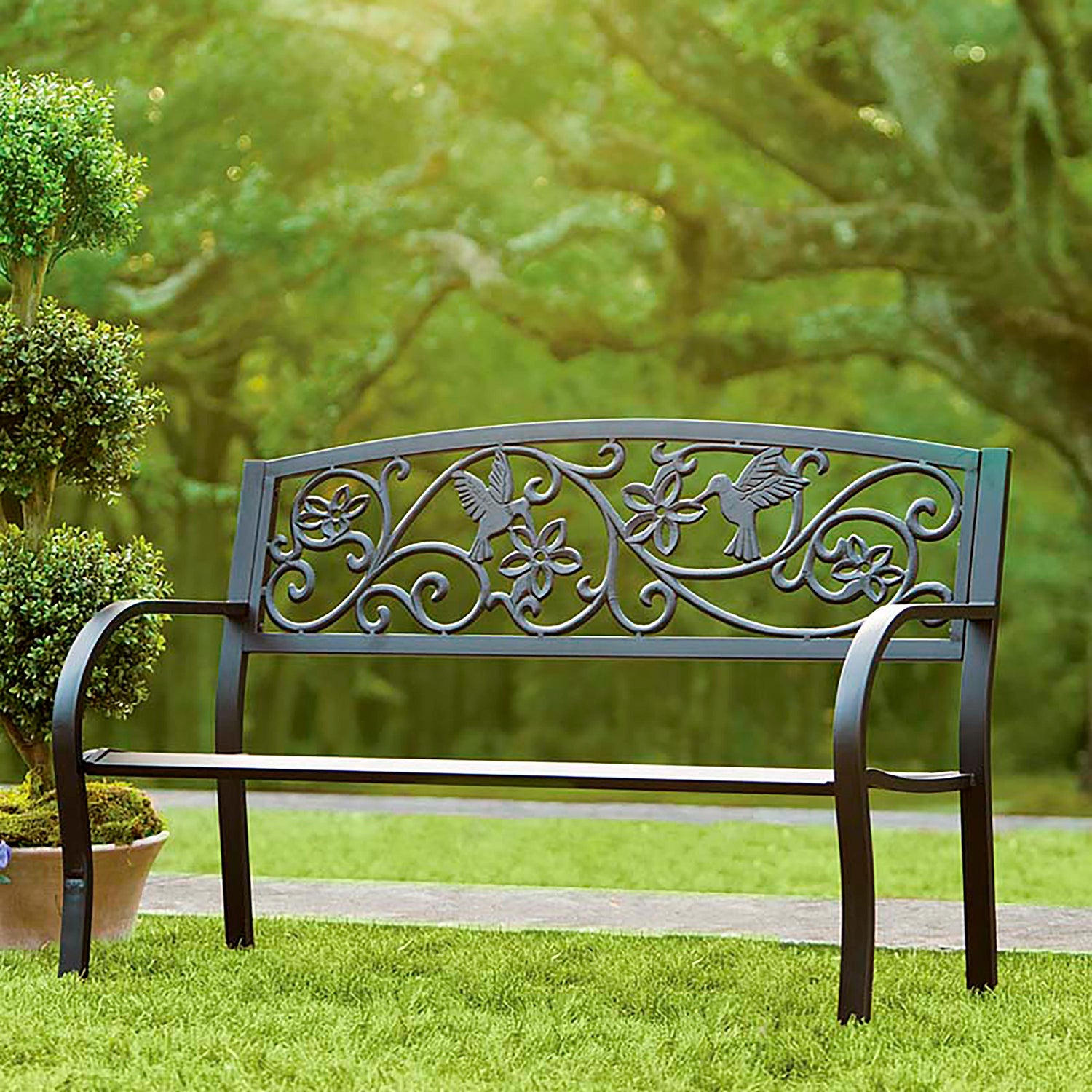 This decorative garden bench features a charming back design with hummingbirds, vines and flowers. The classic black finish lends a timeless look to any setting.
