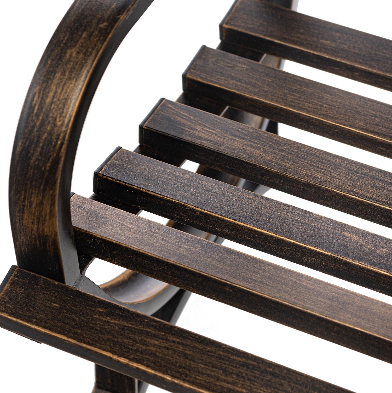 Sturdy steel frame; cast iron back design panel. A slatted seat and rounded arms add to the timeless appeal. All-weather powder coat. Easy assembly.