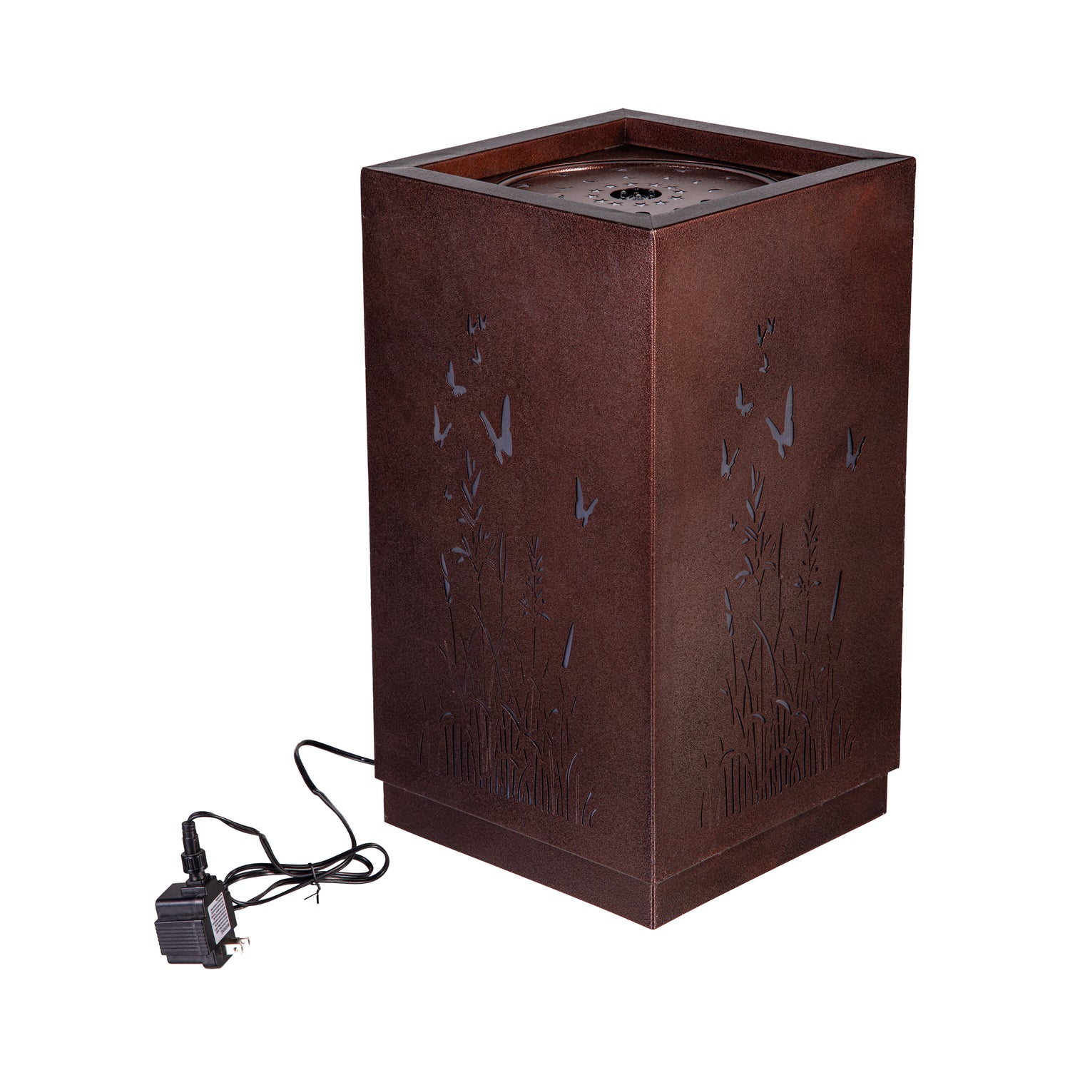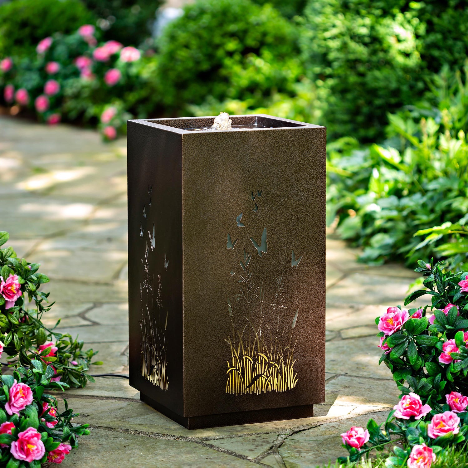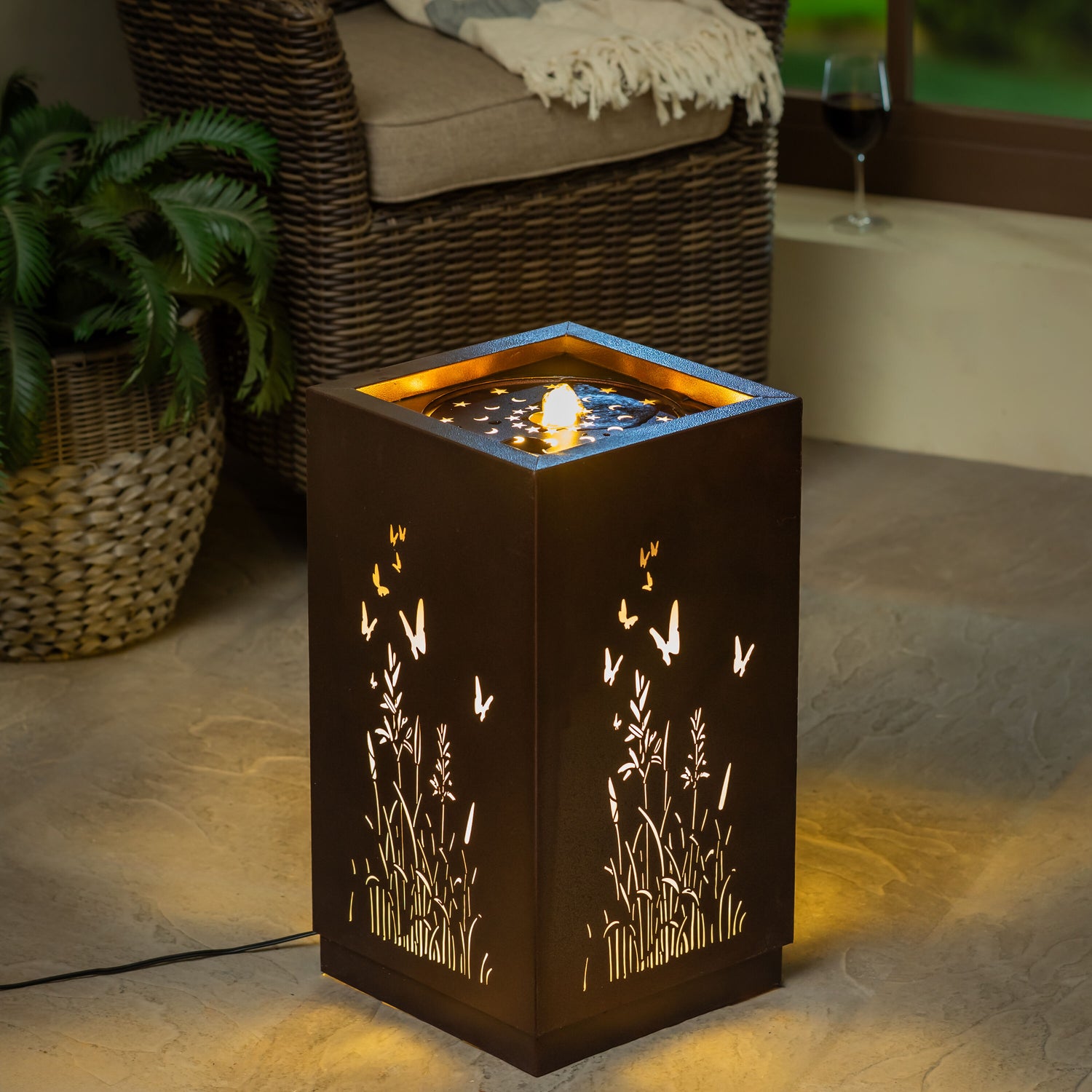 A rich brown metal exterior features a gorgeous laser cut-out design with butterflies amongst grasses that illuminate when plugged in. The top basin of the fountain is delicately decorated with petite stars and moons that also light up for a fresh look in any space - indoors or out.