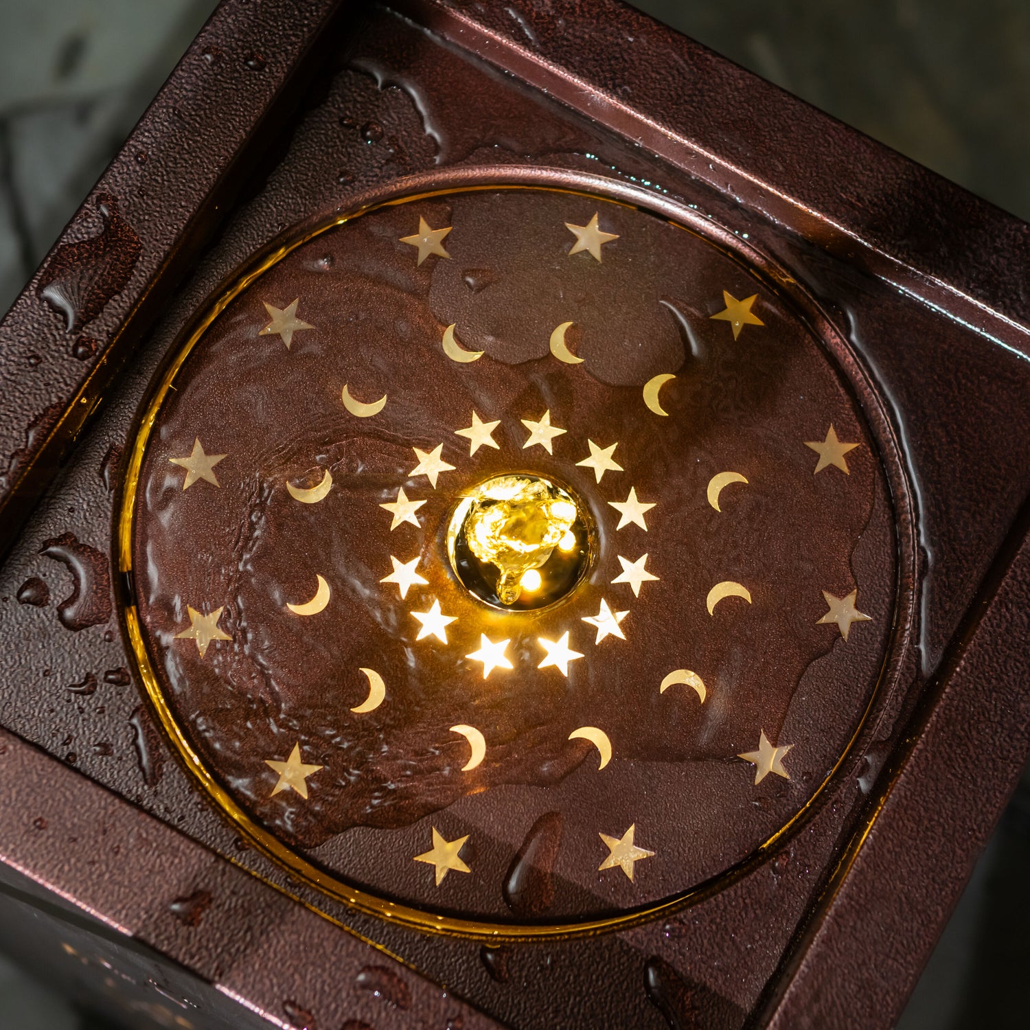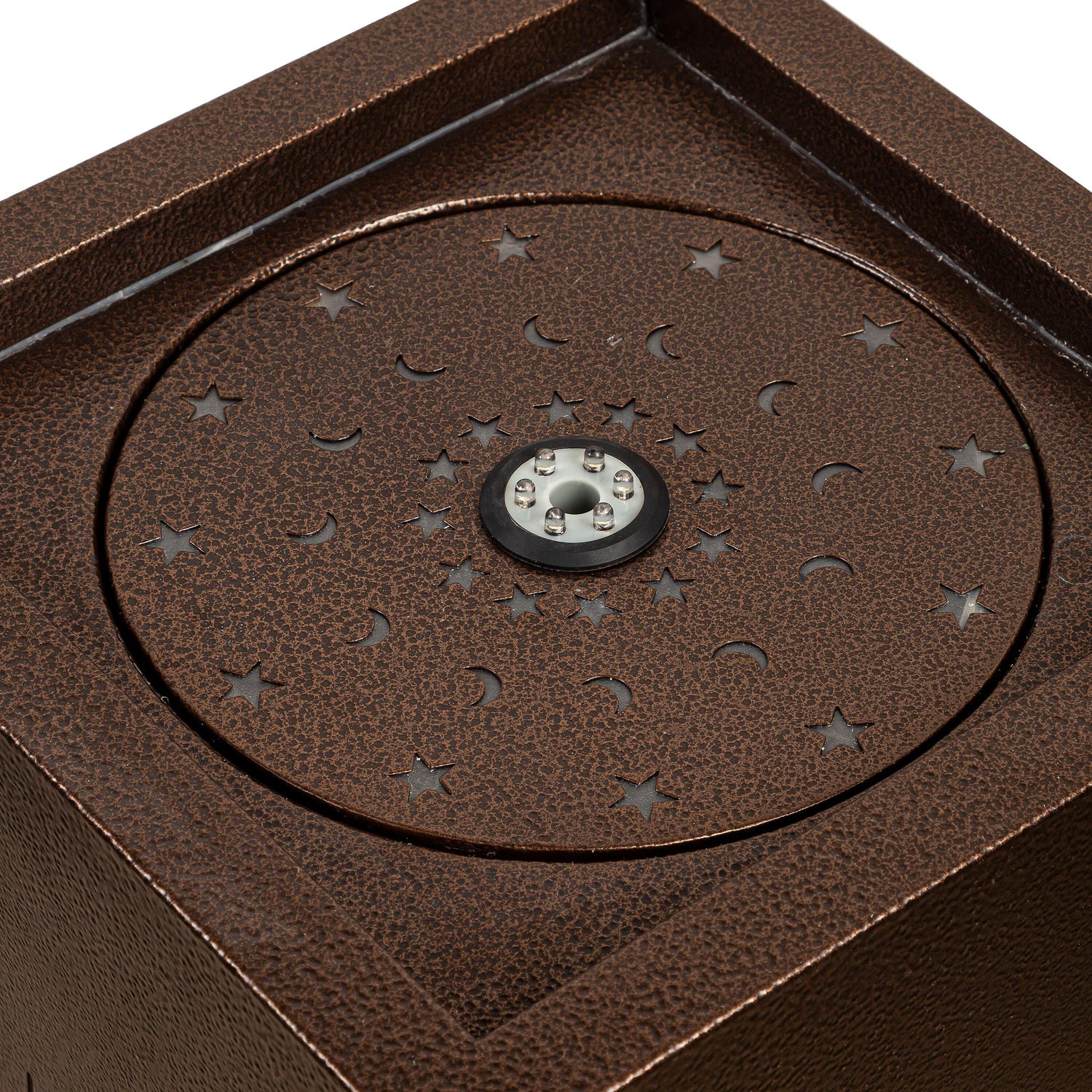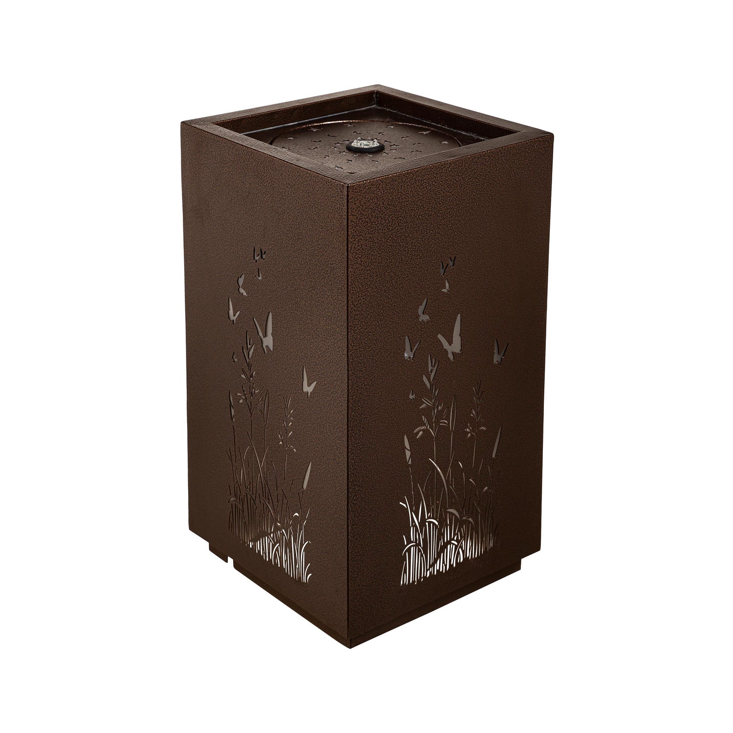 A rich brown metal exterior features a gorgeous laser cut-out design with butterflies amongst grasses that illuminate when plugged in. The top basin of the fountain is delicately decorated with petite stars and moons that also light up for a fresh look in any space - indoors or out.