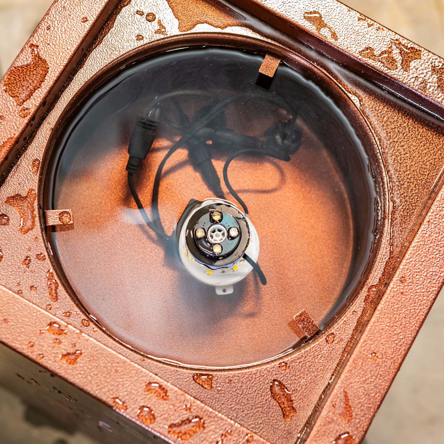 The versatile fountain has a rustic, reclaimed look with dramatic style, particularly when the lights shine and water is bubbling. It works in any season and is perfect complementing a porch, patio, deck, dining area, or any space indoors. Plugs-in with LED lights; holds up to 30L of water.