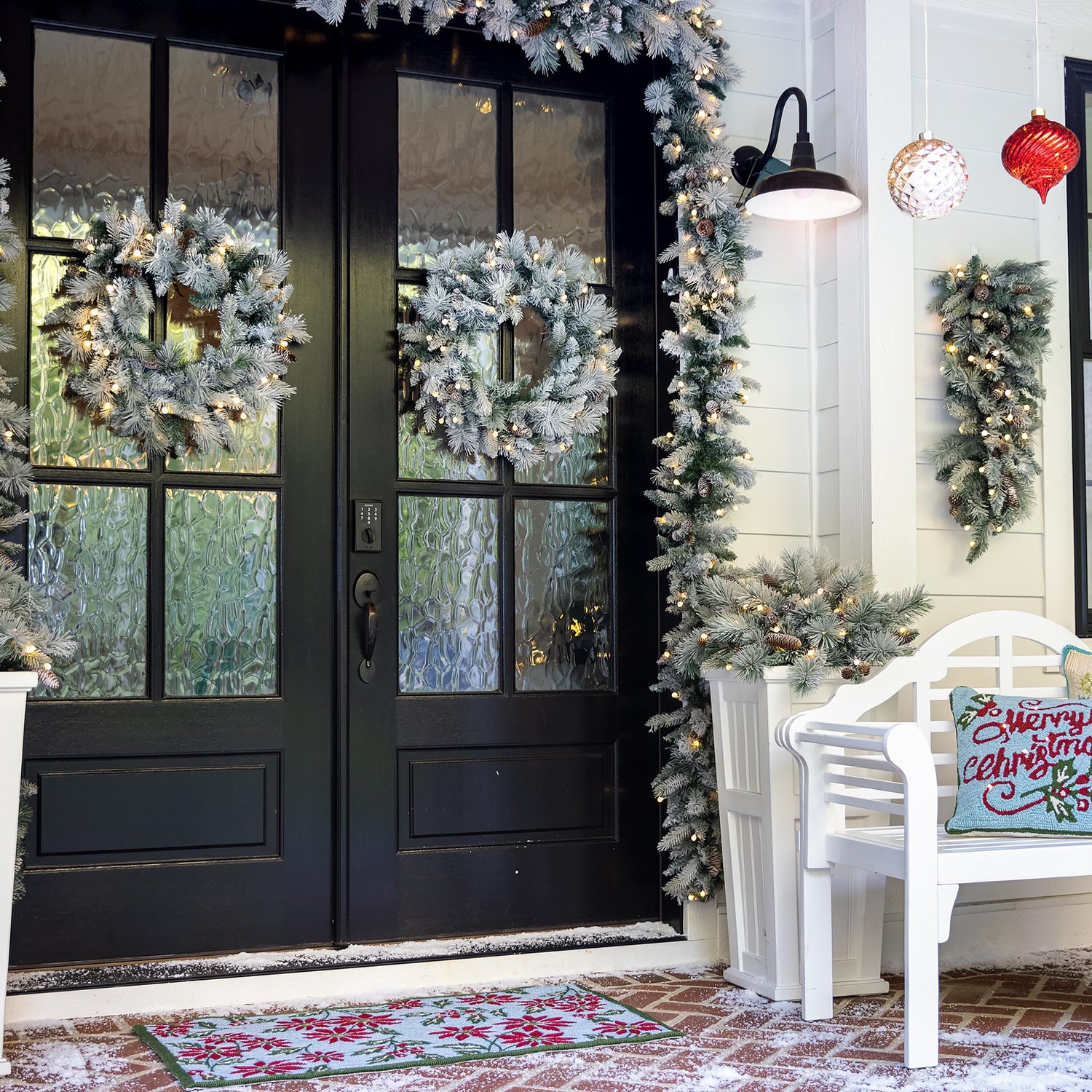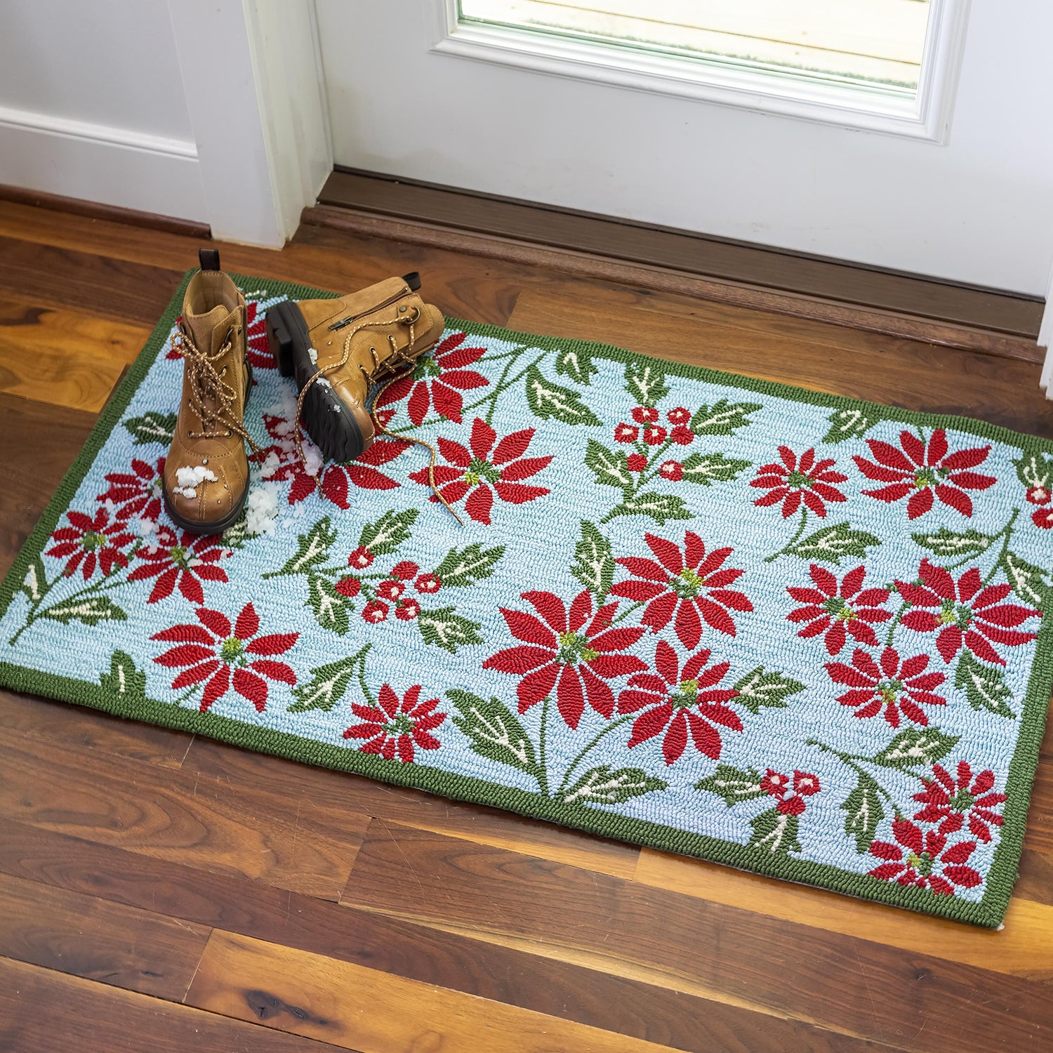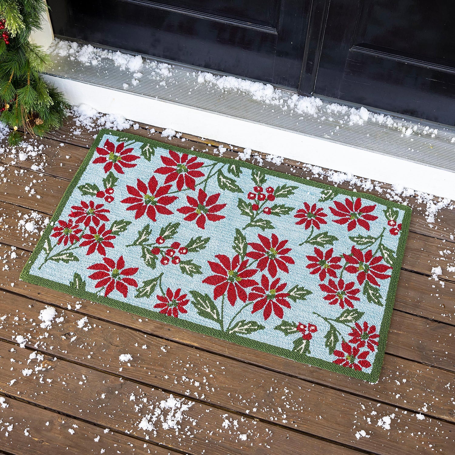 - Door mat with poinsettia and holly design on a neutral background