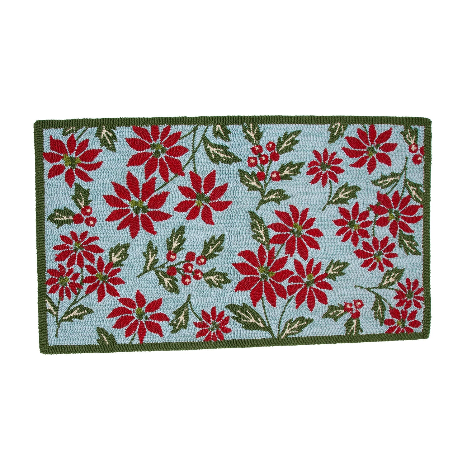 The gorgeous poinsettia and holly design is enhanced with hand-hooked detailing that's full of texture. Rich red poinsettias pop from the neutral background. Use it at your front door for the holiday season as a cheerful greeting to neighbors and friends. No worries about muddy feet or paws; this 100% polypropylene door mat is mildew and fade resistant.