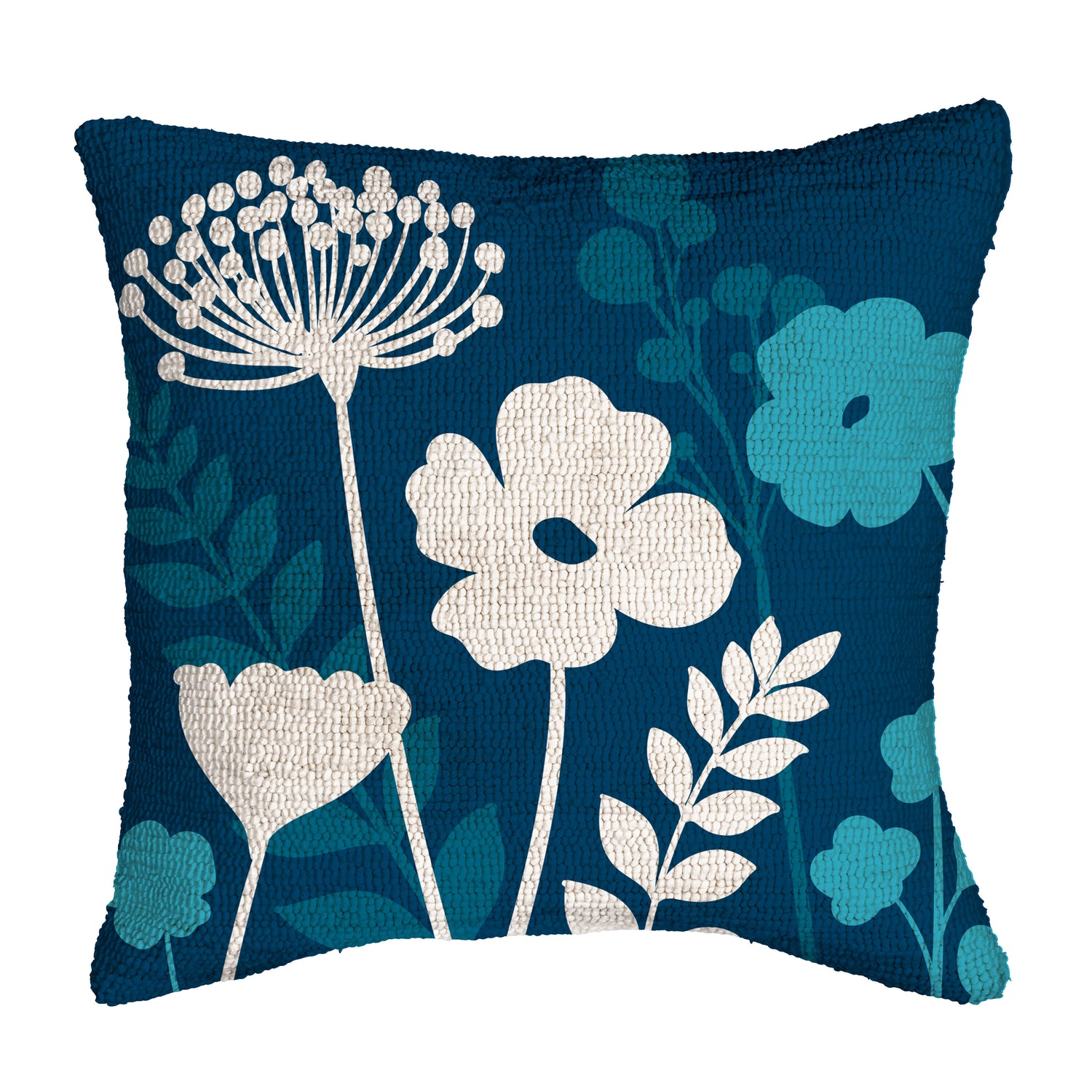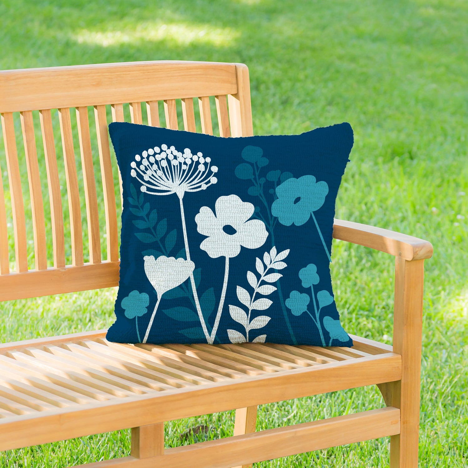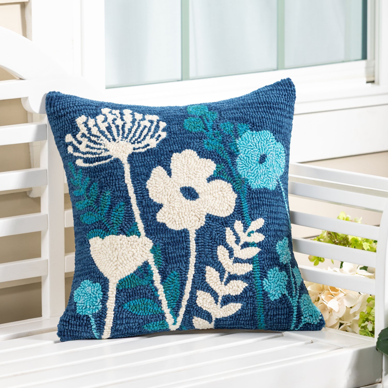 VivaStyle Gilded Meadow Indoor/Outdoor Hooked Pillow, Blue Wildflowers,18"x18"