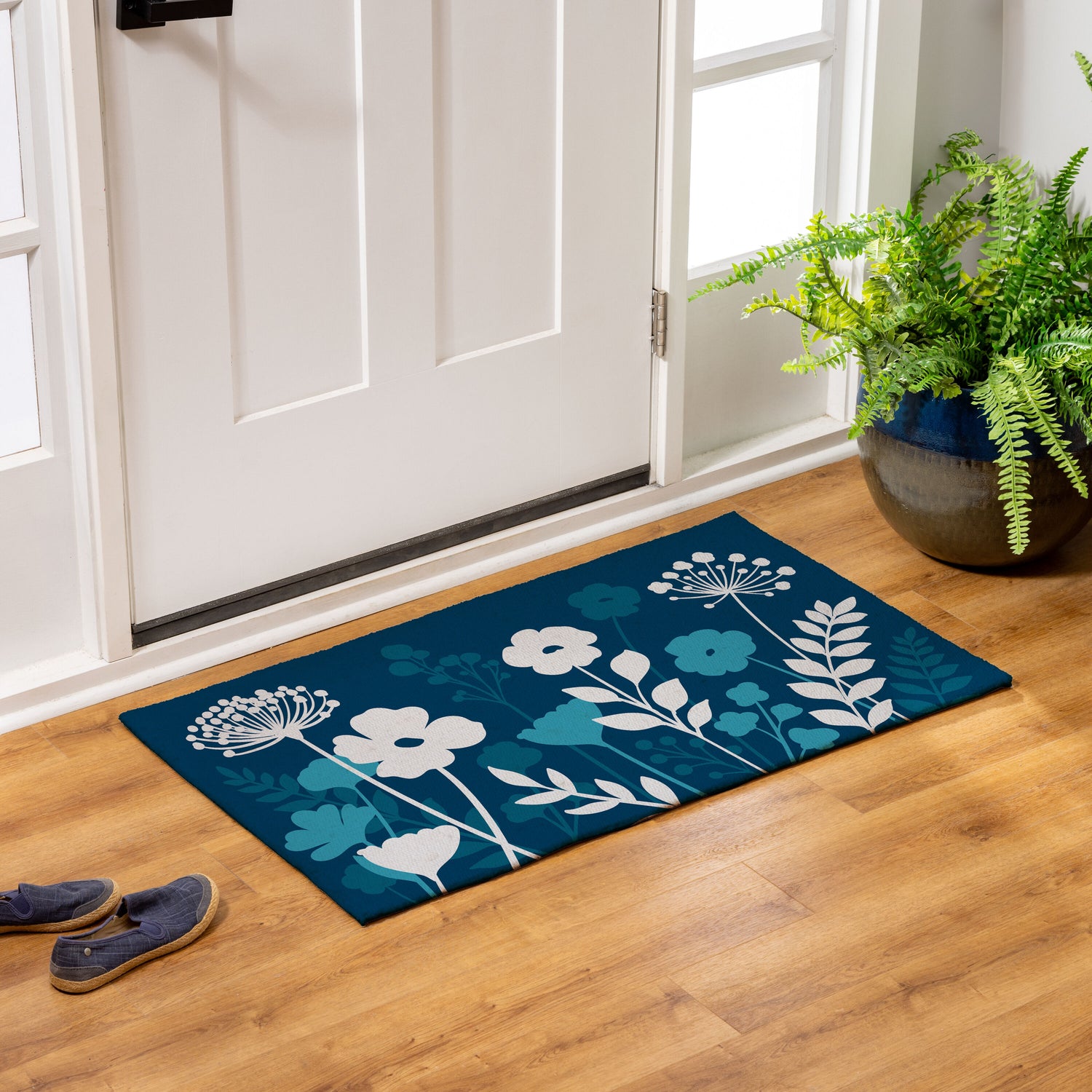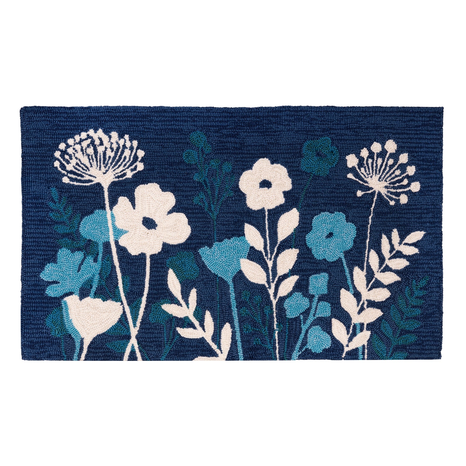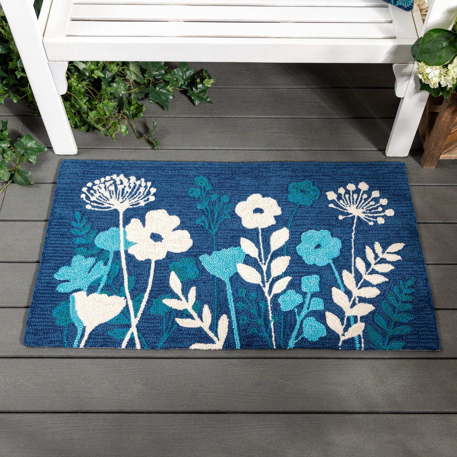 VivaStyle Gilded Meadow Indoor/Outdoor Hooked Rug, Blue Wildflowers