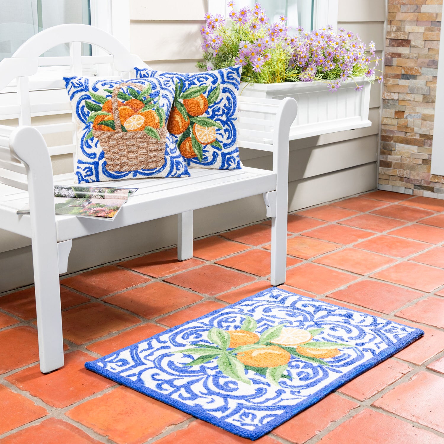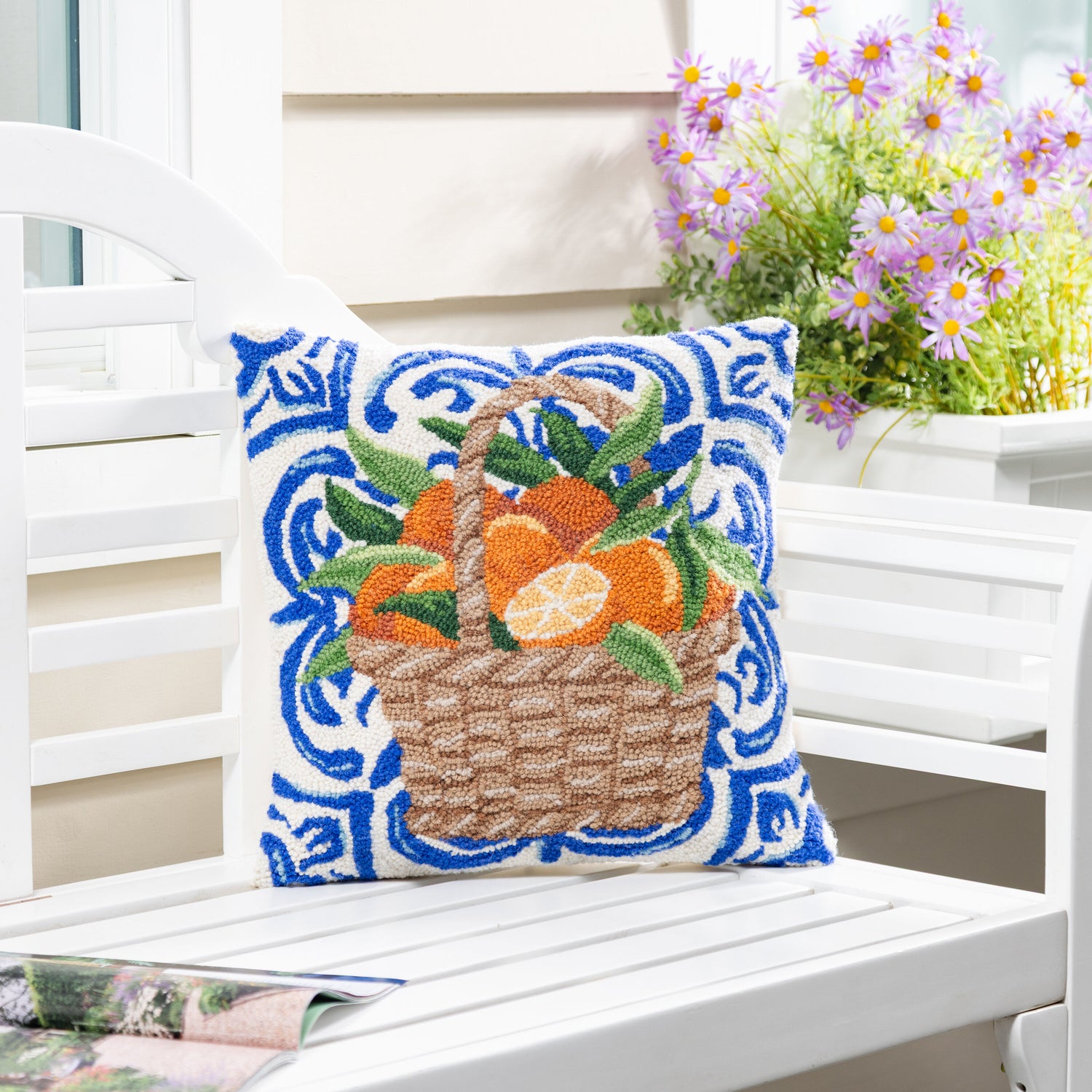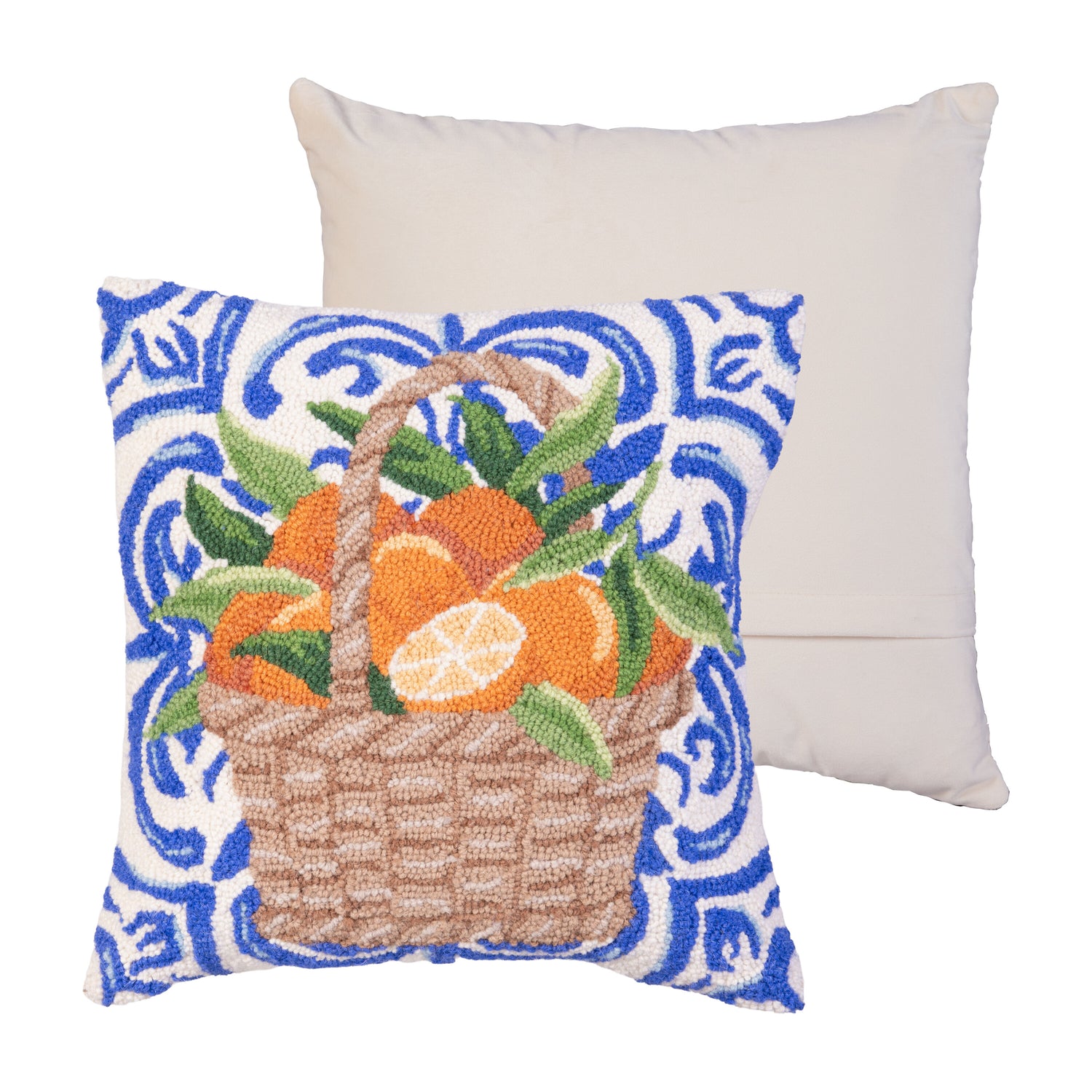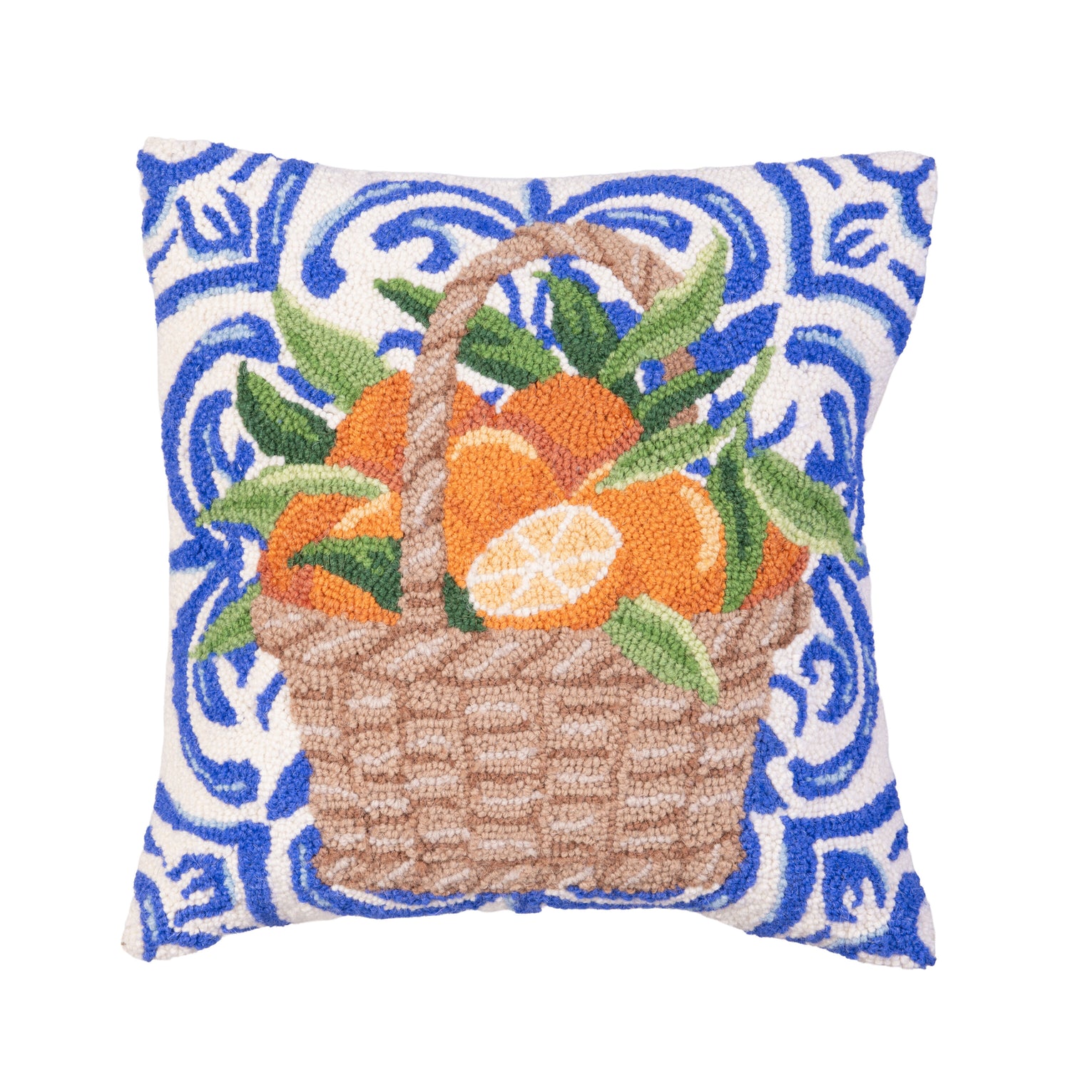 Add a splash of Mediterranean charm to your home with this Basket of Oranges Hooked Accent Pillow. Inspired by classic European tile designs, this beautifully textured pillow features vibrant oranges and lush green leaves set against a bold blue-and-white ornamental background. The hand-hooked style adds rich dimension and softness, creating a piece that’s both eye-catching and cozy. Perfect for brightening a covered porch bench, sunroom chair, or living room sofa, this cheerful citrus design instantly adds fresh color and timeless style to any space.