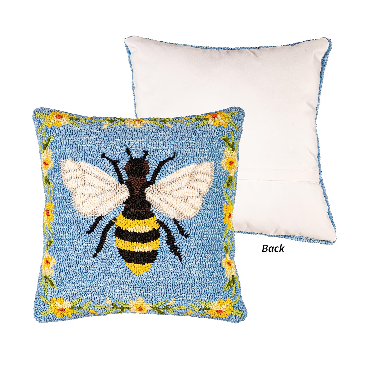 Create a buzz with our Indoor/Outdoor Bee Hooked Polypropylene Throw Pillow. This oversized pillow stars a bold bee contrasted by a soft blue background and a delightful floral border.