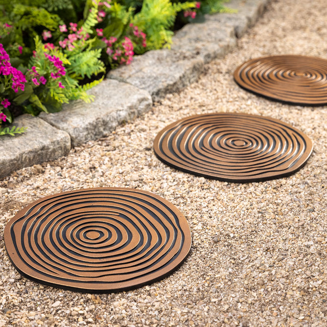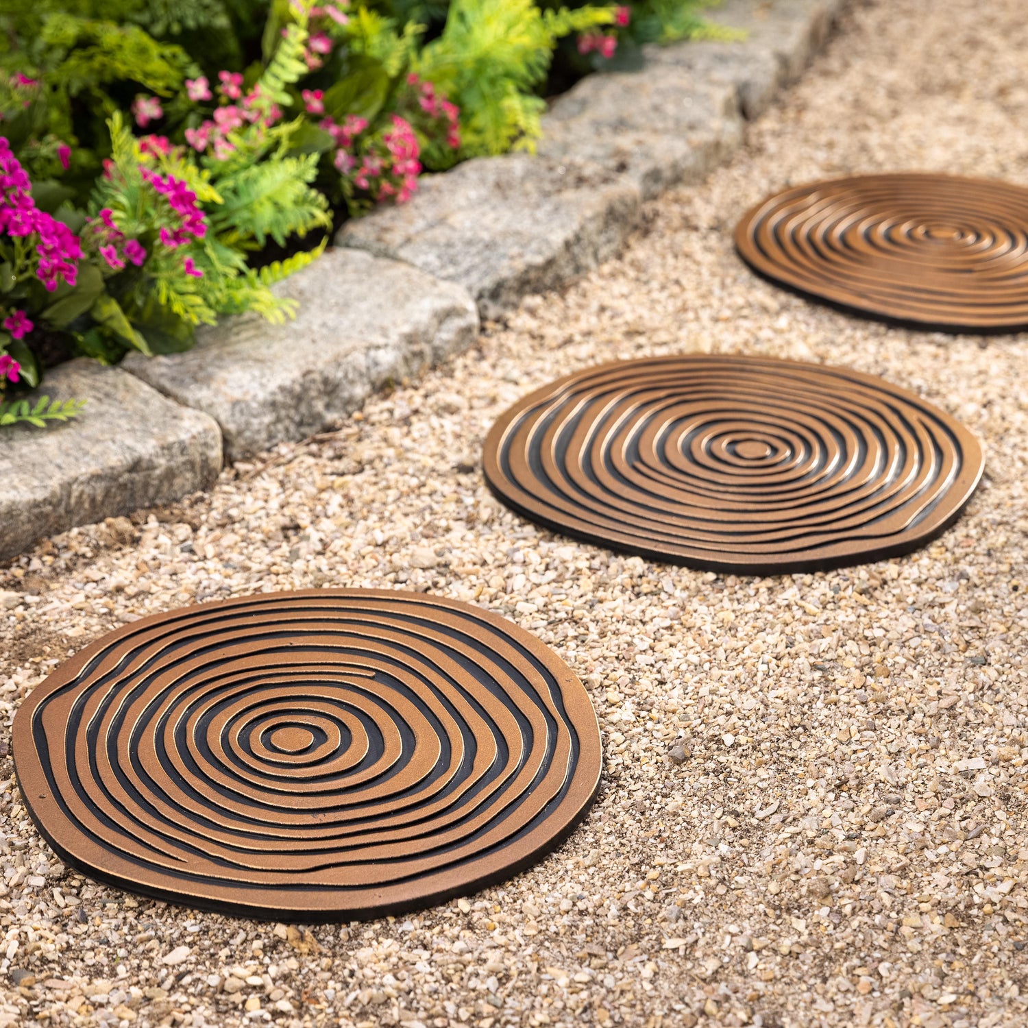 Place these charming stepping stones along a path for a well-marked garden walk. Crafted of durable, partially recycled rubber, these markers will withstand extreme weather conditions in any season. Set of 3 rubber stepping stones resemble wood cuts with a metallic finish that contrasts nicely with the black base. Sturdy yet lightweight and easy to move around your yard. Use them anywhere you want to mark a path or have some attractive artwork underfoot, such as lawn, yard, flower bed and more.