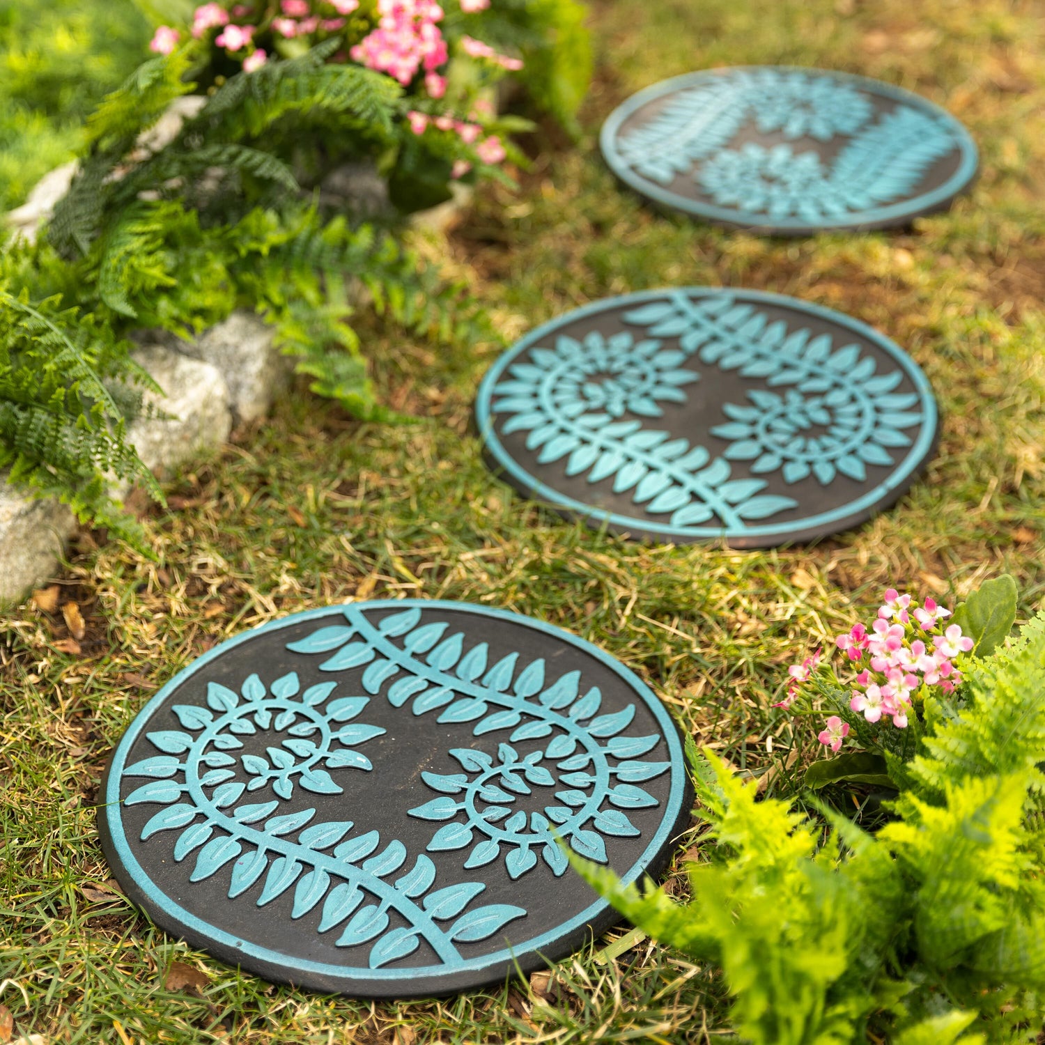 Create a charming pathway through your garden with these Decorative Fern Garden Stepping Stones. Featuring an intricate raised fern design in a soft turquoise finish against a rich charcoal base, each round stone adds a fresh pop of color and botanical elegance to your landscape.Perfect for guiding guests along flower beds, lawns, or garden borders, these stepping stones combine beauty with function. The durable rubber construction is designed to withstand the elements, while the detailed leaf pattern brings texture and visual interest to outdoor spaces year-round.Use them individually as accent pieces or arrange several to form a whimsical garden path. Whether nestled among ferns, flowers, or greenery, these stepping stones add a graceful finishing touch to any outdoor.
