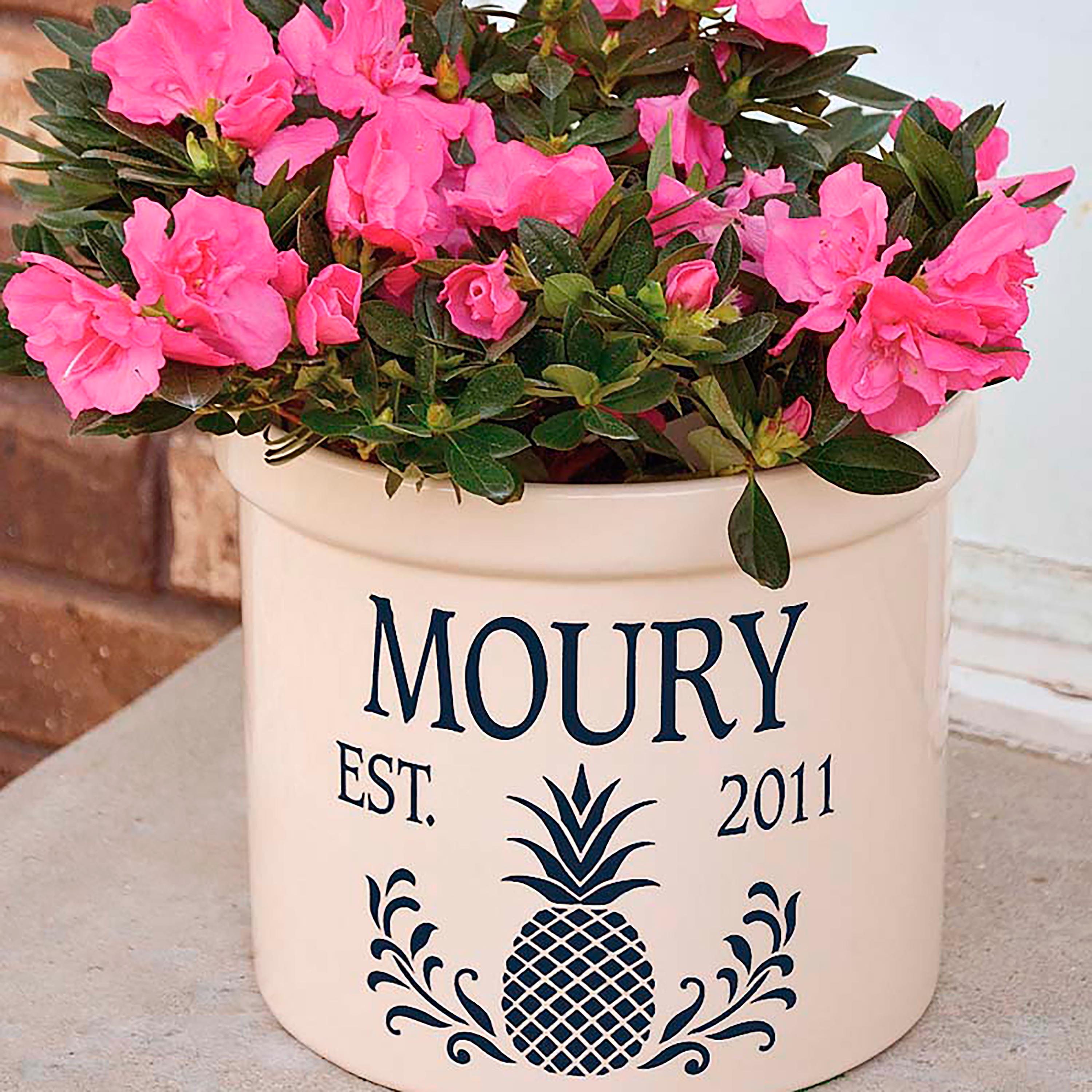 Our top-quality Pineapple Personalized Crock adds a special touch to front porch or walkway. Personalize it with any name and year for a thoughtful gift. Drop in a flowerpot to add a splash of color. This pineapple motif ceramic crock is a great accent and a wonderful gift for wedding, housewarming, anniversary and more! Made in USA.