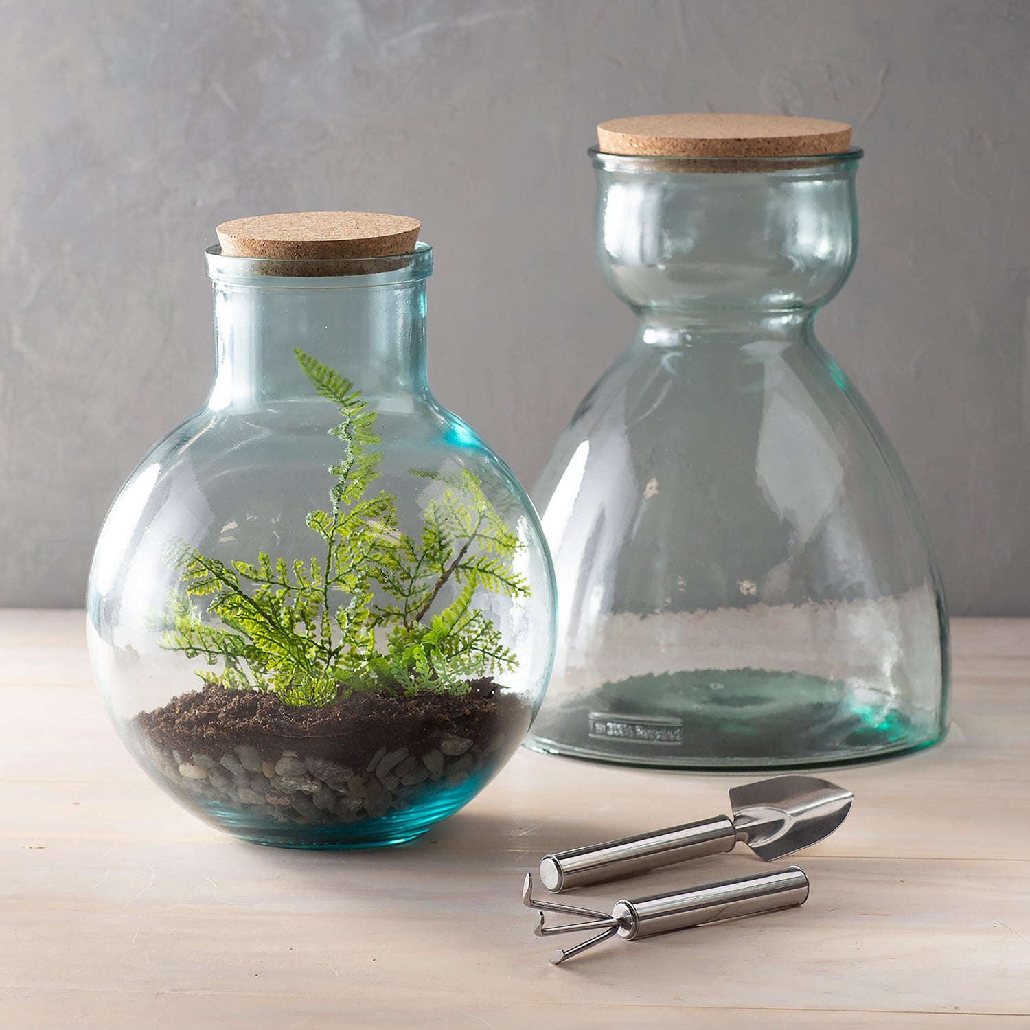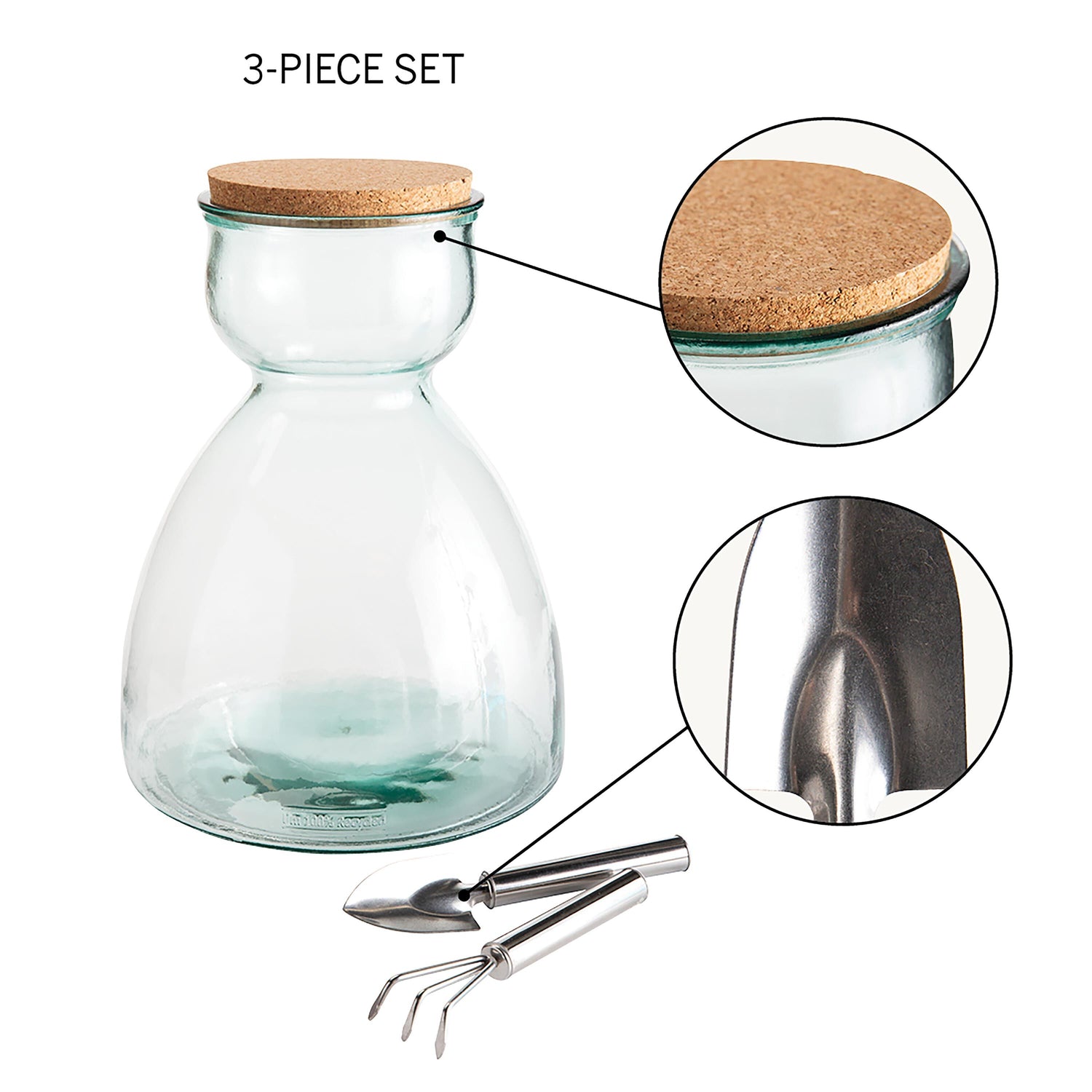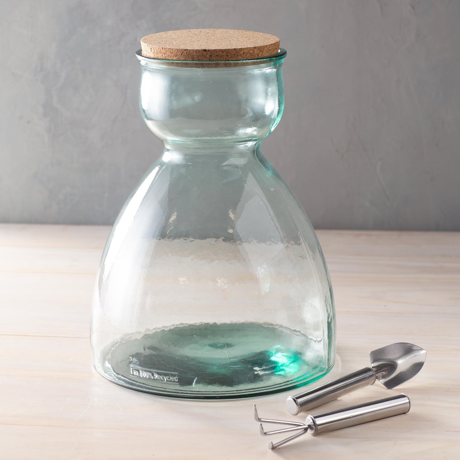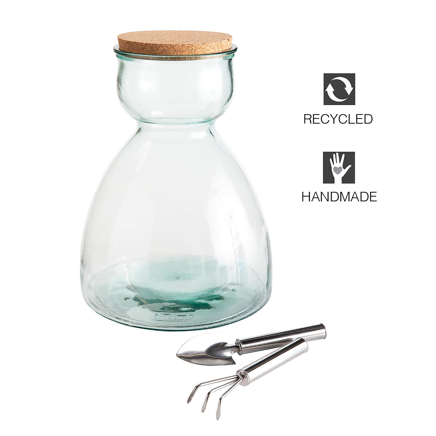 This large terrarium kit arrives with the necessary tools to create your own green-layered habitat. Kit includes a 7.5 "L stainless steel spade and a 7"L three-prong rake. The simple tall container and cork top provide the perfect home for succulents and greens. A perfect gift idea for an indoor gardener or as an educational opportunity for a young plant enthusiast. What's even better? This large terrarium is made with 100% recycled glass and is made by our artisan partners in Spain. A perfect eco-friendly home for your plants!