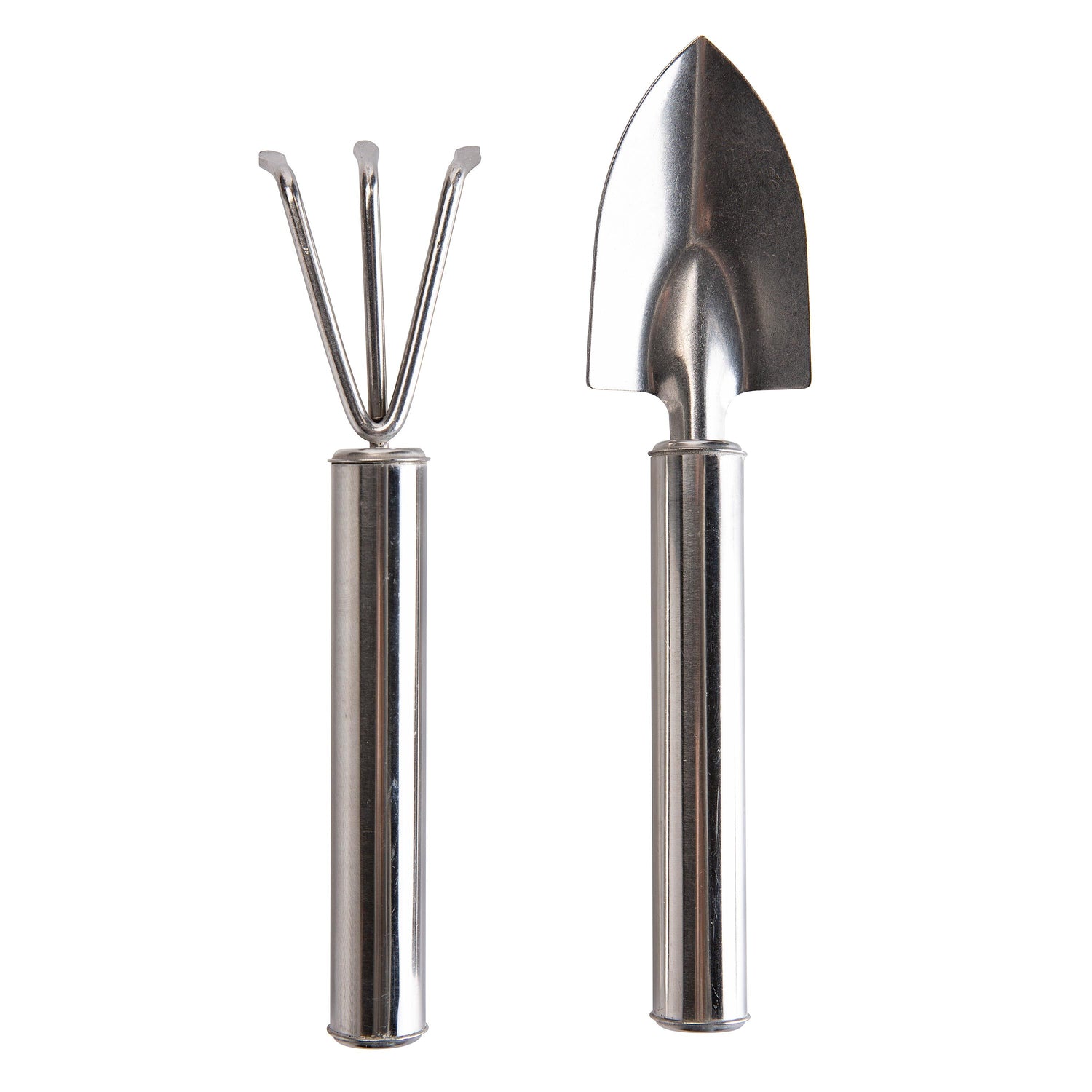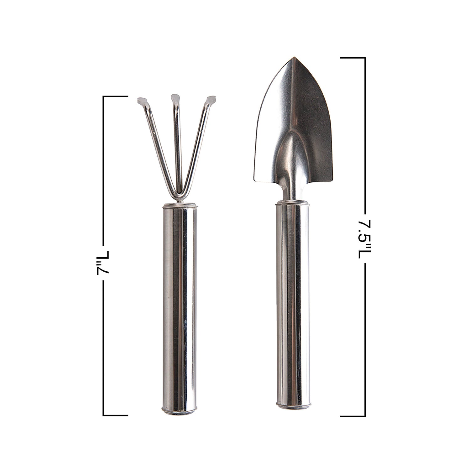 - Kit includes a 7.5 "L stainless steel spade and a 7"L three-prong rake
