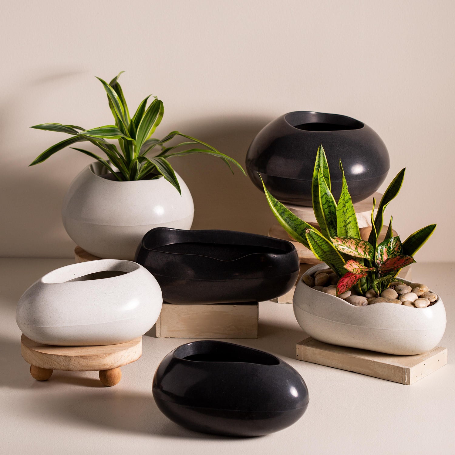- The first of their kind, Brazilian artisans retro mold these unique planters into organic shapes inspired by the look of smooth river stones for an all-weather planter that is 100% recyclable