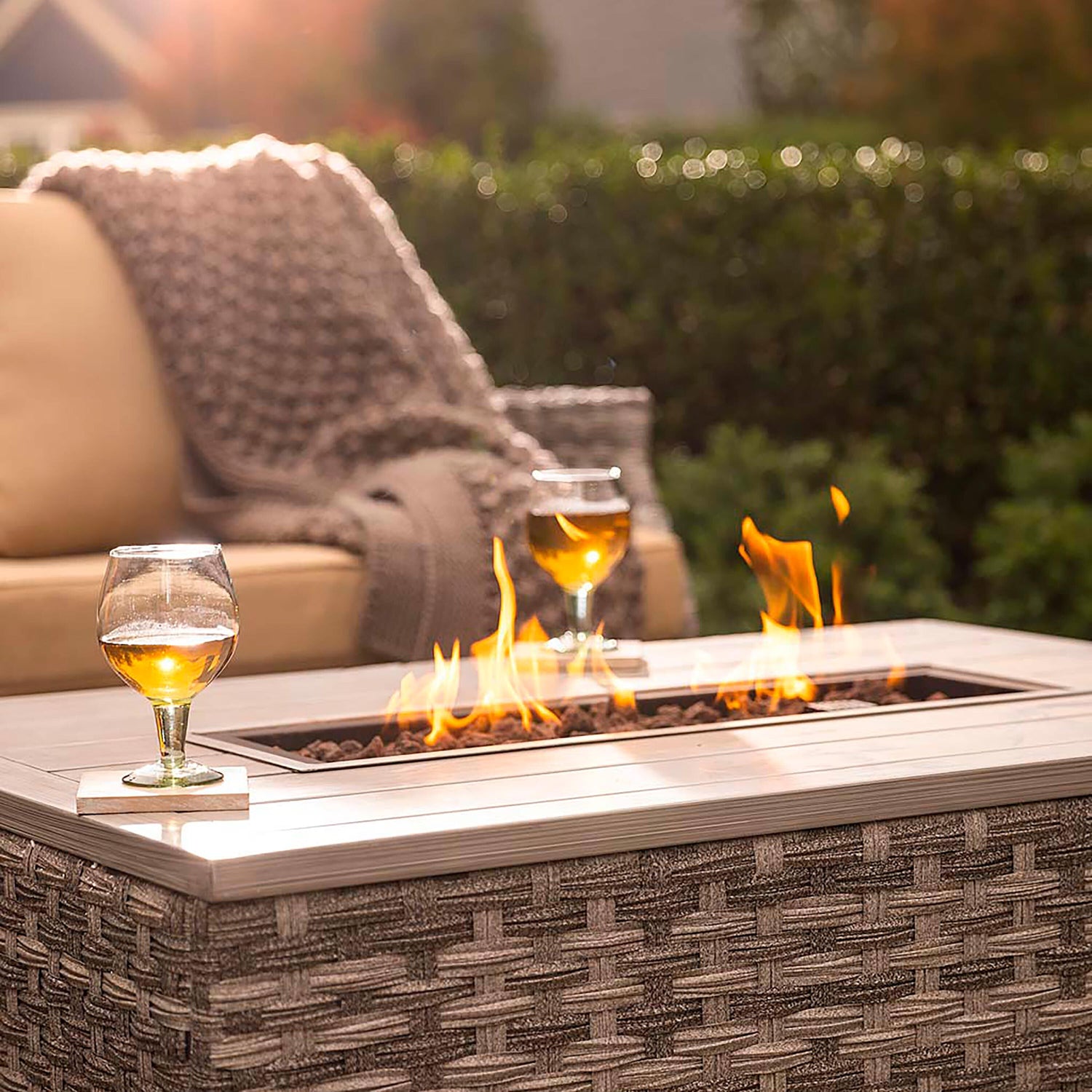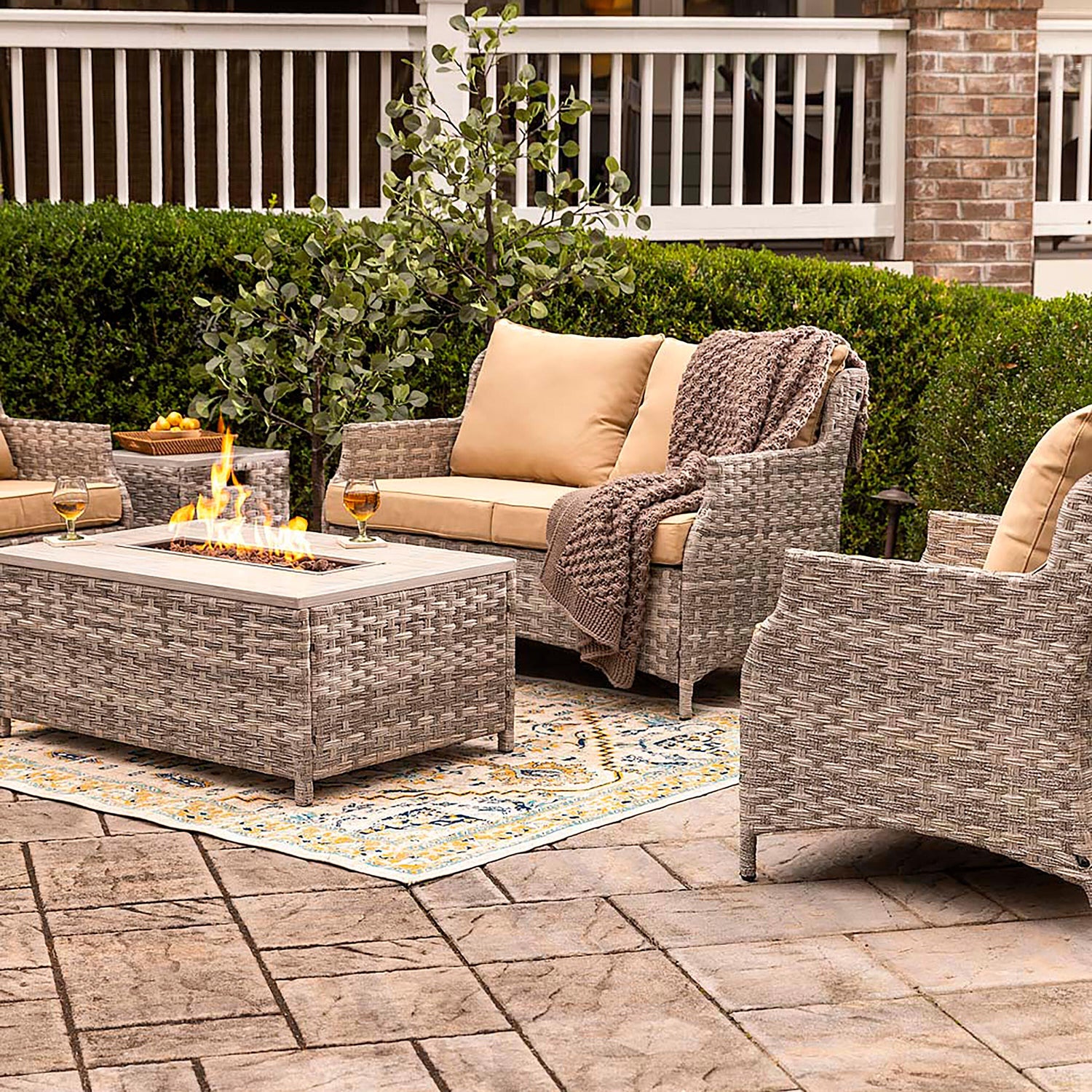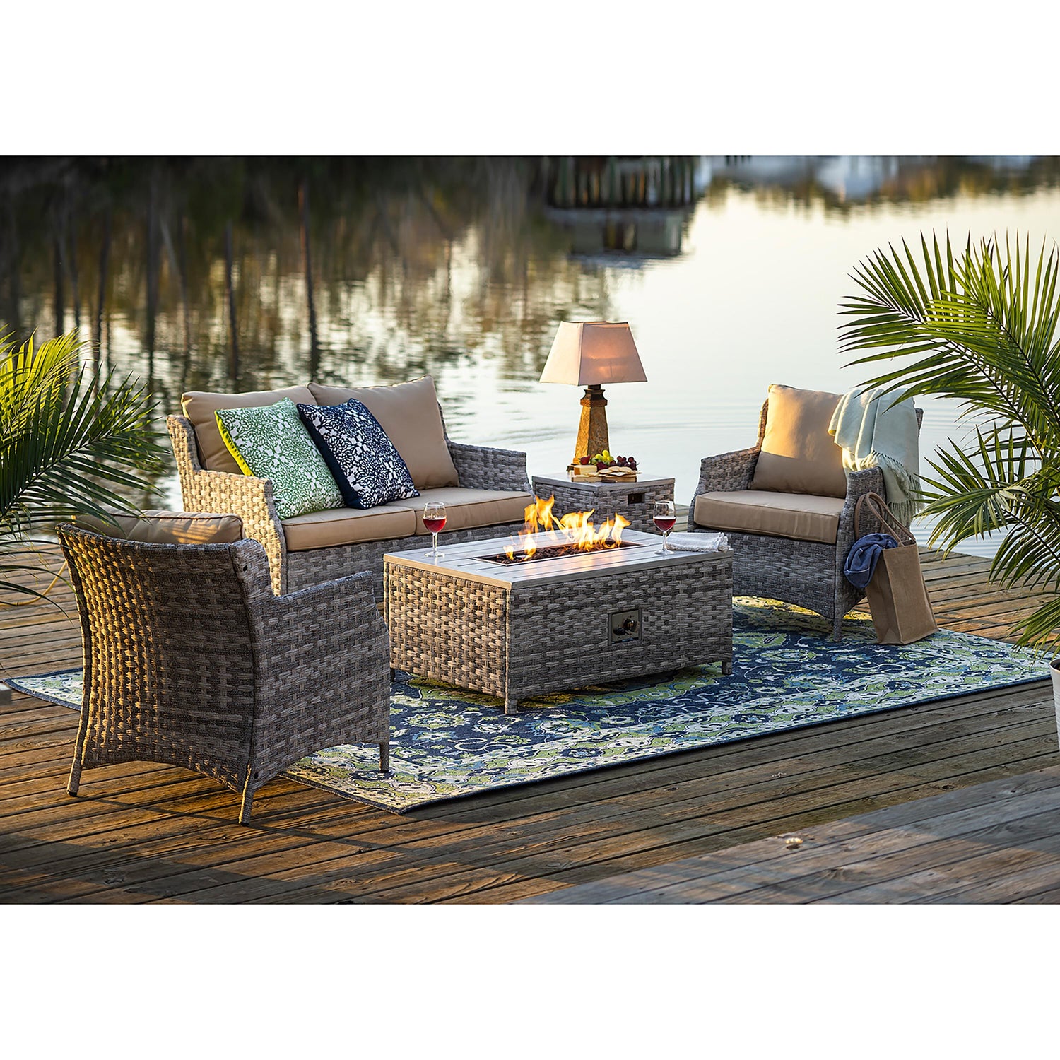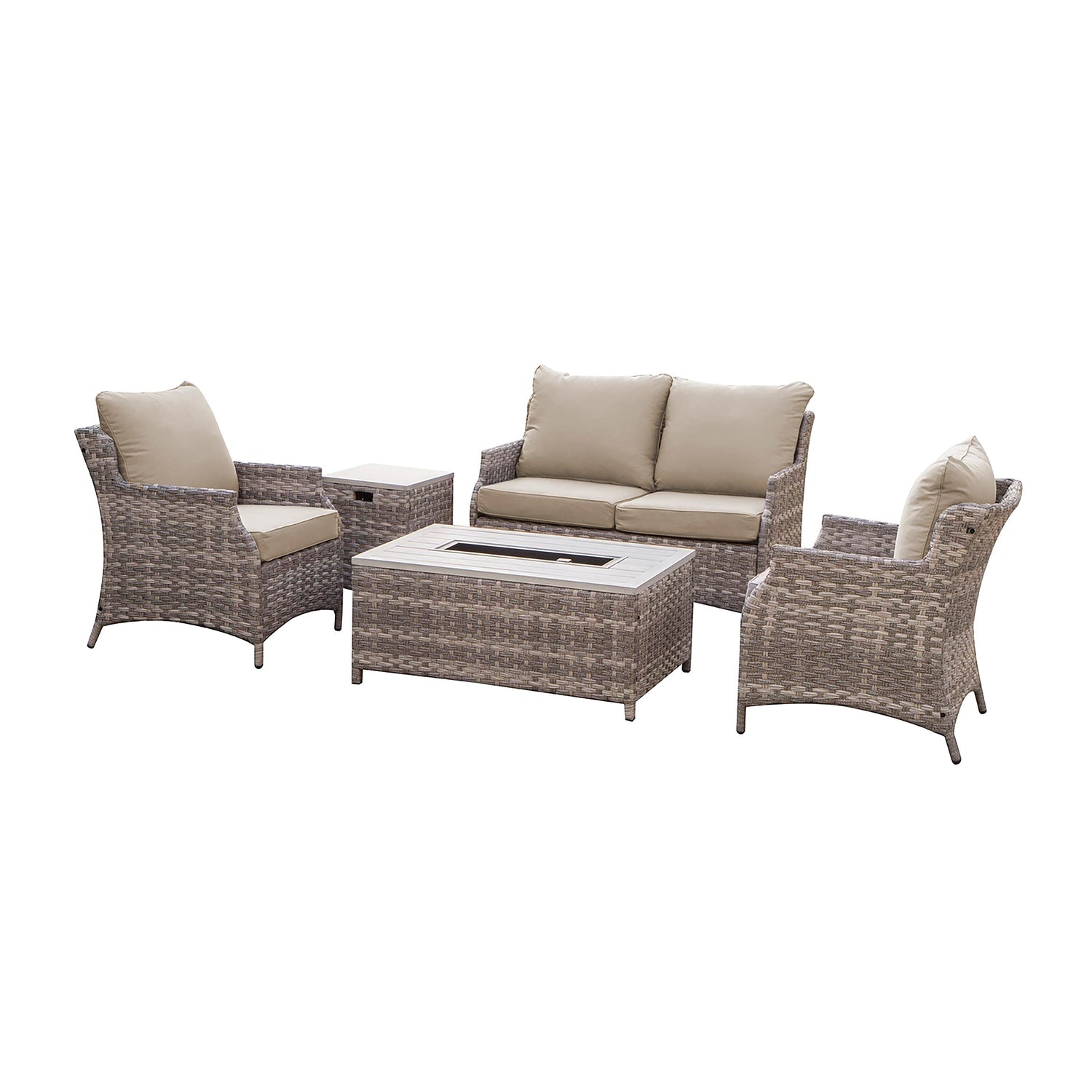 Elegant, convenient and luxurious, this 5-piece seating set has everything you need for a memorable gathering of family and friends. Includes a love seat, 2 chairs, propane fire pit/cocktail table and side table that conceals the propane tank. Quality construction with aluminum frames and resin wicker; weather-resistant cushions included.