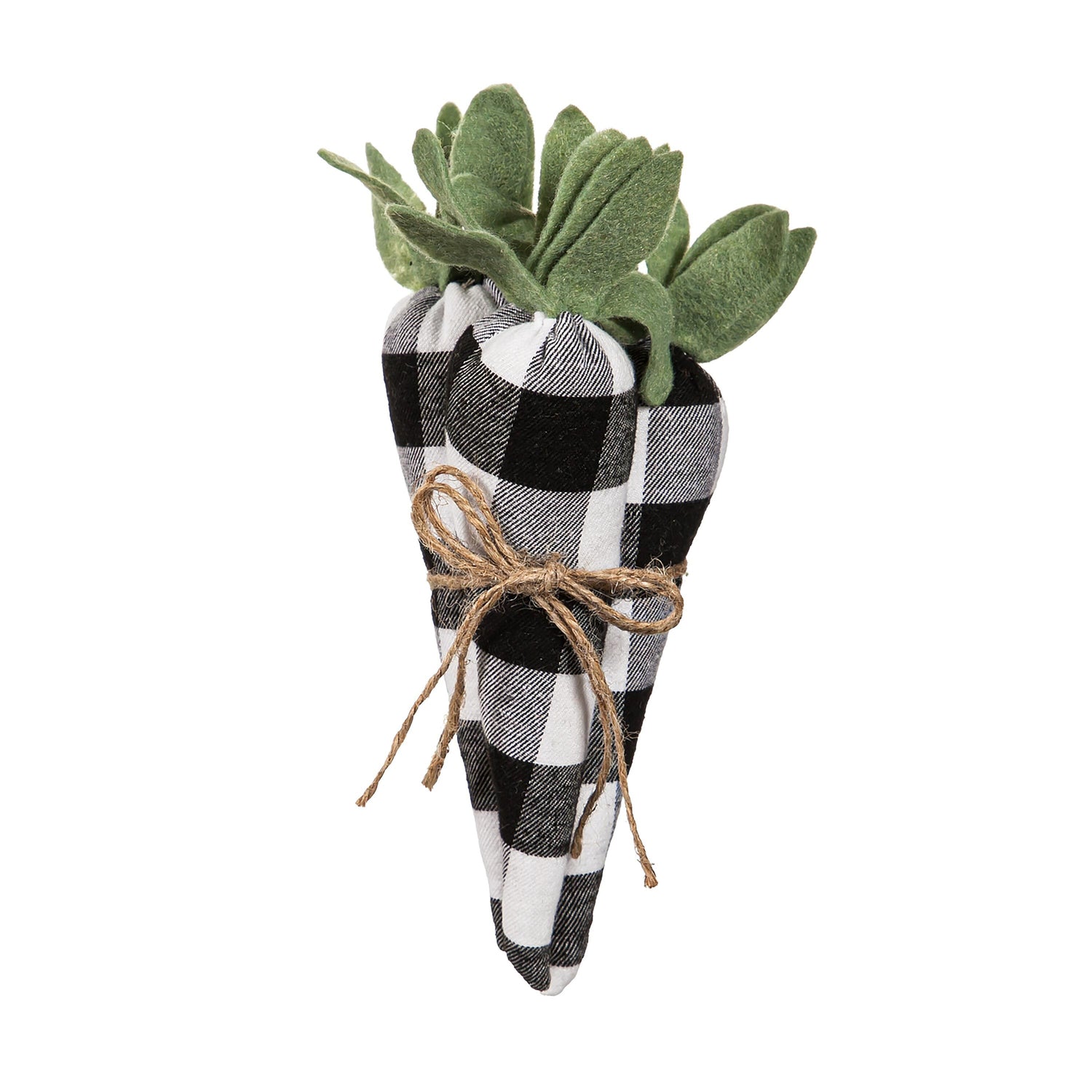 Tied together with a rustic twine bow, the carrots are crafted of a bold black and white buffalo check fabric that creates an interesting look. Perfect for Easter and Spring.