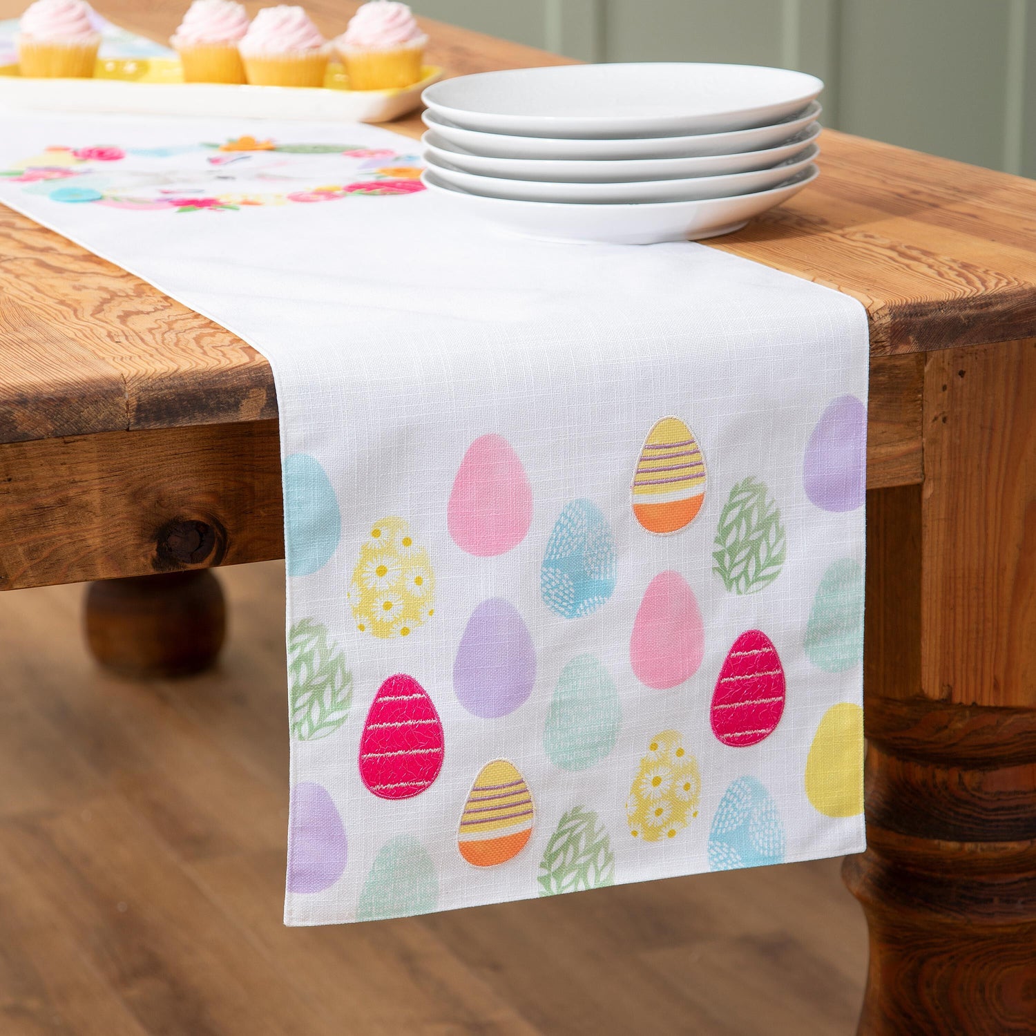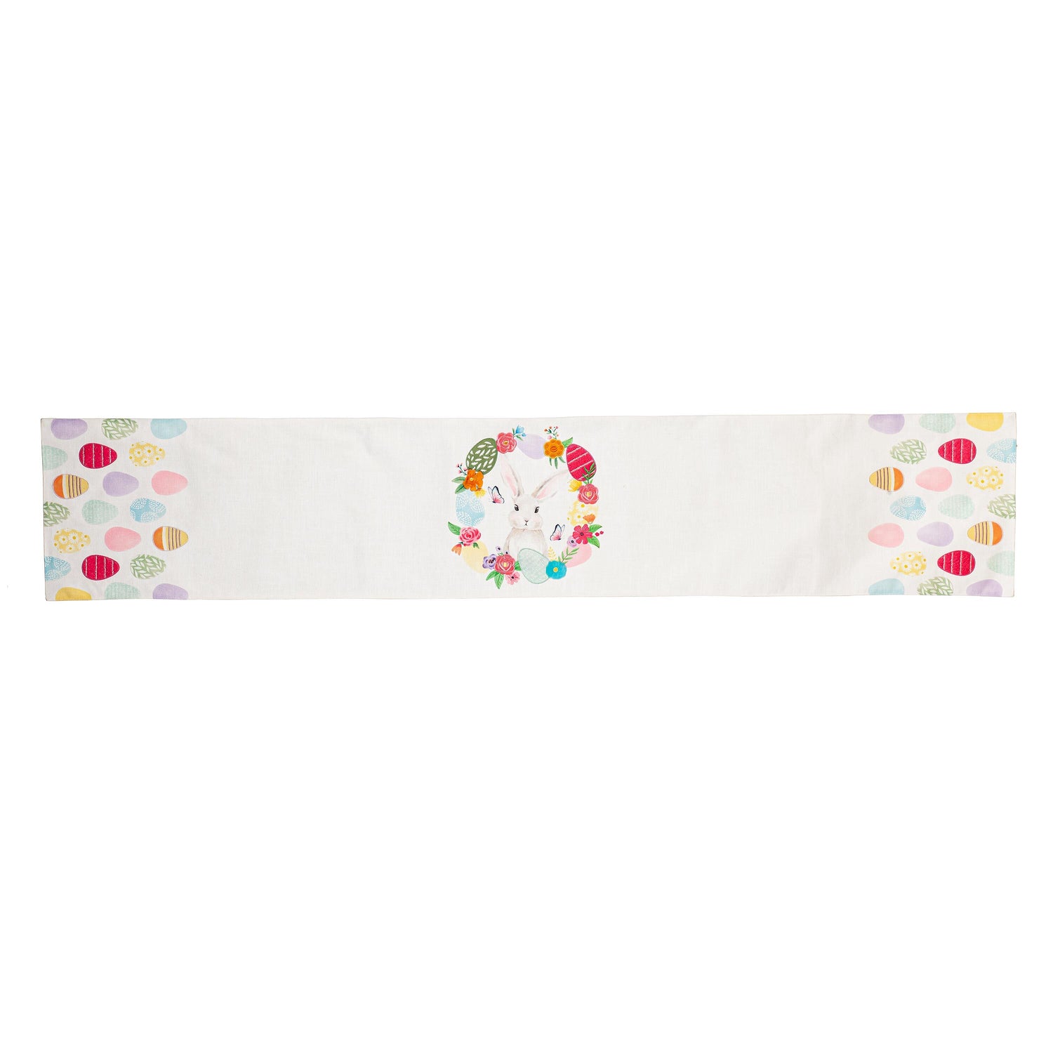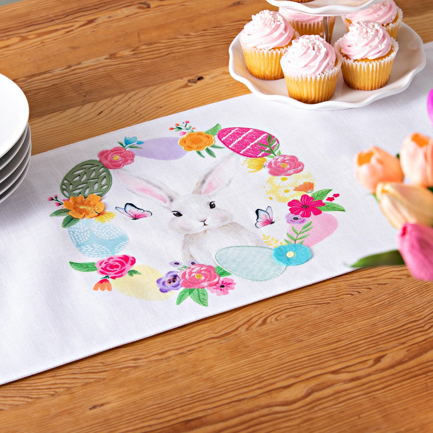 Gather the family and set the table for a wonderful Easter meal with this runner. It features an adorable bunny inside an Easter egg wreath. Each end has colorful Easter eggs with detailed designs. This piece adds an extra dash of pizzazz to any delicious spread. Bring it out for Easter or for the entire season, either way, it’s sure to be the talk of the party.
