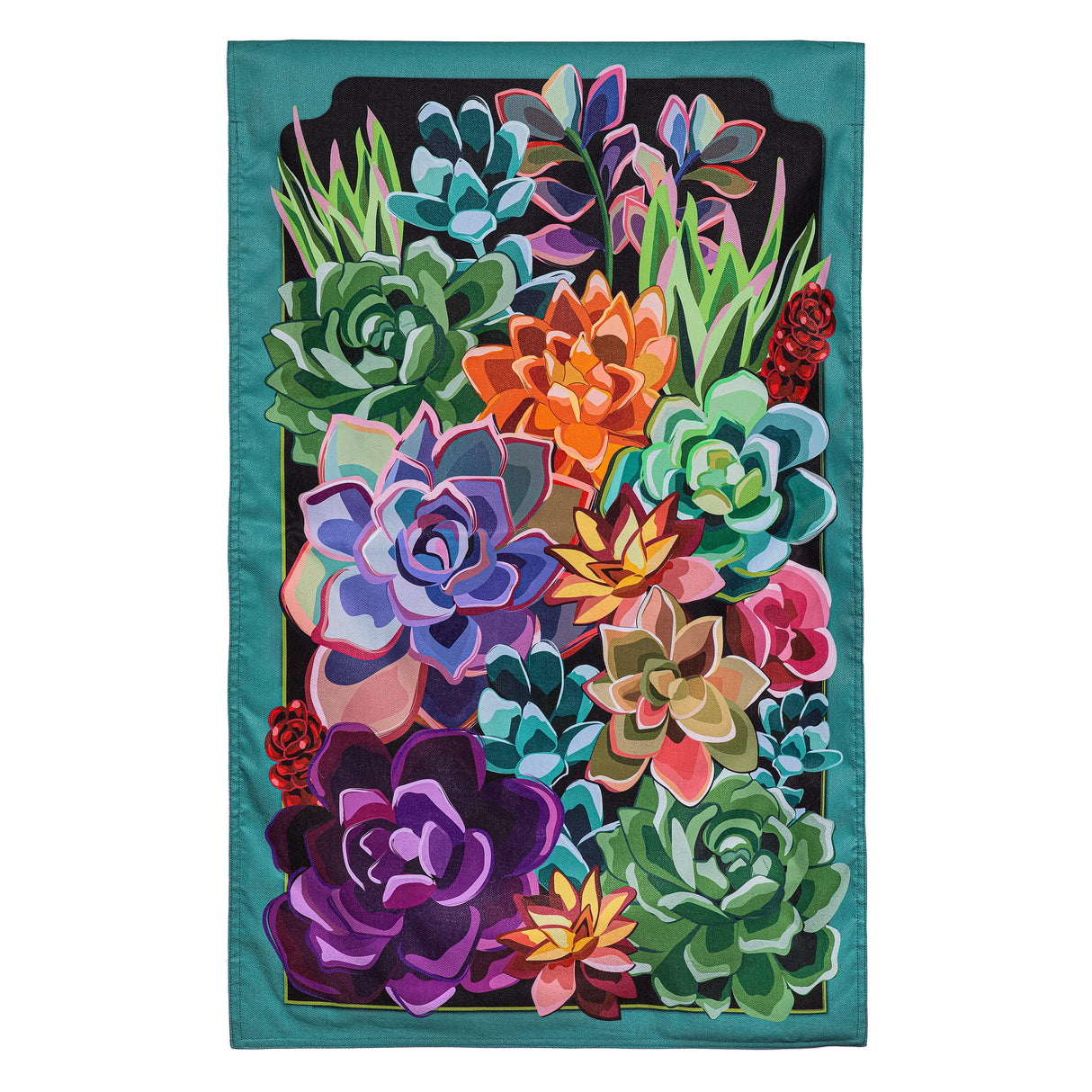 This eye-catching flag adds an extra special touch to any garden or outdoor space. With its adorable succulent design, this flag welcomes friends and family in beautiful style. It’s made of medium-weight, soft burlap fabric that's made from recycled plastic that has the look and feel of real burlap. Artwork is heat transferred onto both sides of the textured fabric to create a natural, crafted look. The flag is durable and weatherproof and will not fade or fray after continued display. This flag features a sleeve for use with any standard flagpole or stand, sold separately.