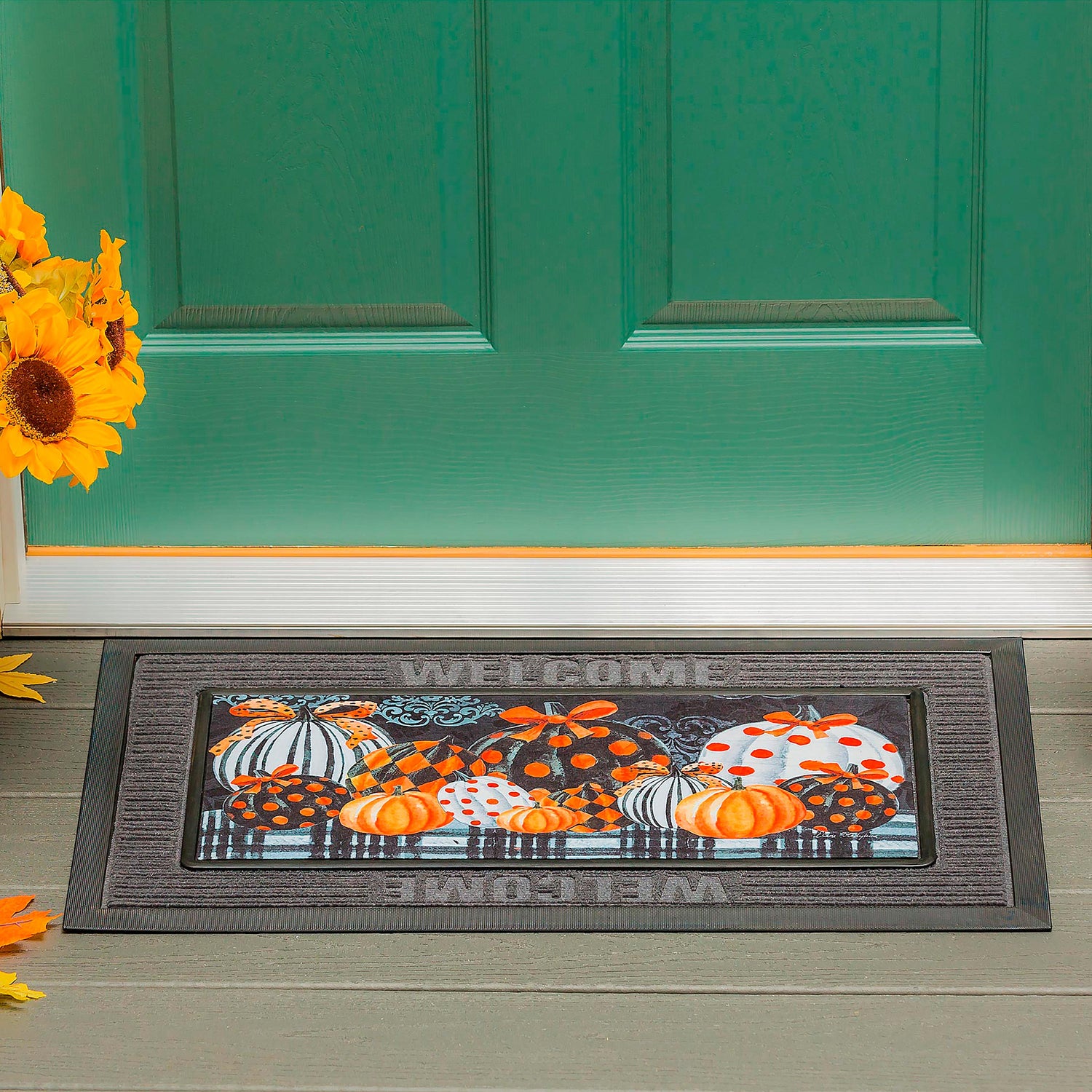 This Elegant Pattern Pumpkins Sassafras Switch Mat will make a sweet statement wherever it's displayed. Add a pop of color to your outdoor decor with this eccentric design that features unique patterns and a Halloween color palette. The durable insert is created for placement in a Sassafras mat frame or tray, sold separately. Swap mats seasonally to keep things fresh and fun. The charming design is heat sublimated onto the polyester and rubber insert. Suitable for indoor and outdoor use, the floor mat can also be used on its own as a stair tread or small floor mat. It is mildew resistant and features an anti-slip backing. Spot clean with soap and warm water or hose down. For best results, display your mat in a covered or sheltered area to prevent fading.