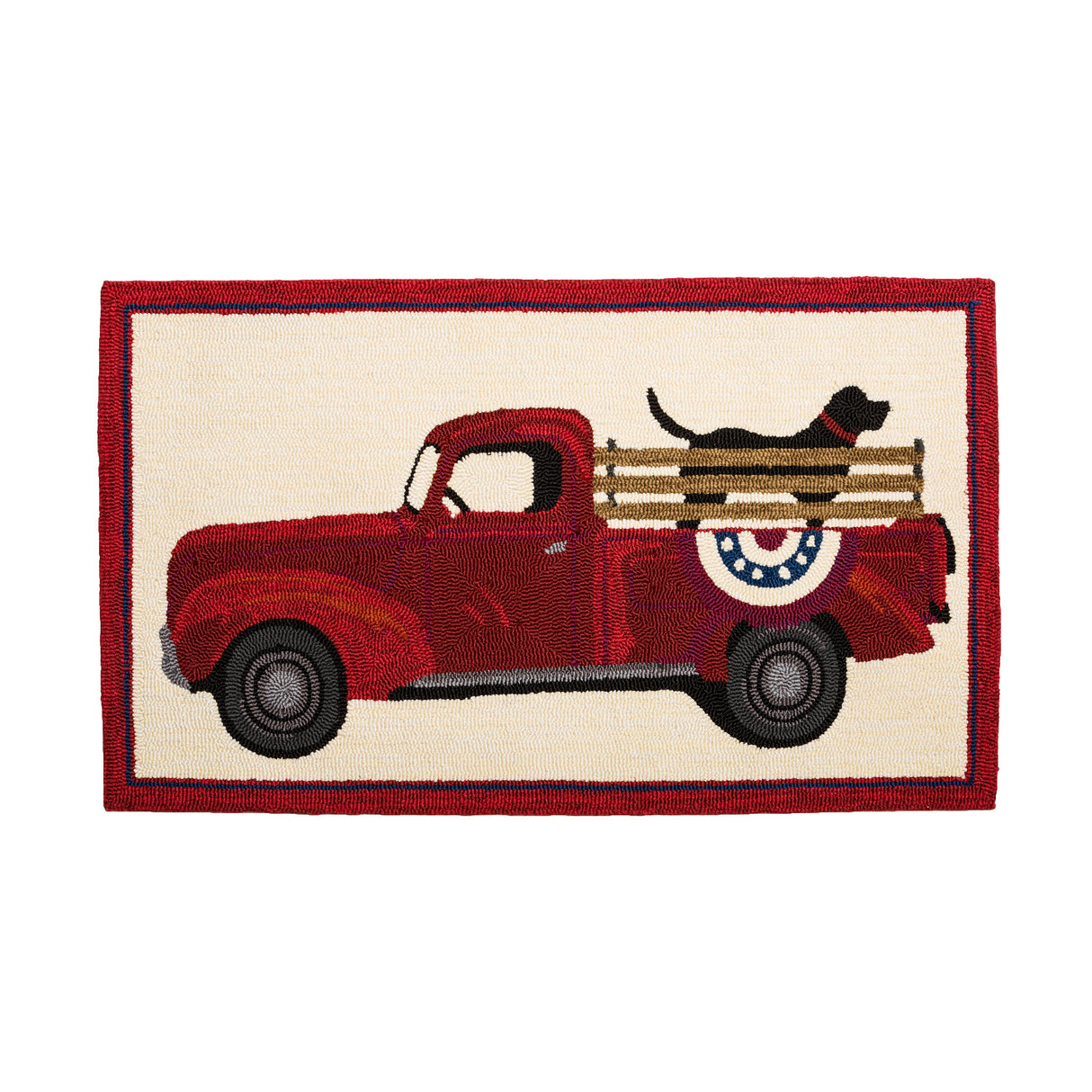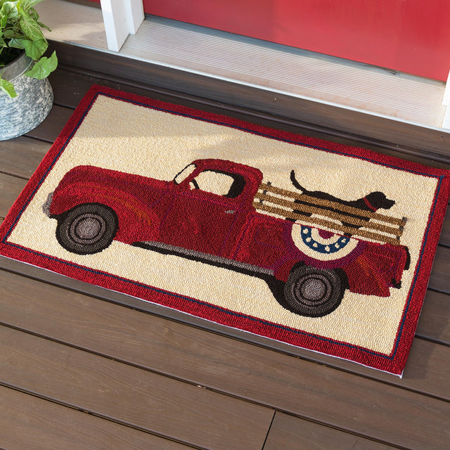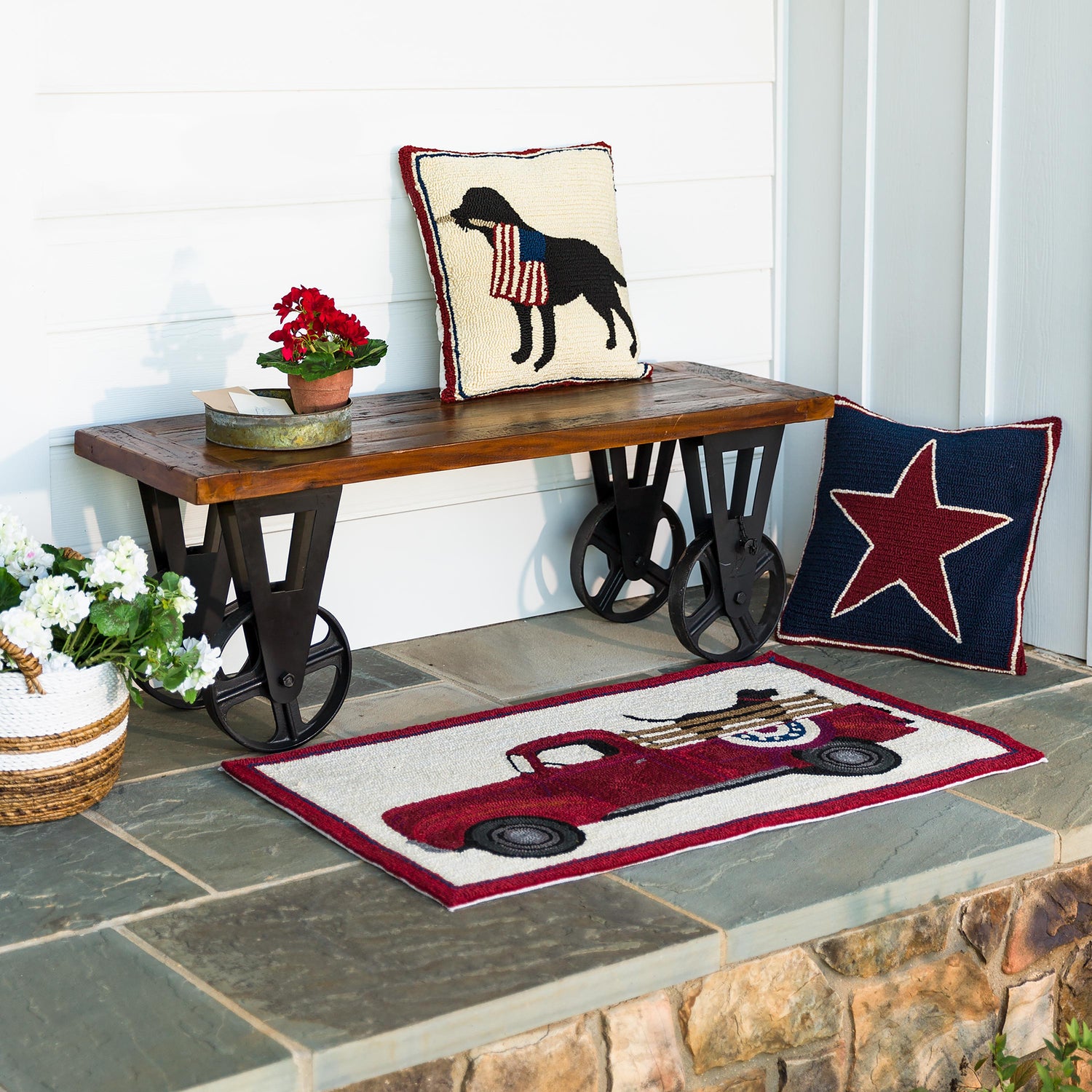 Our Patriotic Pooch Accent Rug adds Americana style to your home indoors or out. The nostalgic image of a Black Lab riding in the back of a vintage truck complete with flag bunting is a wonderful way to decorate for American holidays or any day.