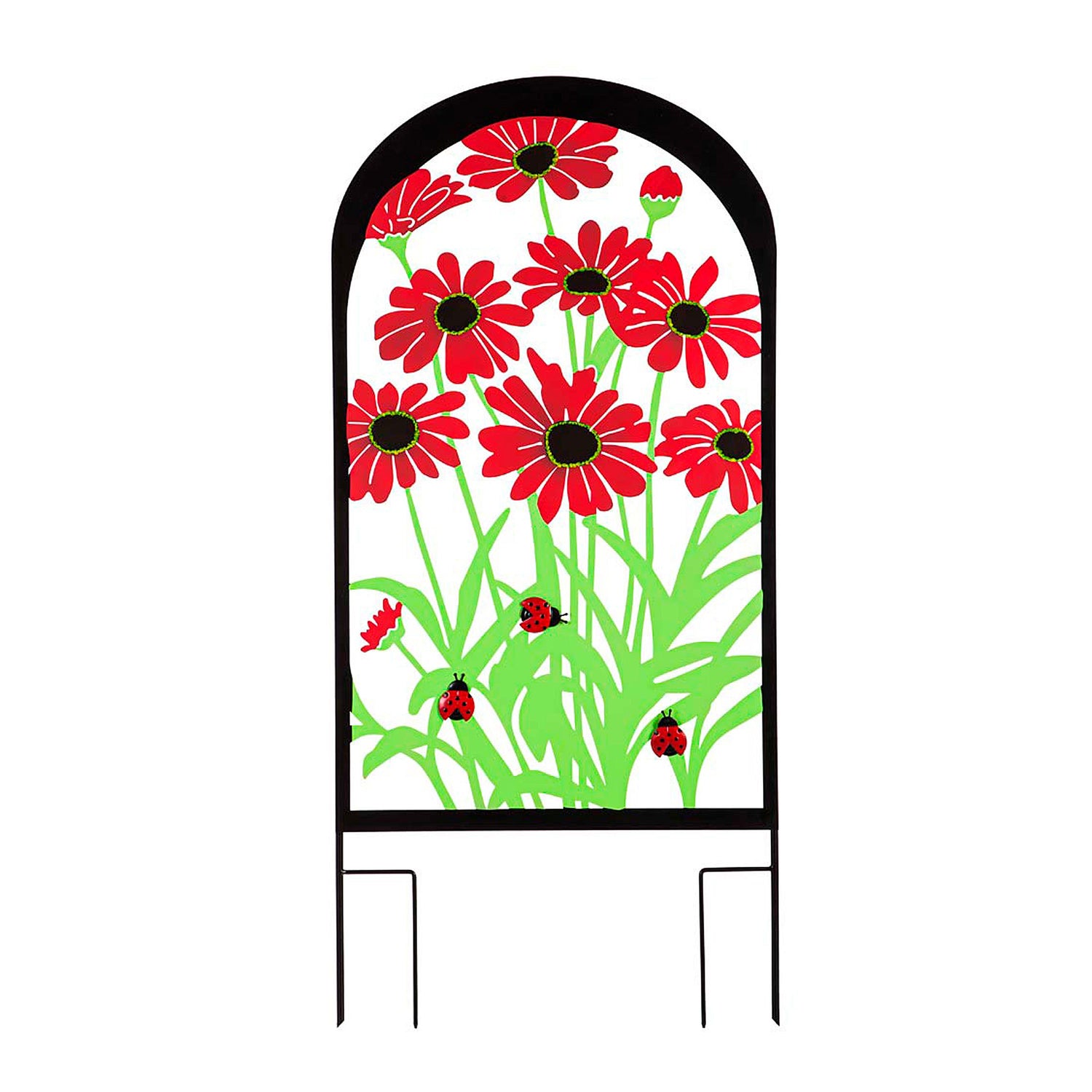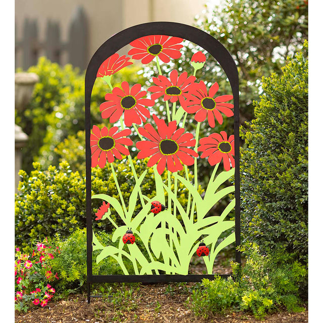Our Laser-Cut Metal Flower Garden Trellis adds instant color and flair to your lawn and landscape. The bright, cheerful design shows vibrant red flowers. You’ll find so many ways to enjoy this garden trellis. Fill in a bare spot, hide a utility item, add color after blooming season is over or decorate along a path. Finely detailed and brightly painted, this accent simply stakes into the ground for an instant update. Easy, fast and fun! Makes a great gift for any occasion from birthday to Mother's Day for any reason.