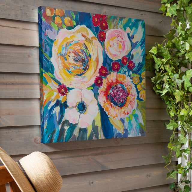 Transform any space into a a beautiful oasis with this outdoor canvas that breathes new life into the home. Featuring enchanting flowers blooming in a bouquet, this art piece adds warmth and charm to any room. Crafted with vivid colors and attention to detail, our wall canvases are perfect for creating a serene ambiance that lasts throughout the year. Whether hung up in the living room, study, or on the patio, this piece elevates any space.