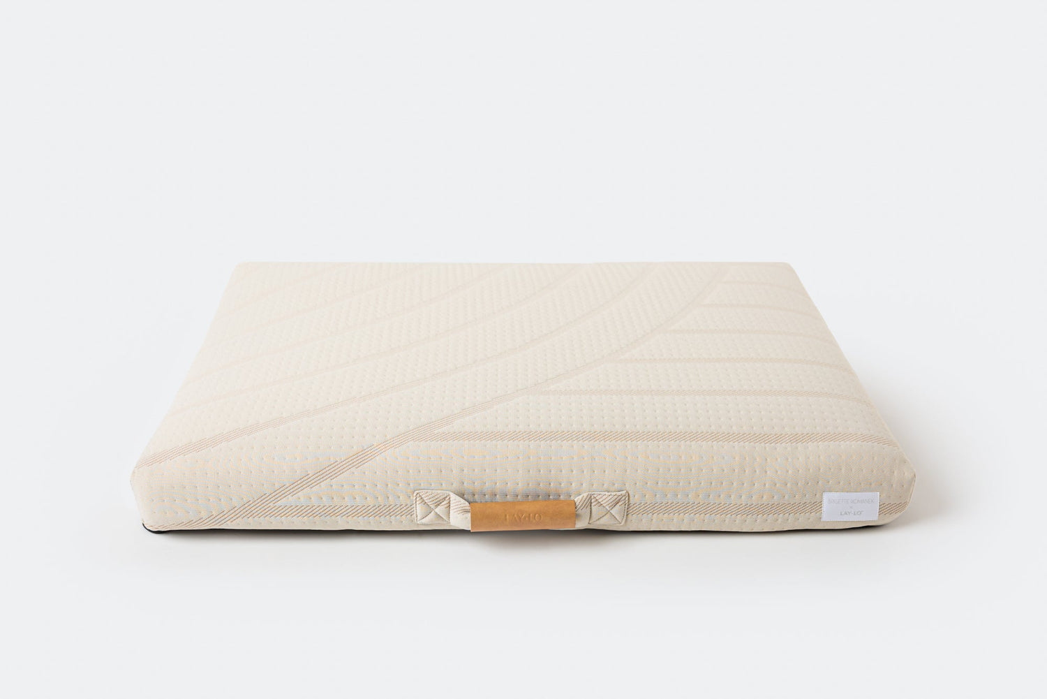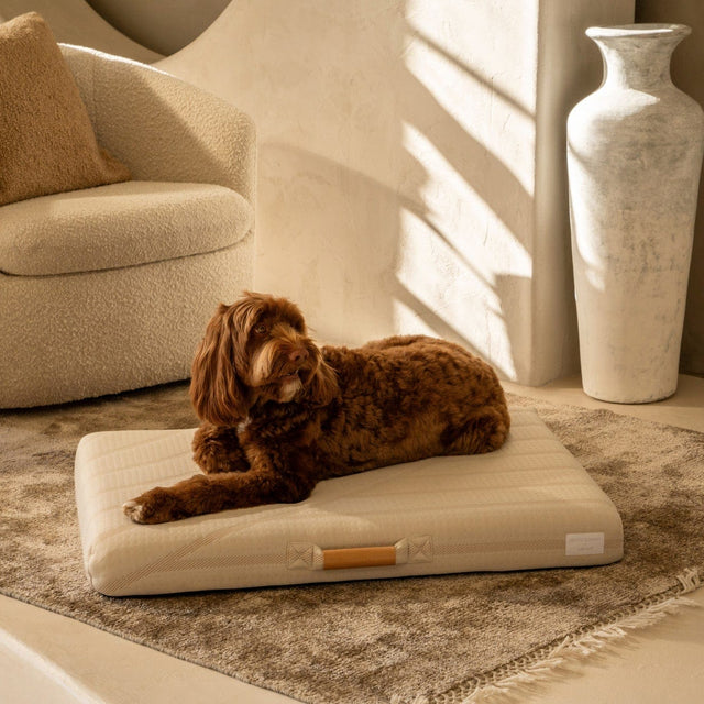 Beautiful, neutral, and ready for the perfect snuggle, this luxury cream dog bed will become your dog’s favorite place in the home. If the unique pattern inspired by geometric, curved forms wasn’t enough, we created it with a durable yarn that is made from recycled plastic that is both soft to the touch but strong enough for your pup. Form truly meets function when paired with our water-resistant, memory foam orthopedic mattress and thoughtful details such as non-slip base and vegan-leather accent handle.