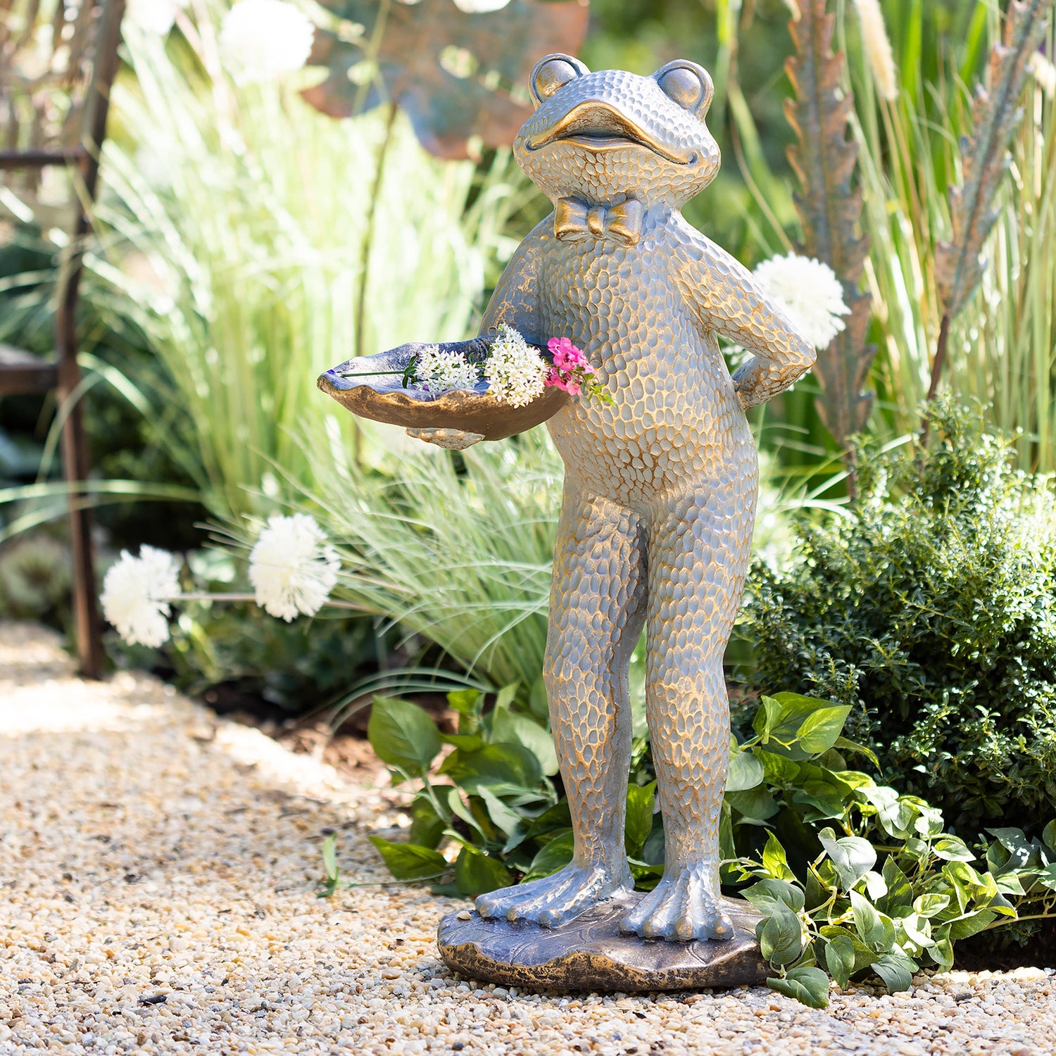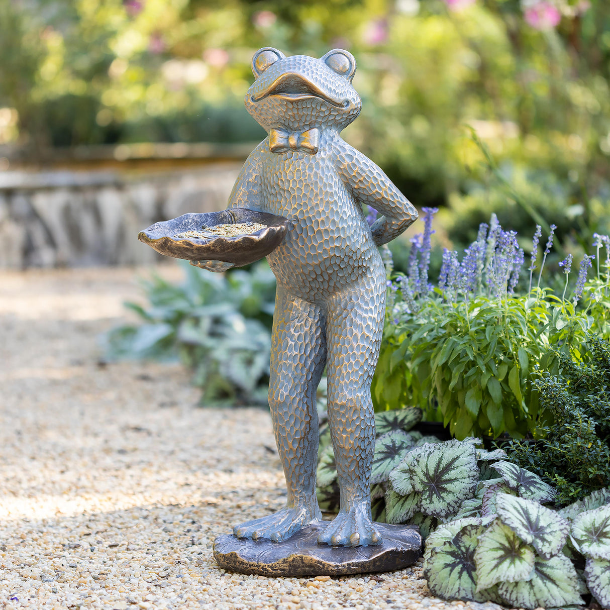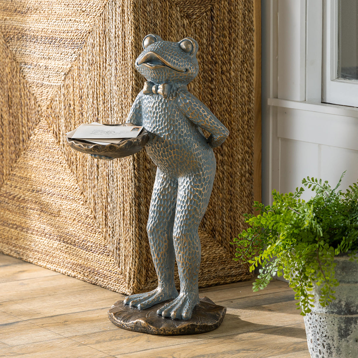 Our dapper butler frog is ready to wait on you, hand and foot. He features a bronzed antique blue finish and a charming bowtie. Our Charming Butler Frog Garden Statue is not only adorable--he is highly functional. He stands on one lily pad while holding a second one out, ready for you to fill it with trinkets, keys, or birdseed. Frog is sturdy and durable, and you can rest assured he will stand up to the elements, even if you display him outside. He looks great on a patio, porch, or in your garden, or bring him indoors for a perfect place to hold small items such as keys or other gadgets. At over two feet tall, Mr. Frog is a perfect statement piece for your home or garden.