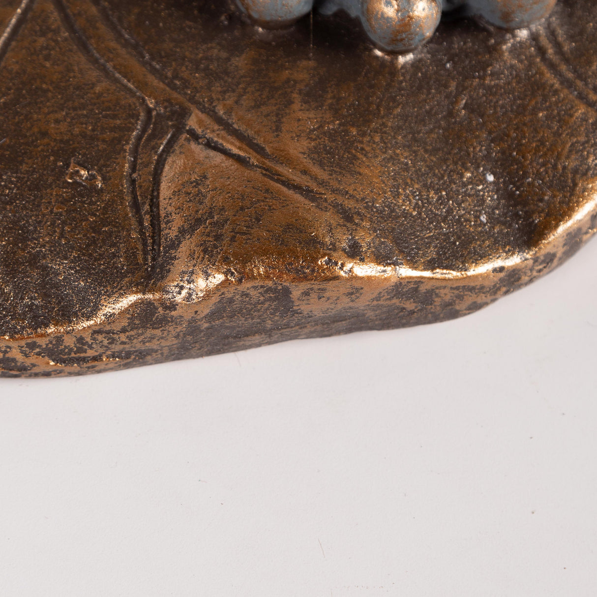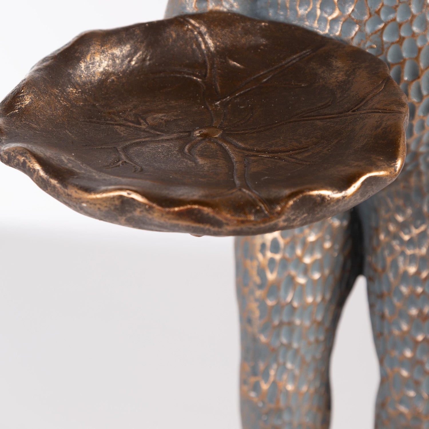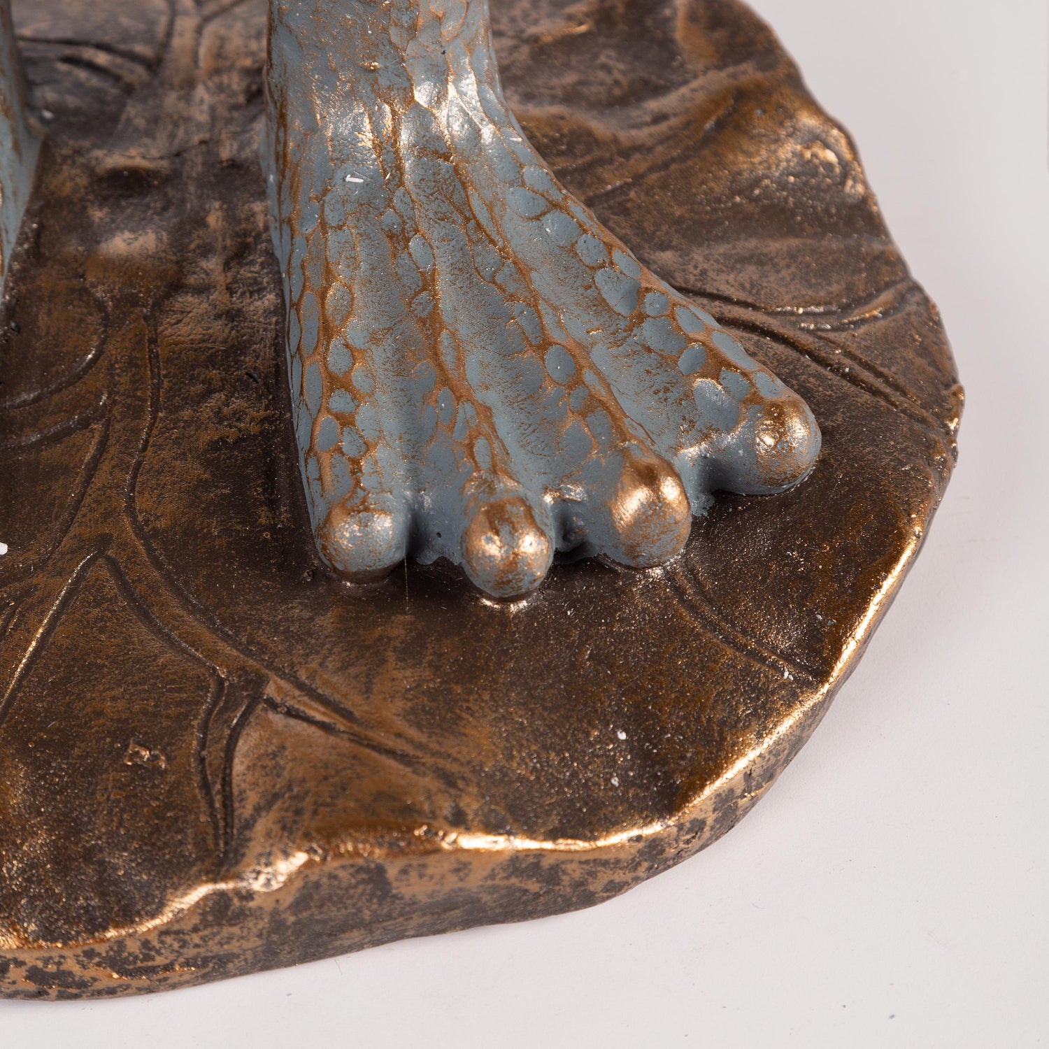 - Frog statue features a bronzed antique blue finish