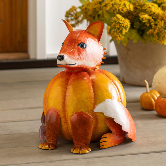 Absolutely delightful and alive with so much fall charm, our metal Fox Pumpkin Statue is an artisan-made treasure you'll love displaying all season long. The statue features a beautifully crafted and hand-painted fox with a plump pumpkin for his body. A long curling tail and perky ears make this woodland creature a statue that is sure to get many compliments, whether you display it on a tabletop, porch steps, or any other favorite spot.