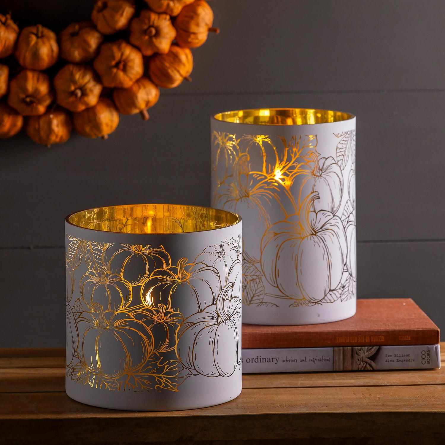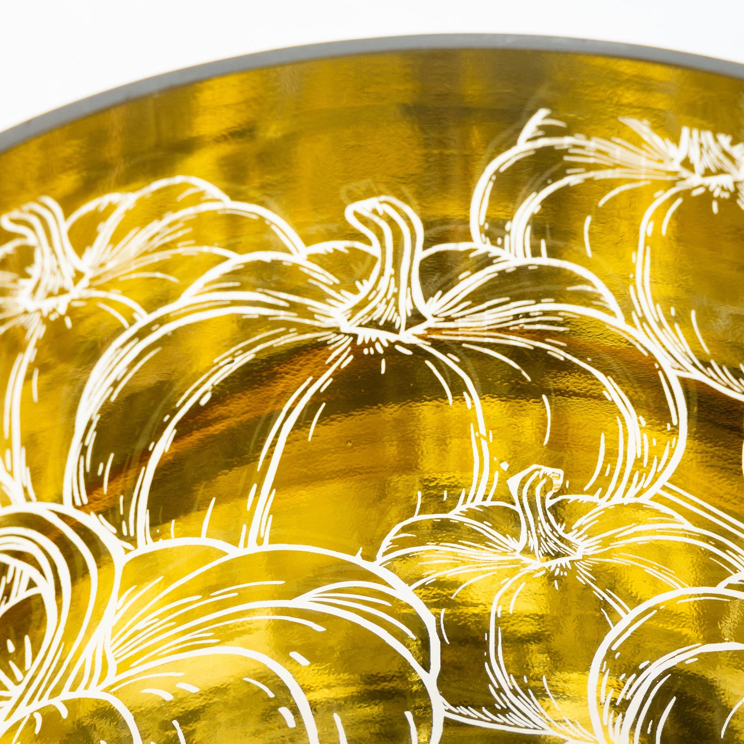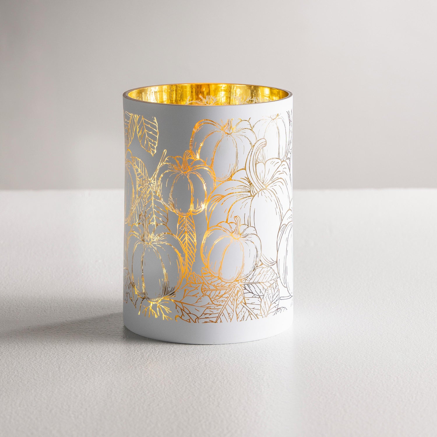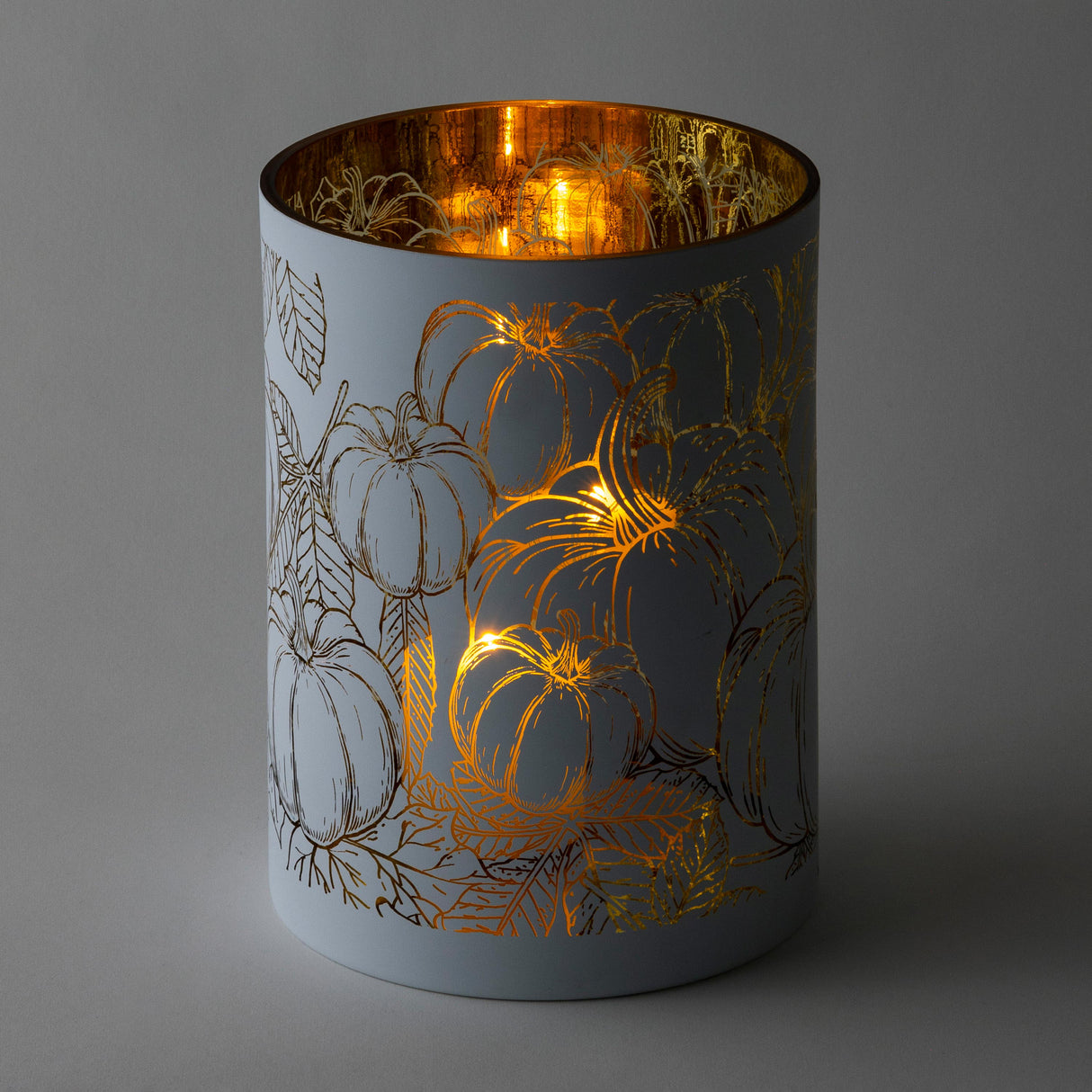 With a candle or string lights placed inside, this laser-etched pumpkin hurricane bestows a shimmering, luminous glow from the gold finish within.