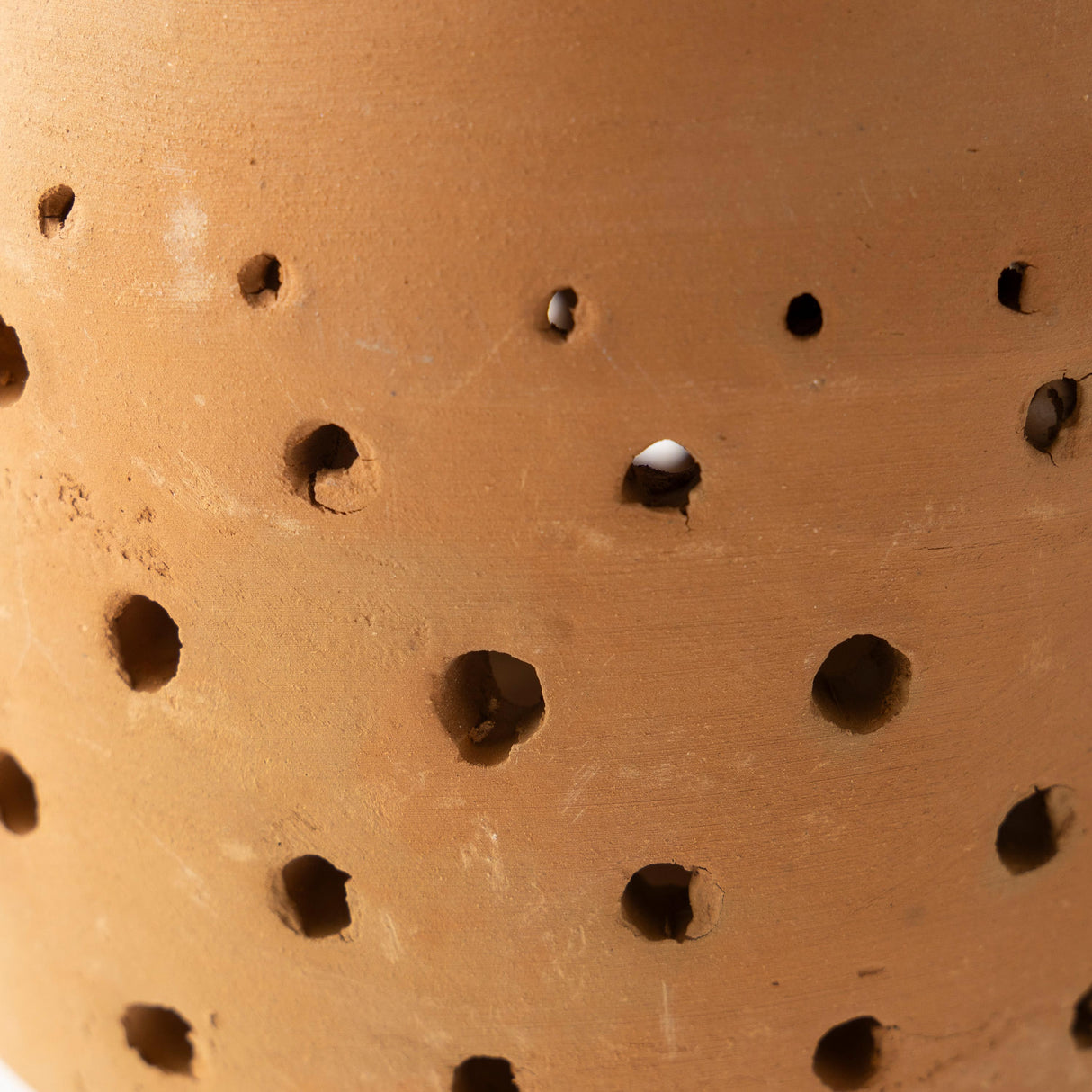 Illuminate your space with the warmth and charm of our Cut-Out Dots Clay Lantern. Crafted from terracotta, this lantern features intricate cut-out patterns, allowing candlelight to shine through in captivating patterns. Designed to hold votives or tealights, it sets your environment aglow with soft, ambient light.
