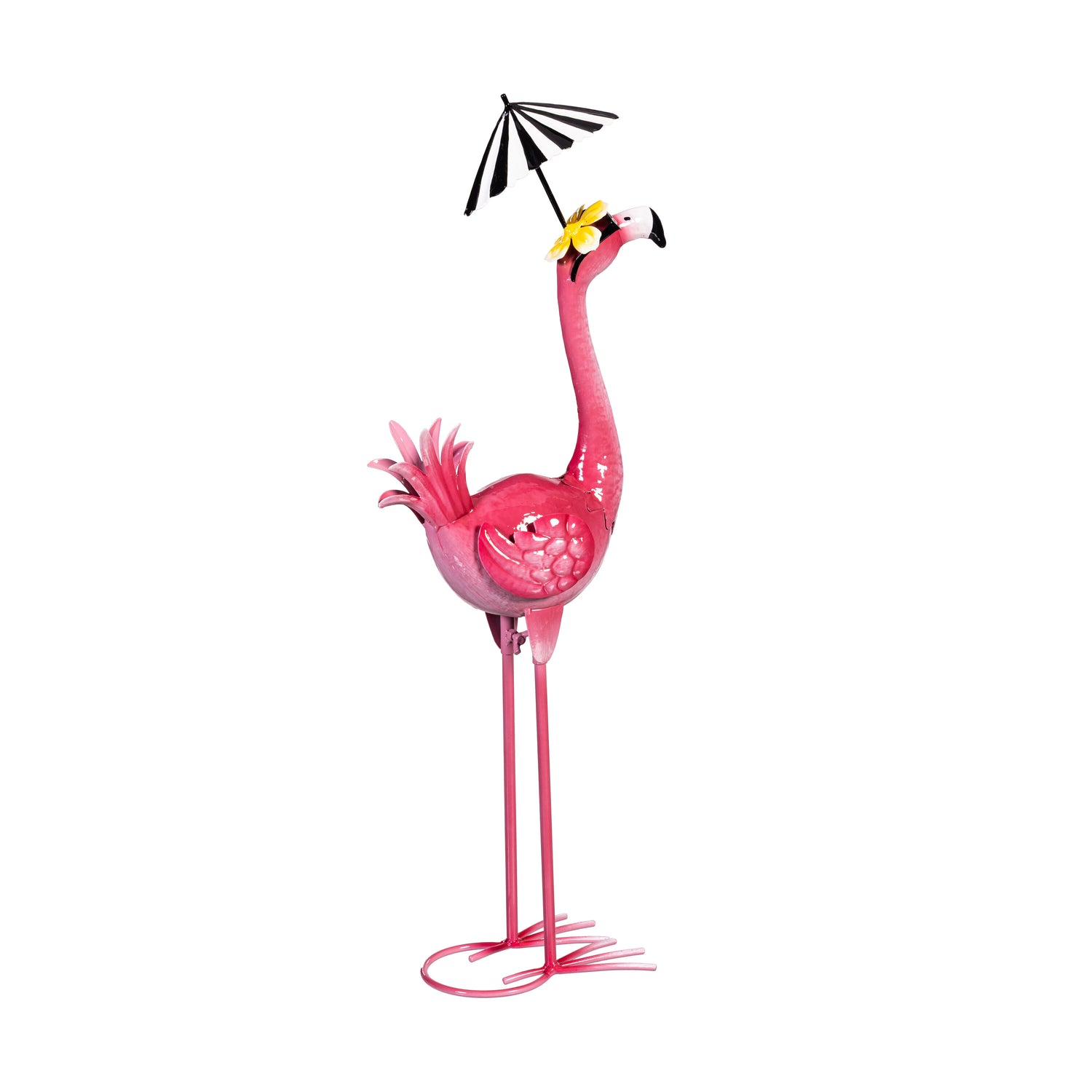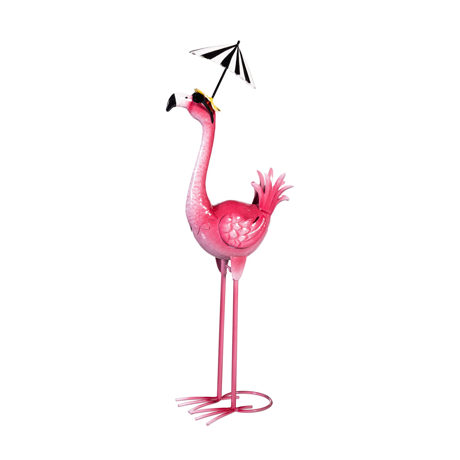 Palm Beach Garden Statue, Metal Flamingo Garden Statue with Black Stripe Umbrella, 25"H